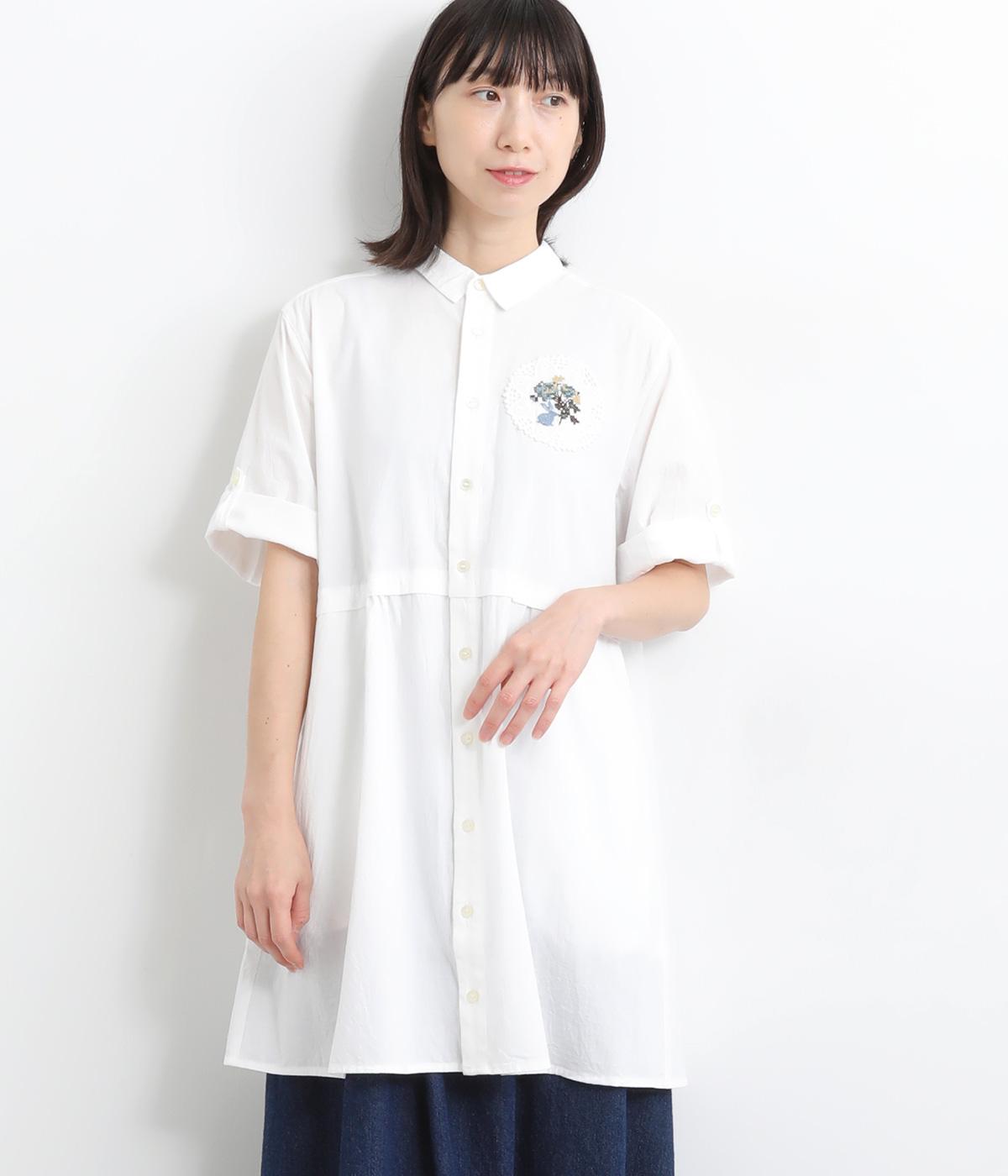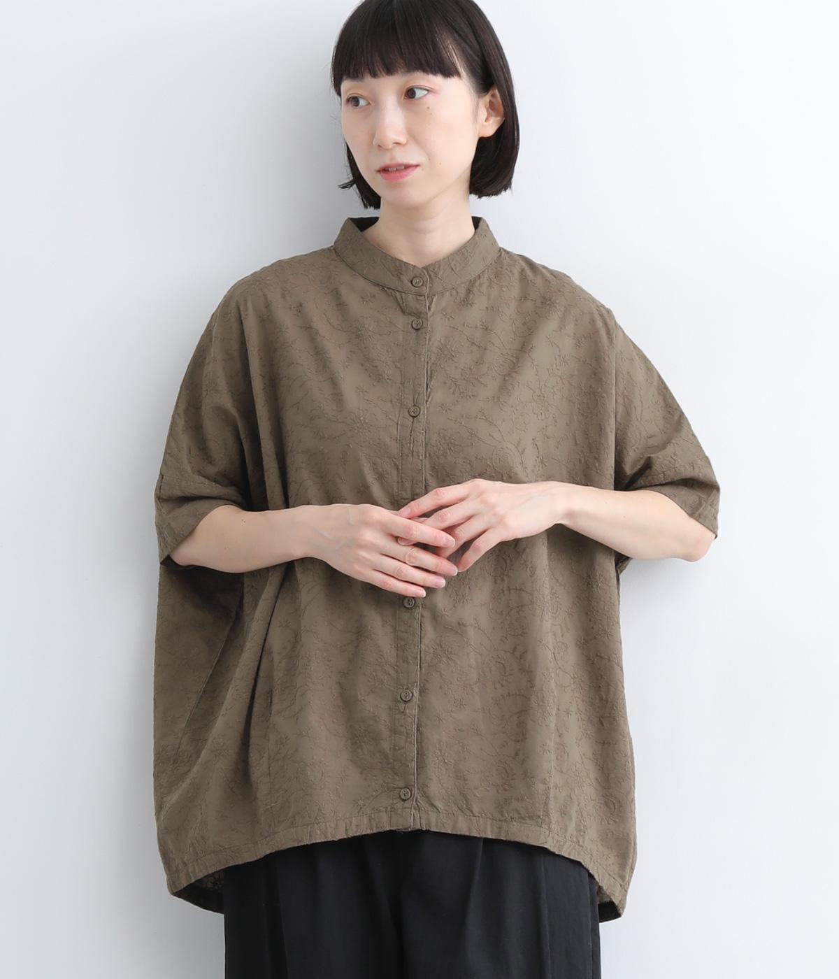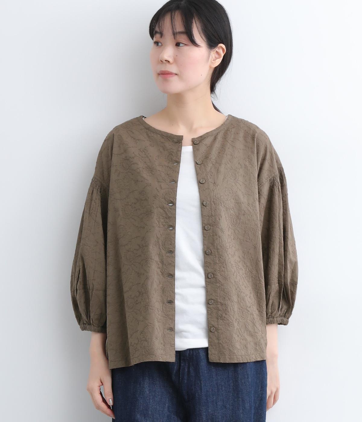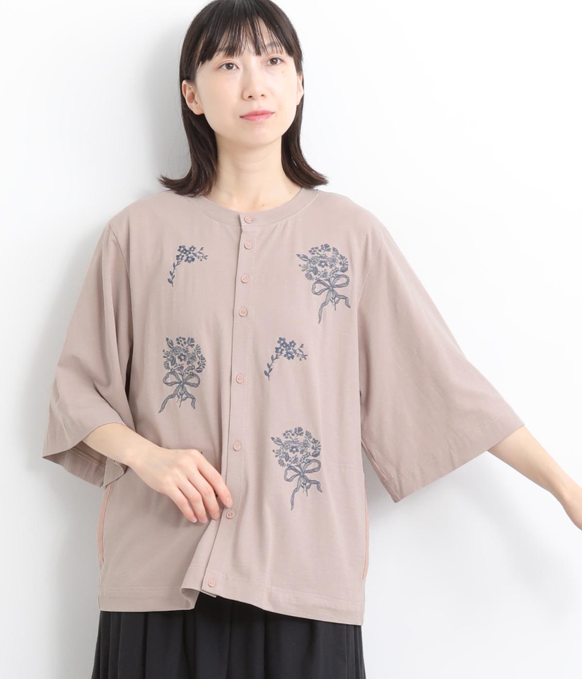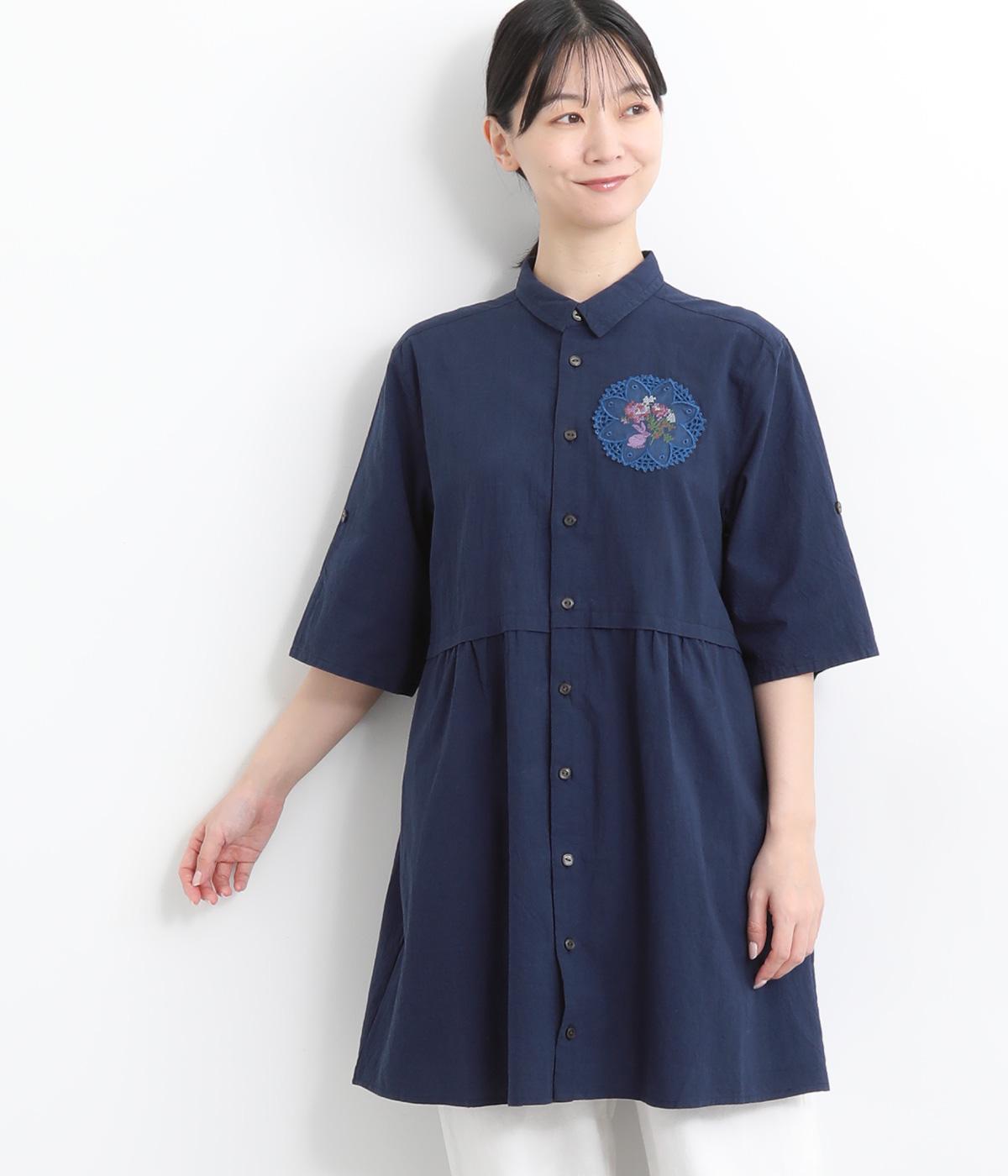 コットンビエラ先染めシャンブレービッグポピーブーケ刺繍チュニックブラウスブラウン