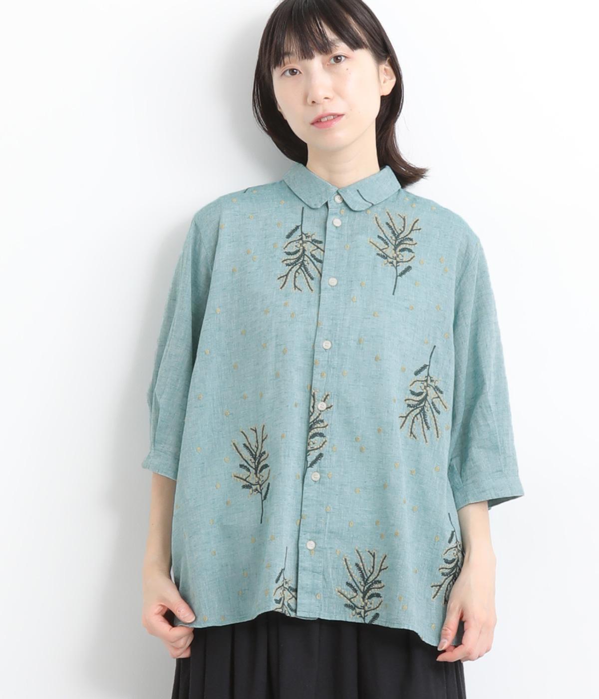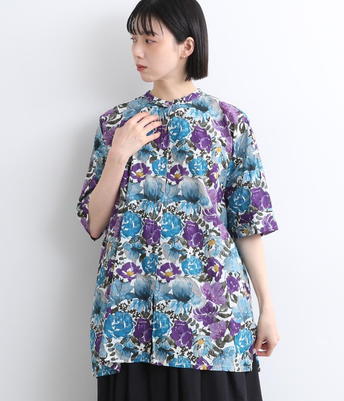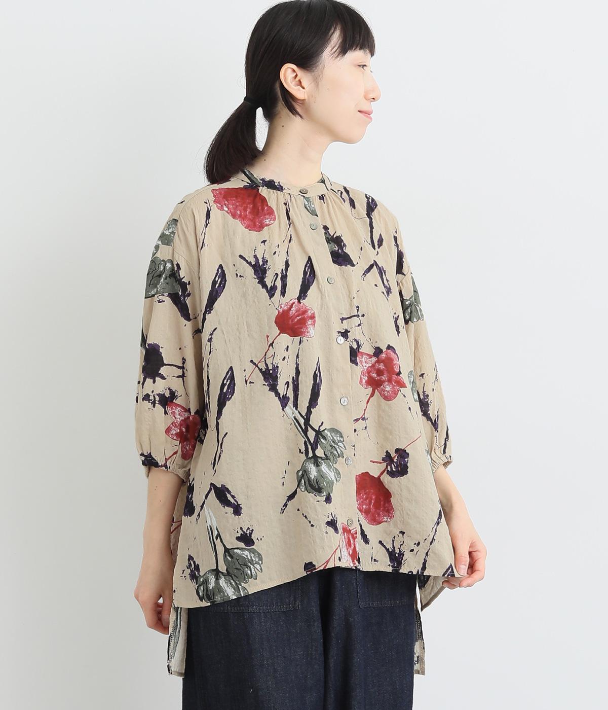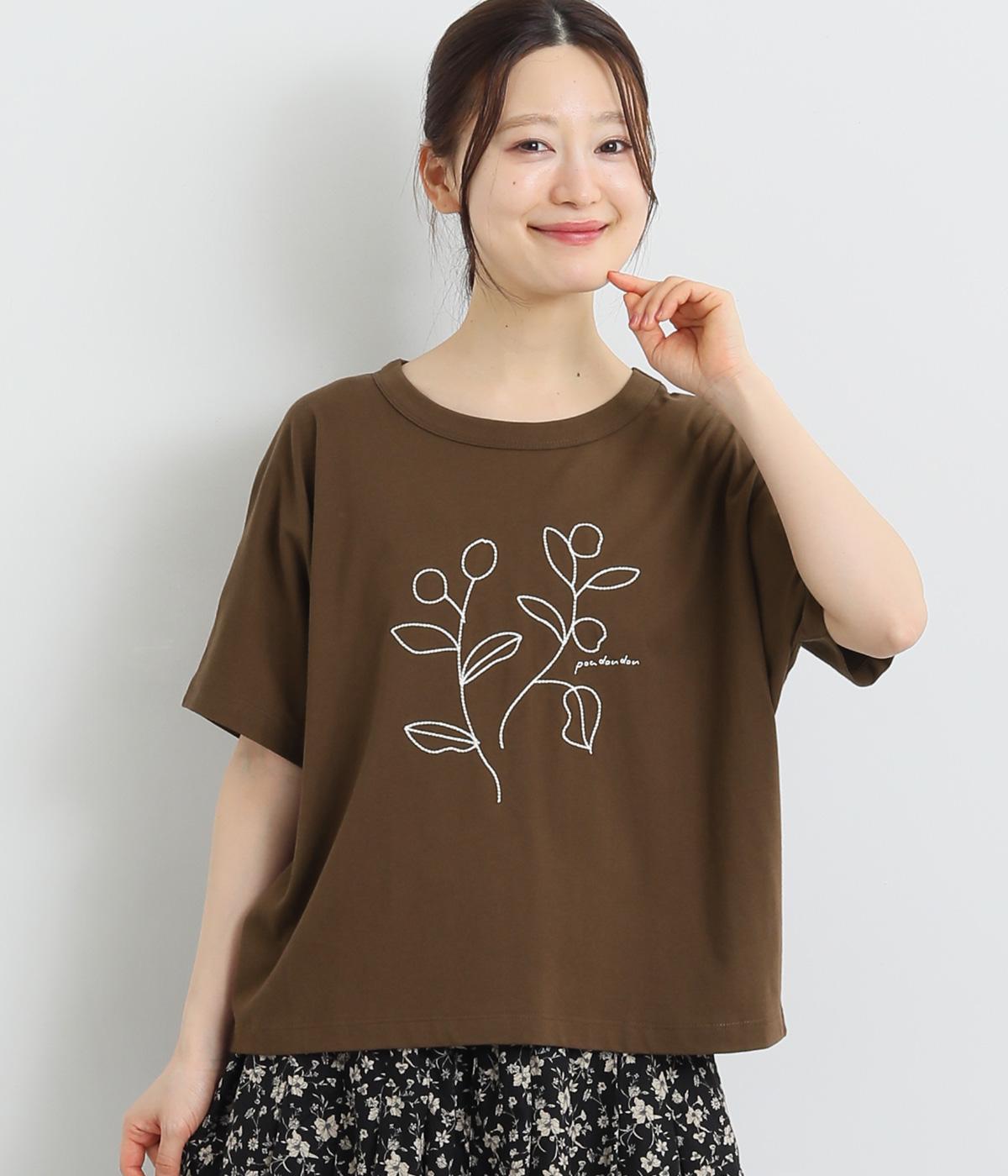 コットンビエラ先染めシャンブレービッグポピーブーケ刺繍チュニックブラウスブラウン