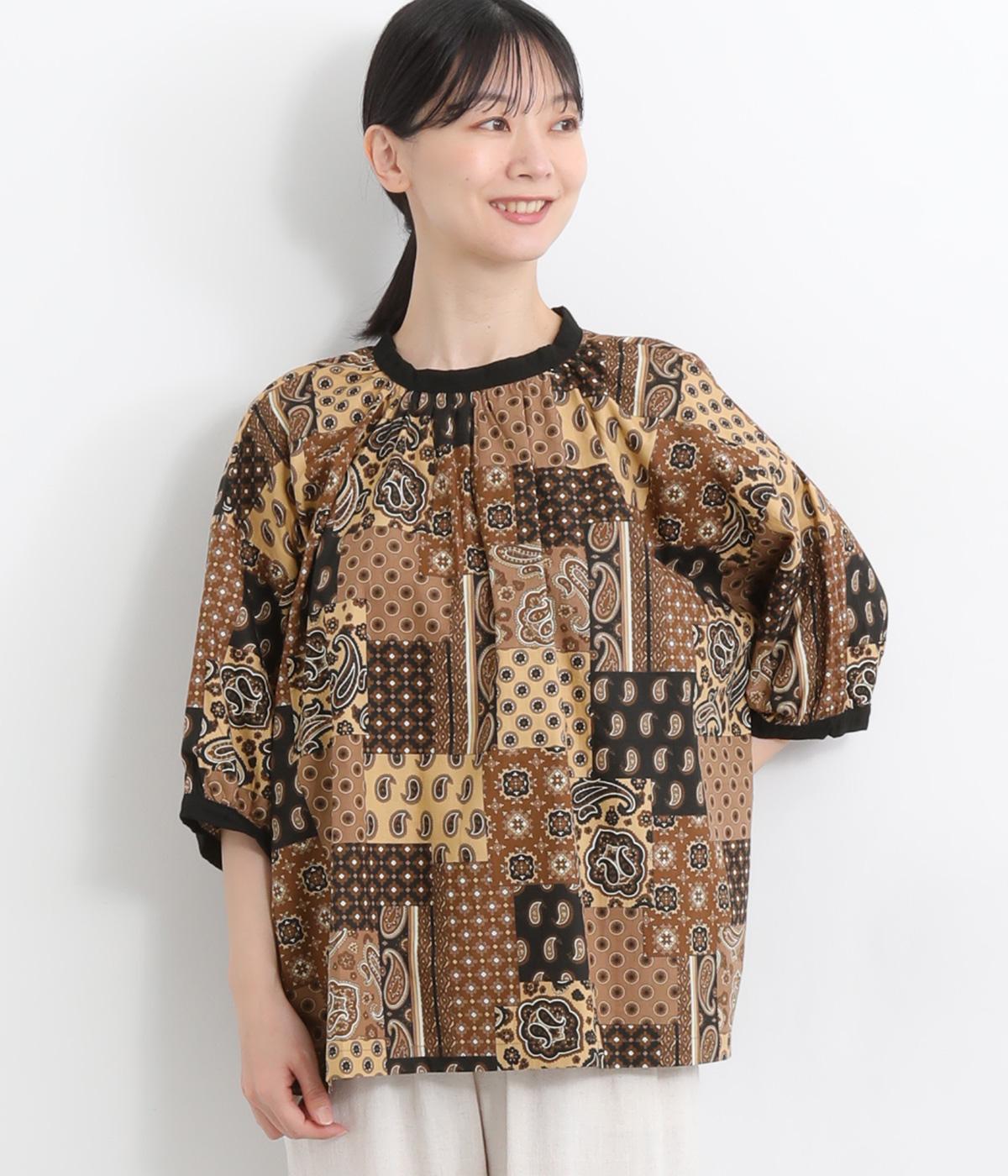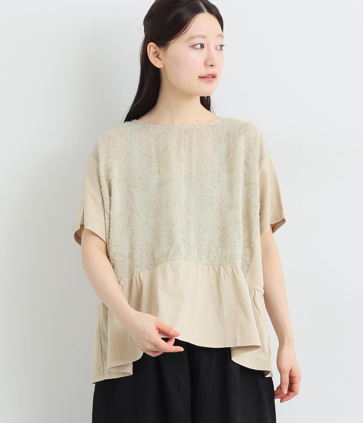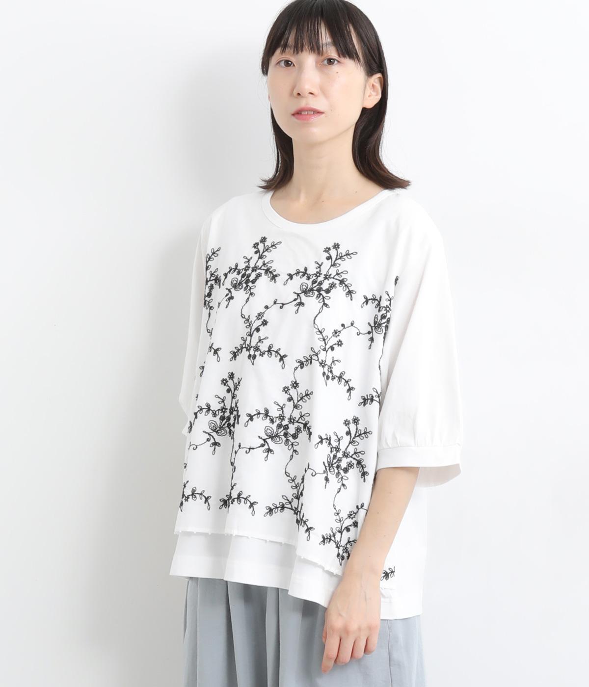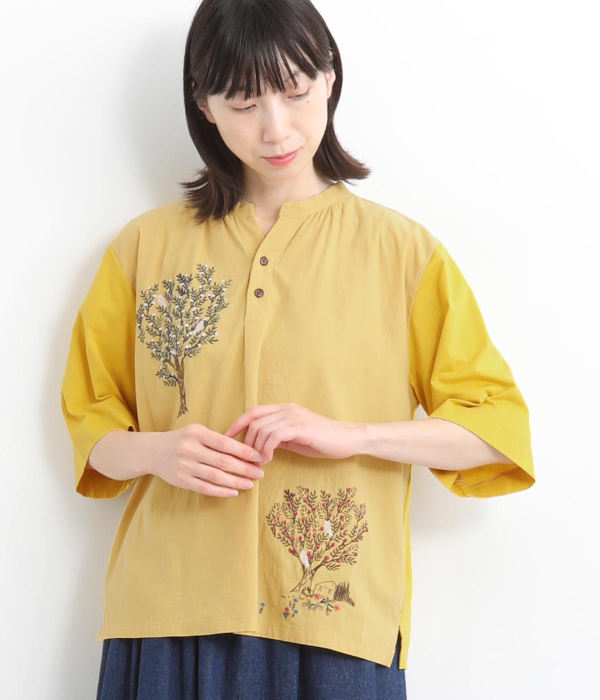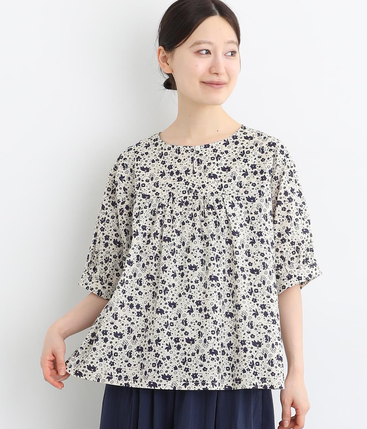 コットンビエラ先染めシャンブレービッグポピーブーケ刺繍チュニックブラウスブラウン