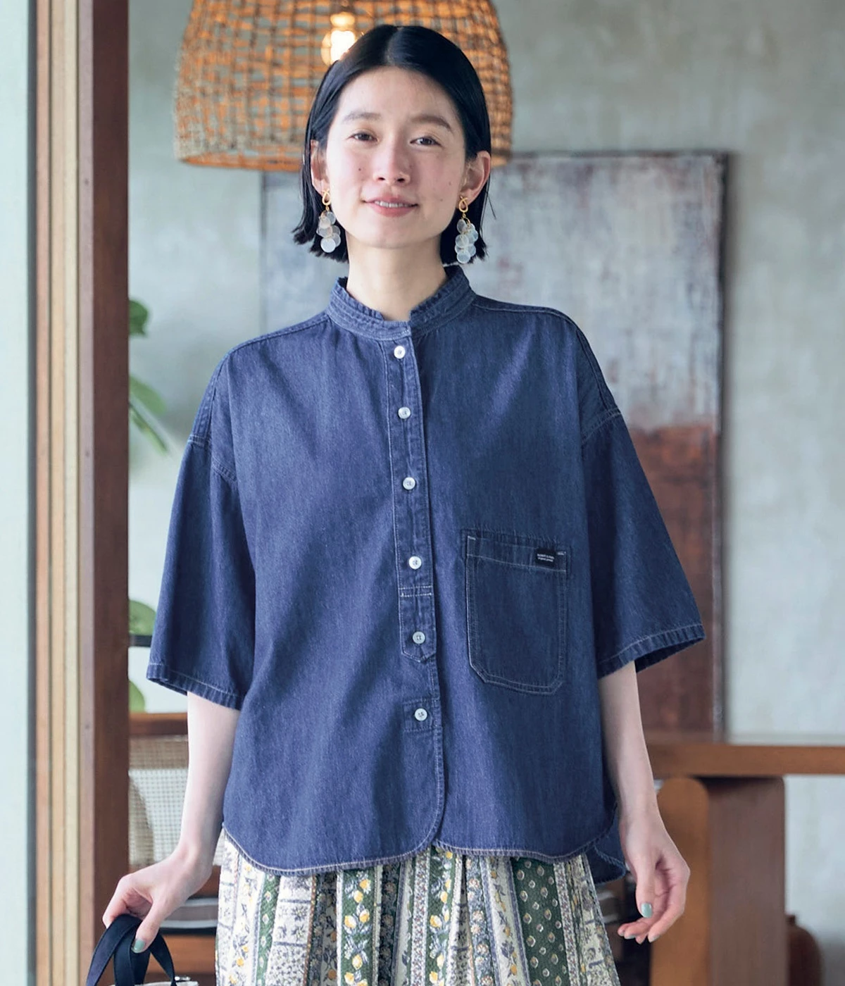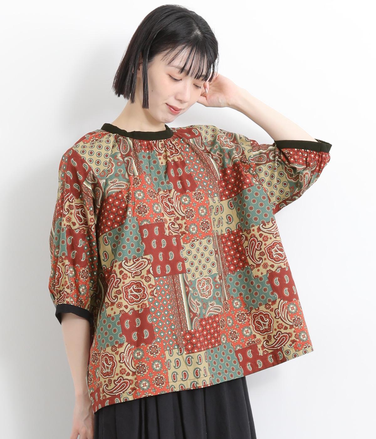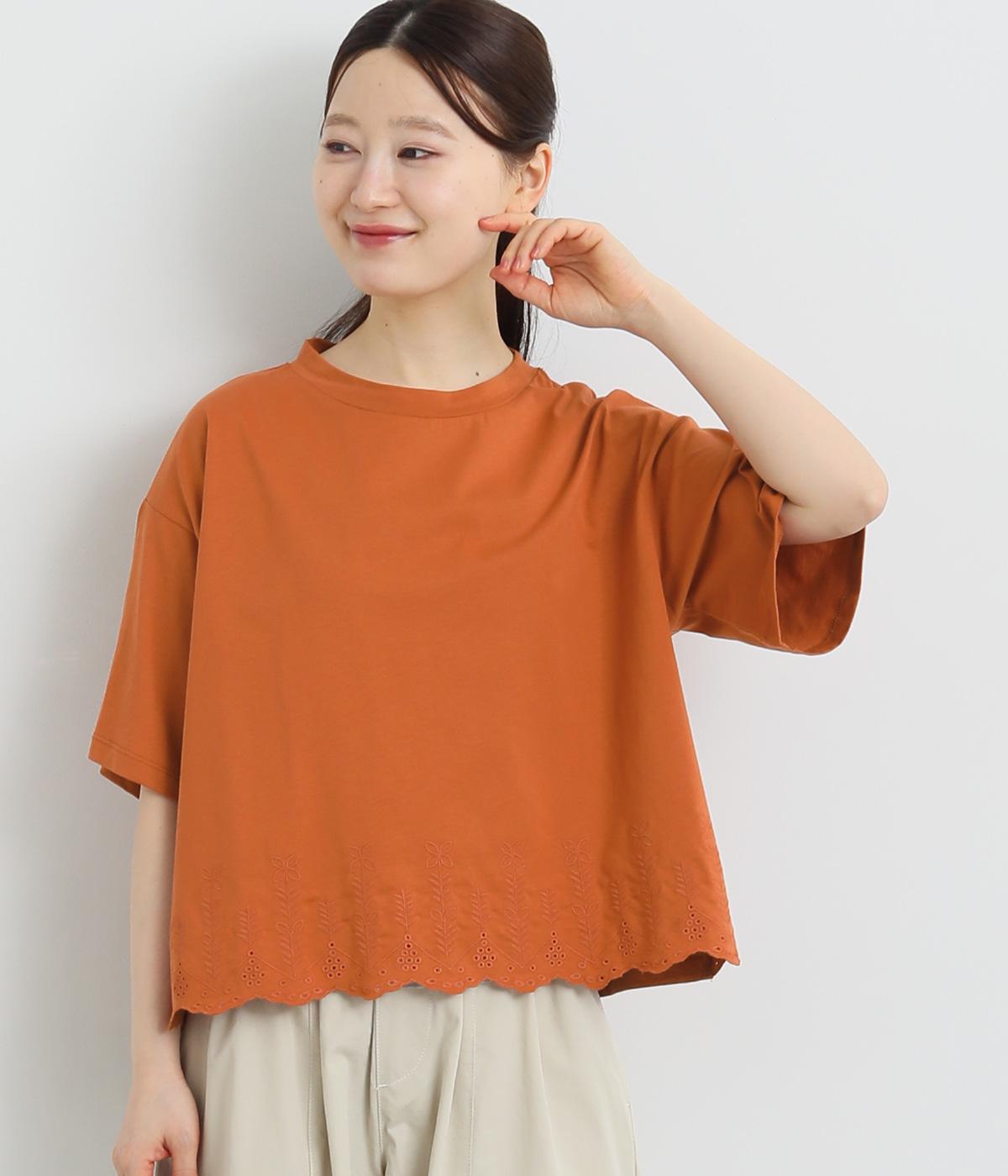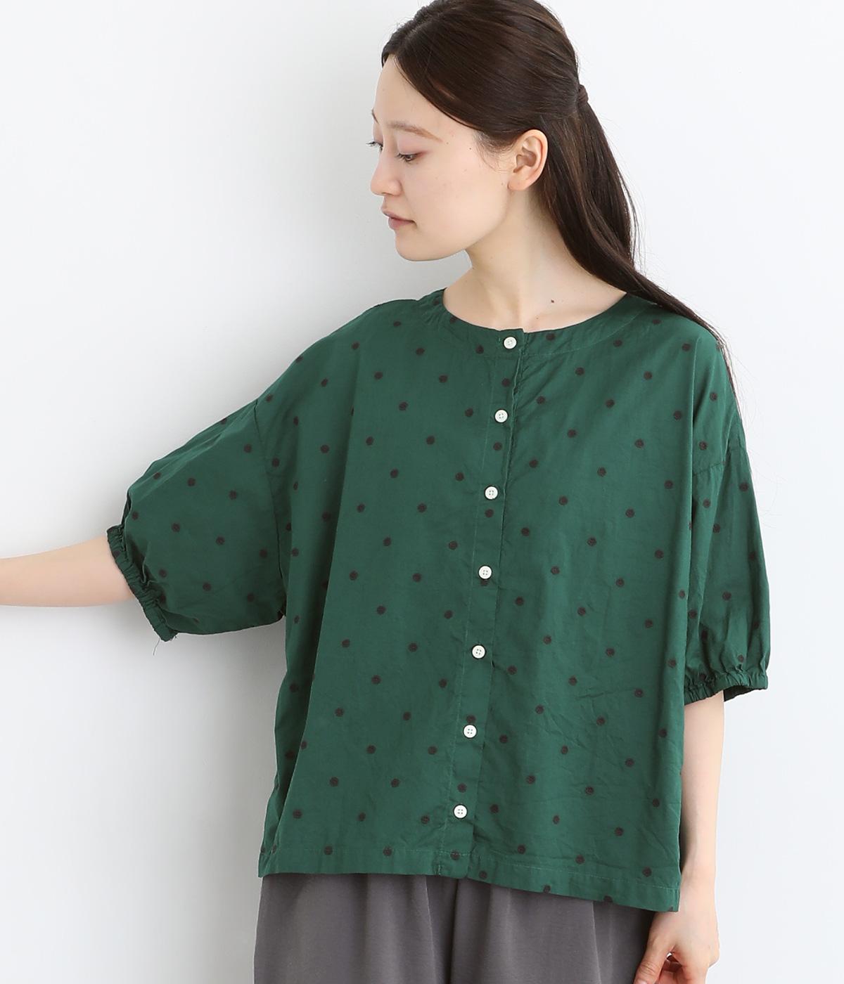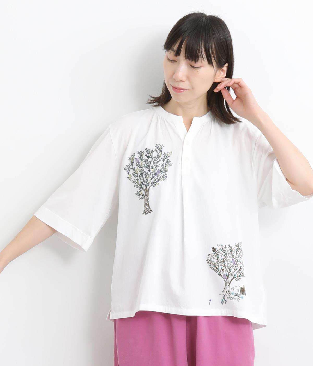 コットンビエラ先染めシャンブレービッグポピーブーケ刺繍チュニックブラウスブラウン