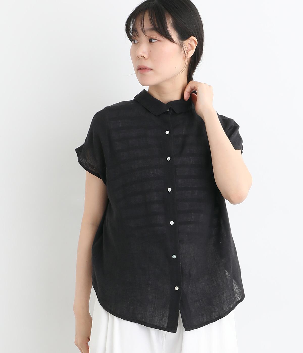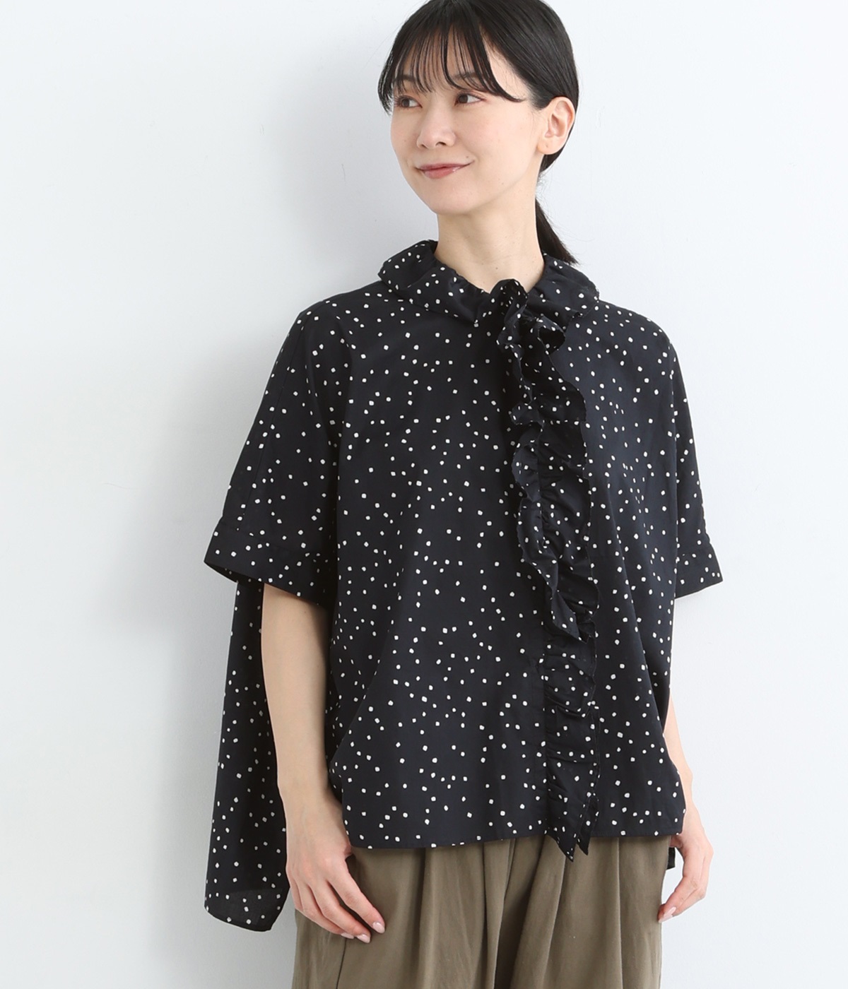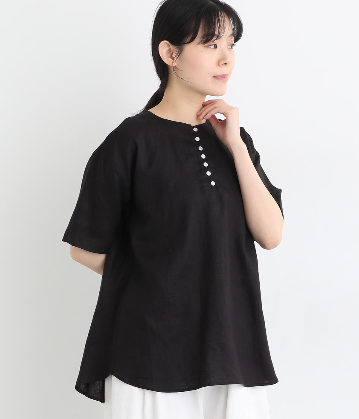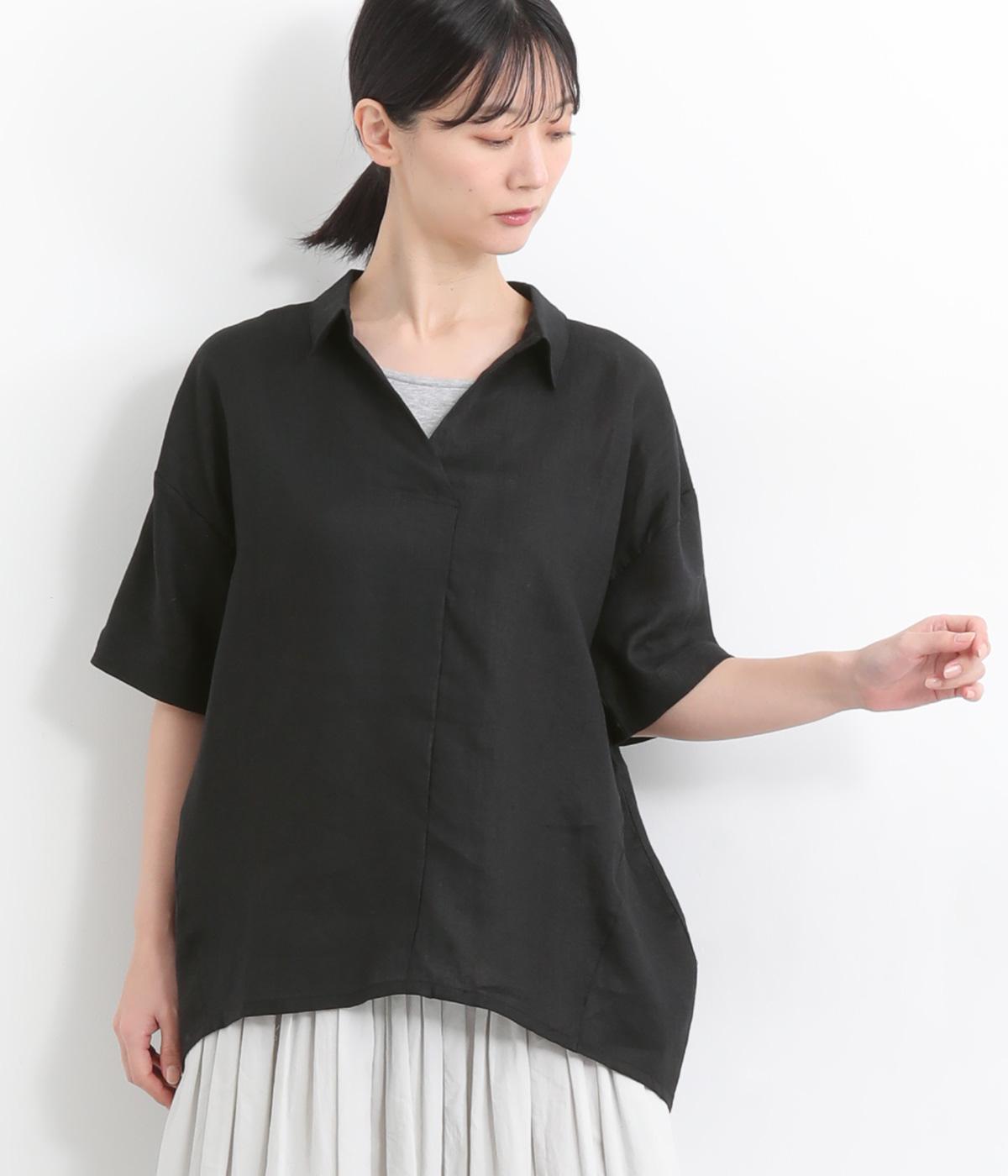 コットンリネンフリルネックブラウスブラック