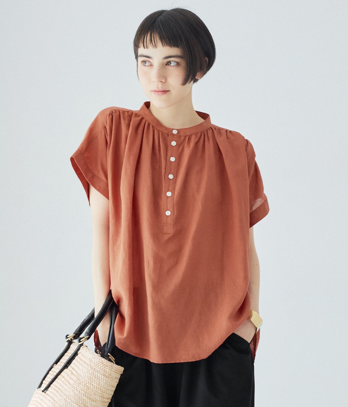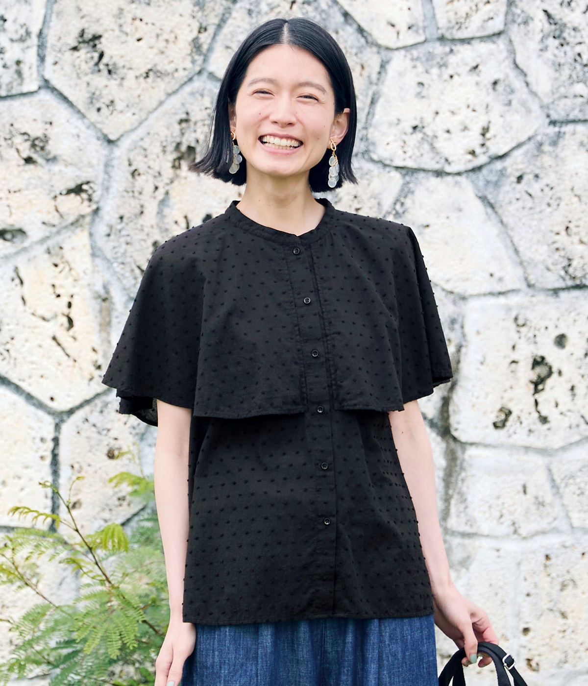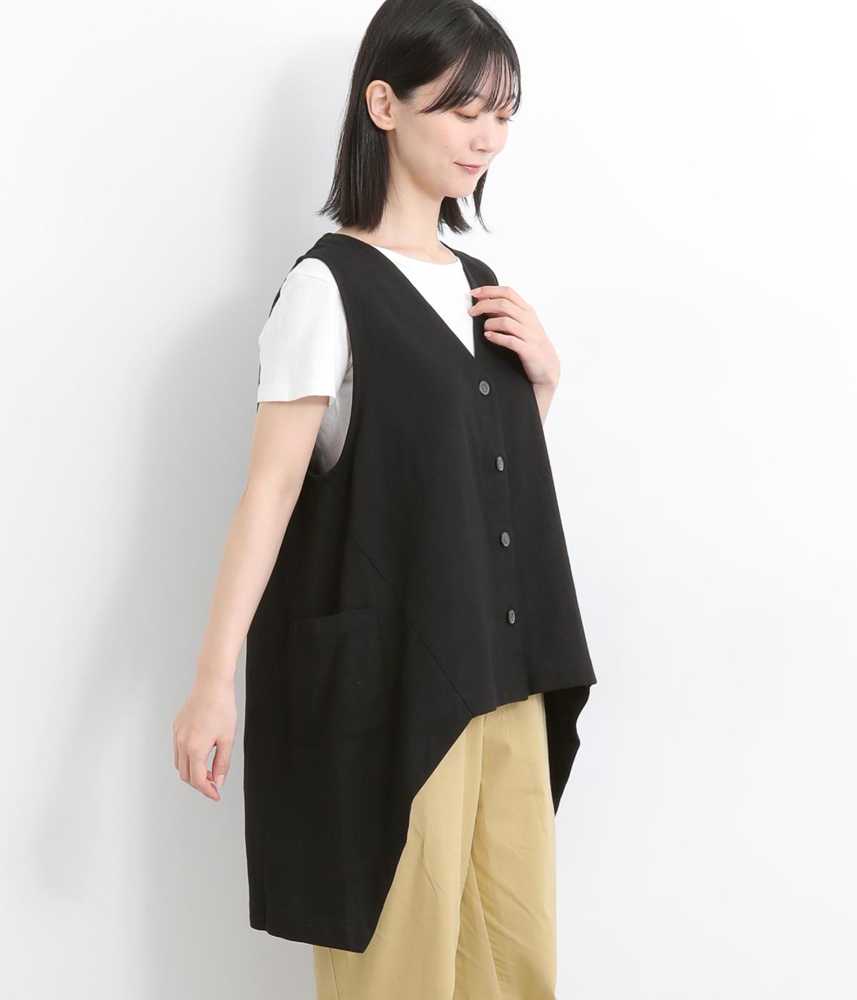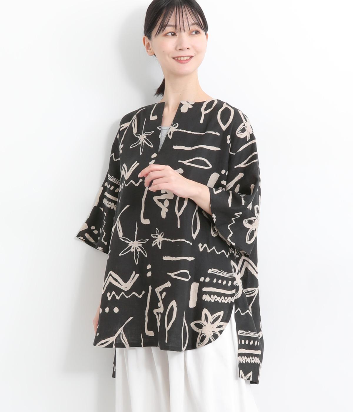 コットンリネンフリルネックブラウスブラック