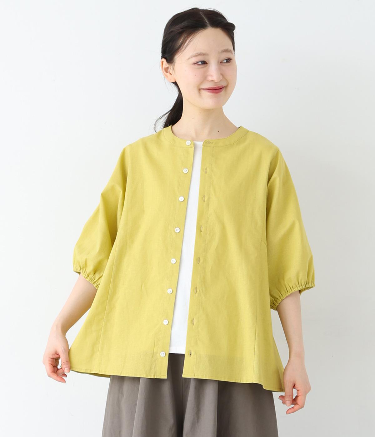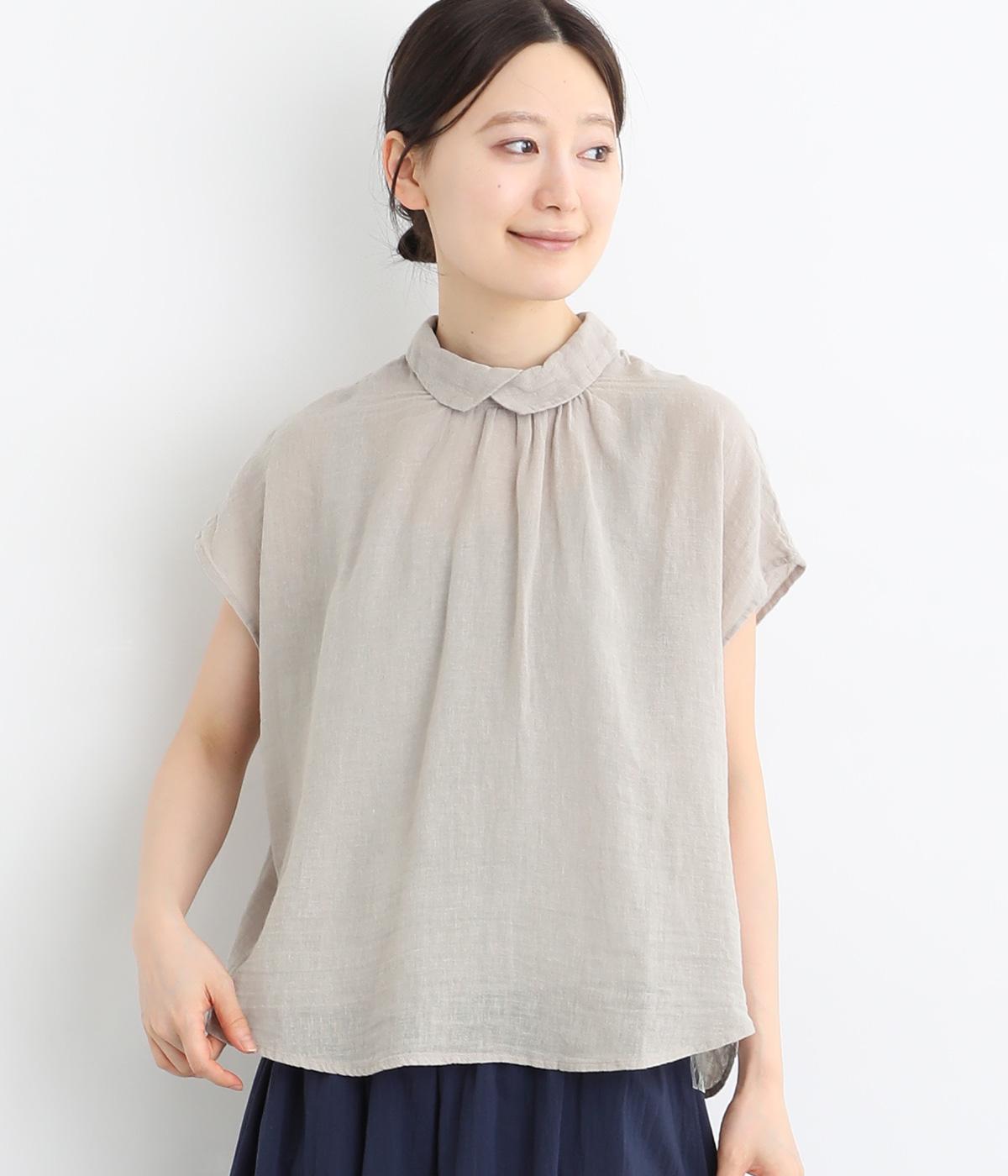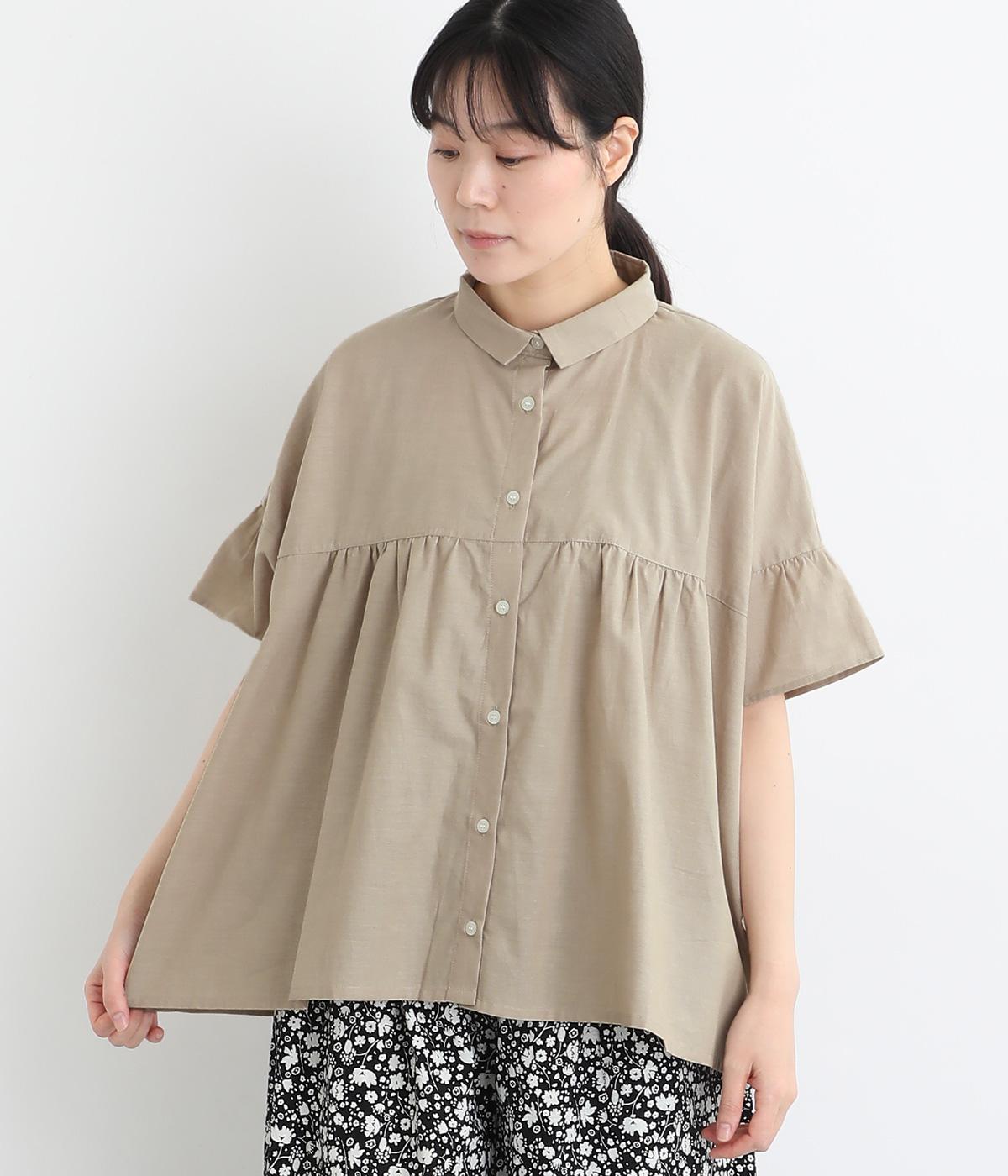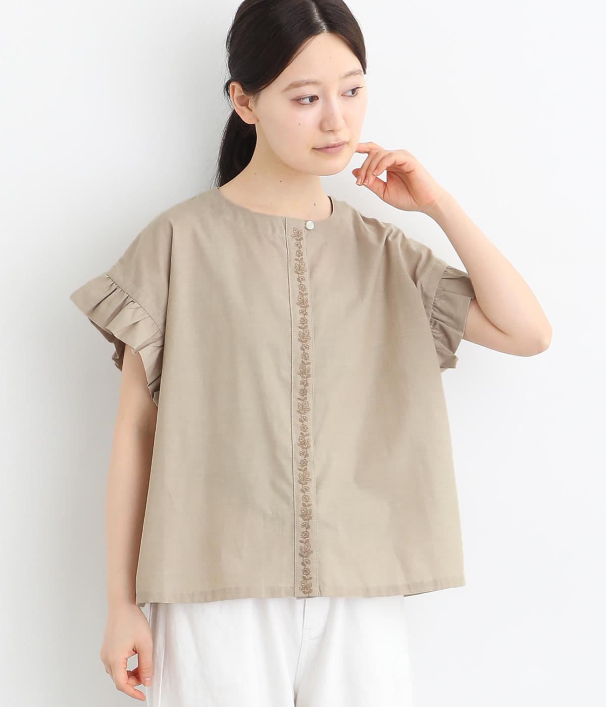 コットンリネンフリルネックブラウスカーキ