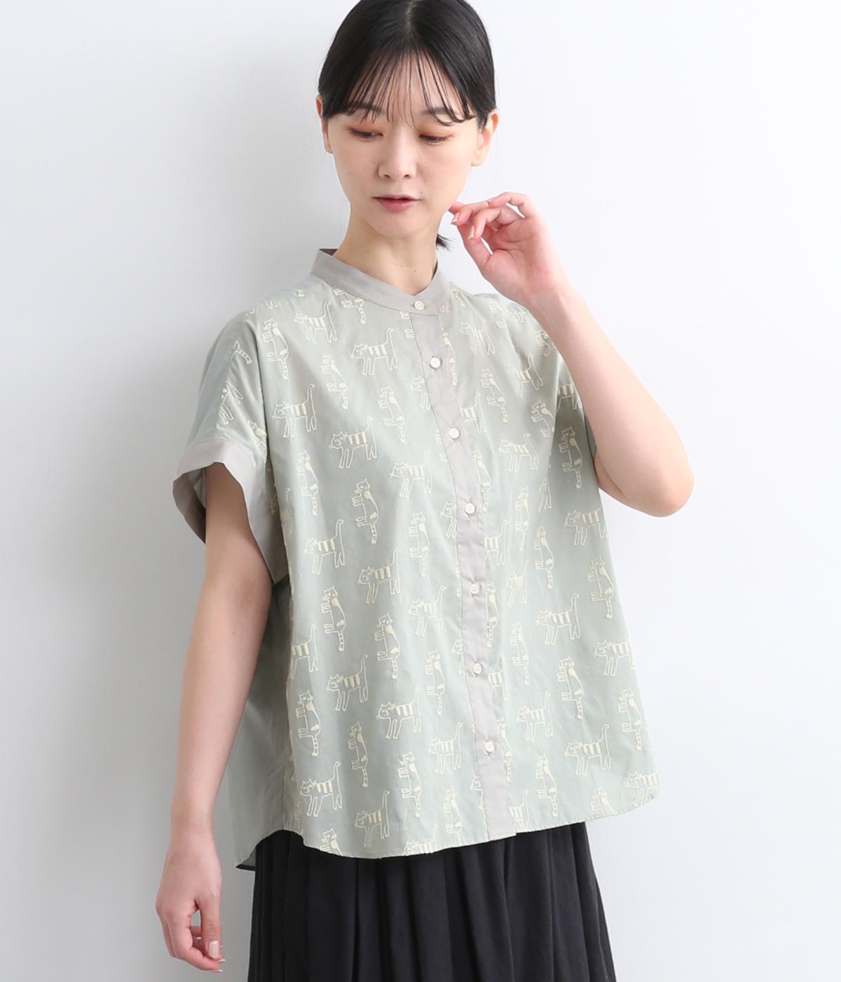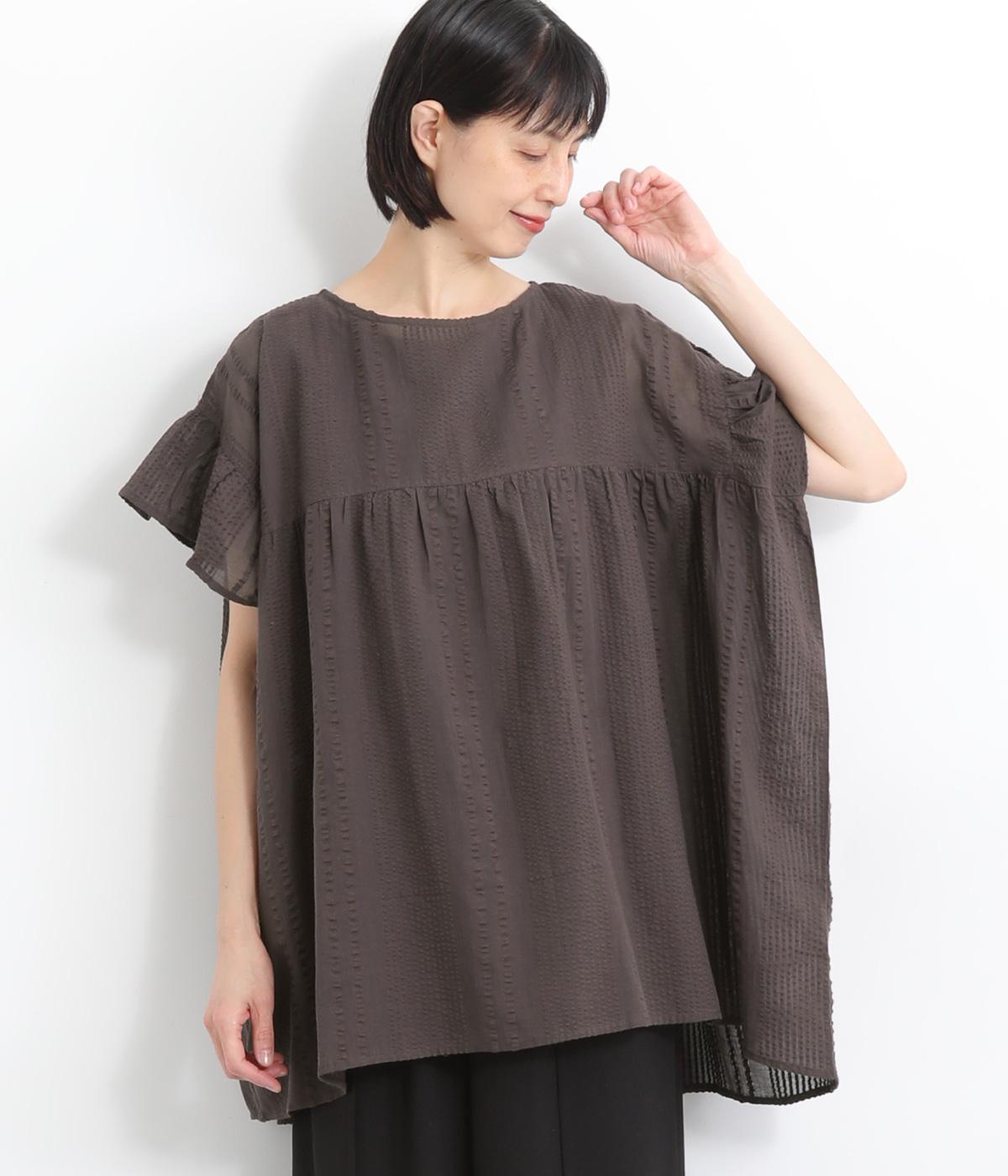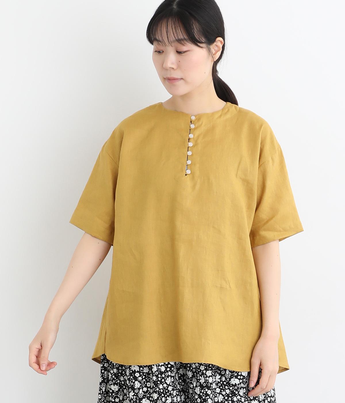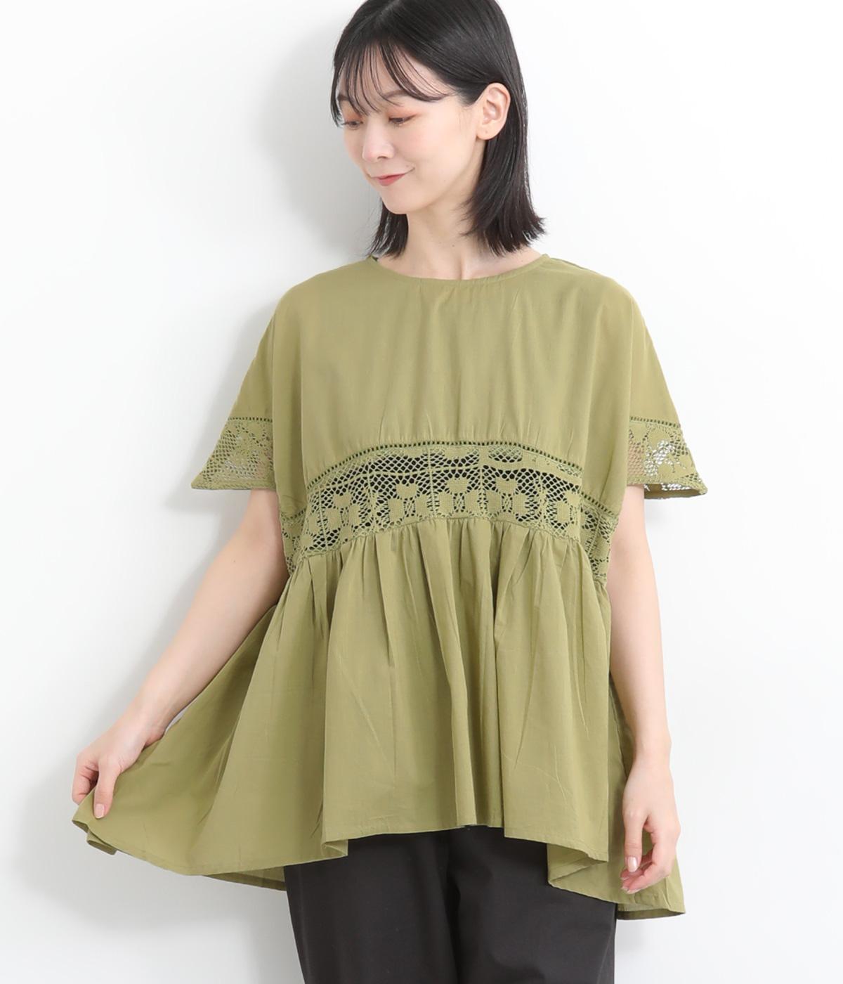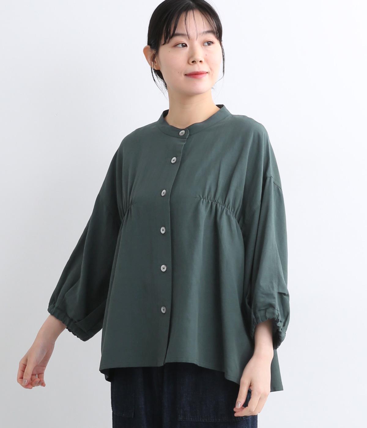 コットンリネンフリルネックブラウスカーキ