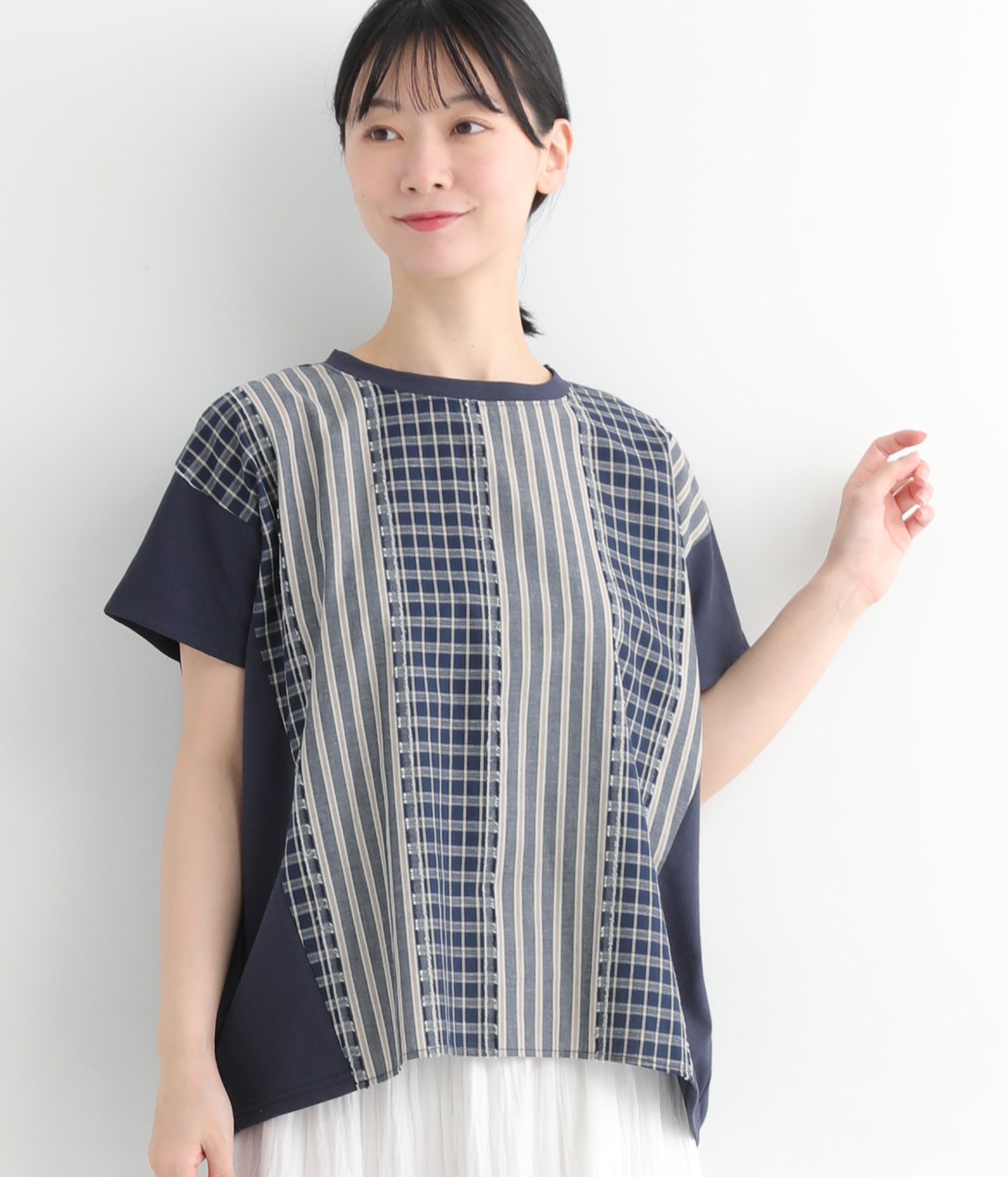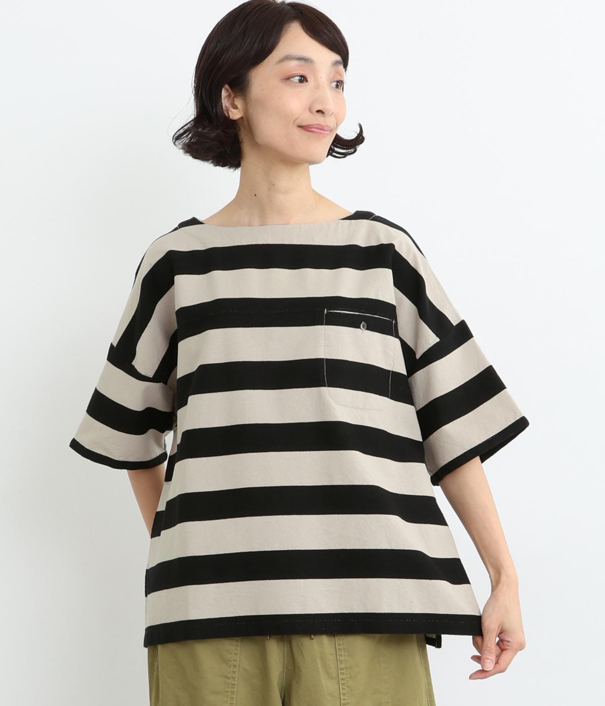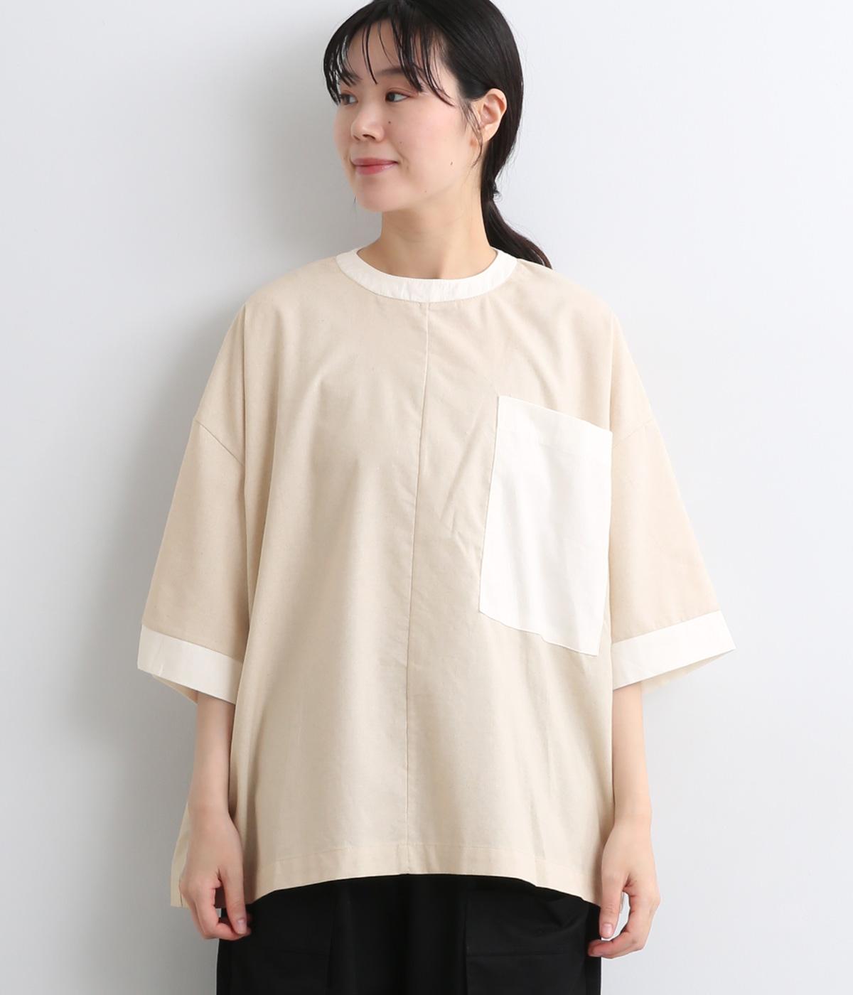 平織コットン微起毛 マオカラー釦プルオーバーベージュ×ネイビー