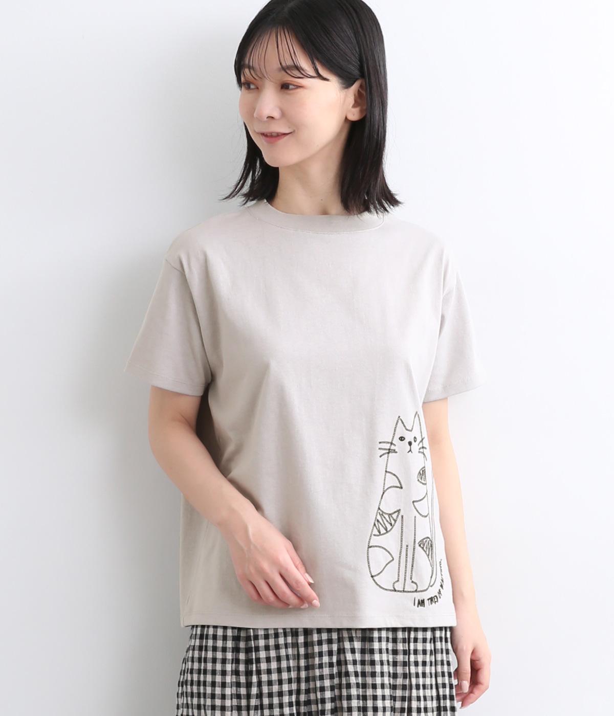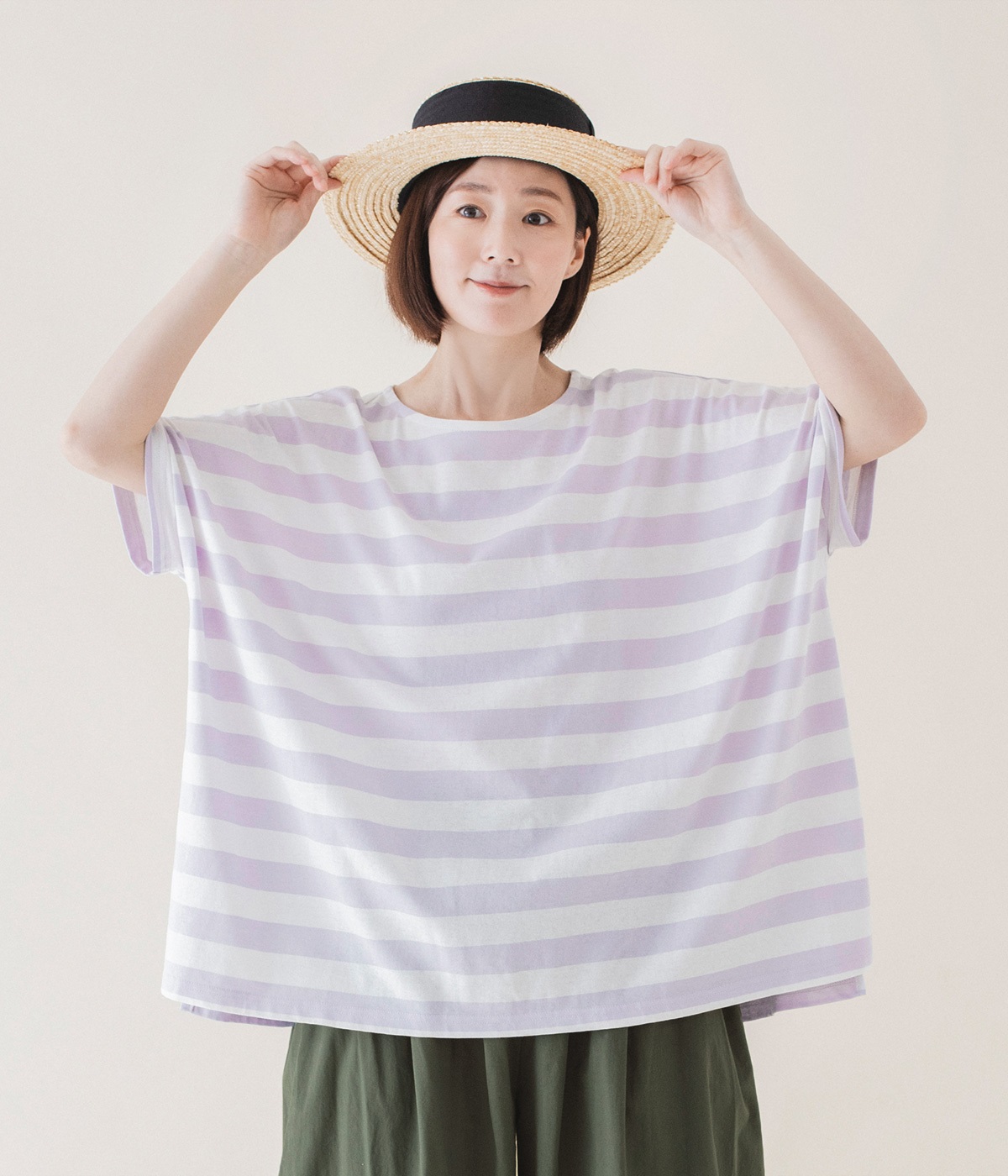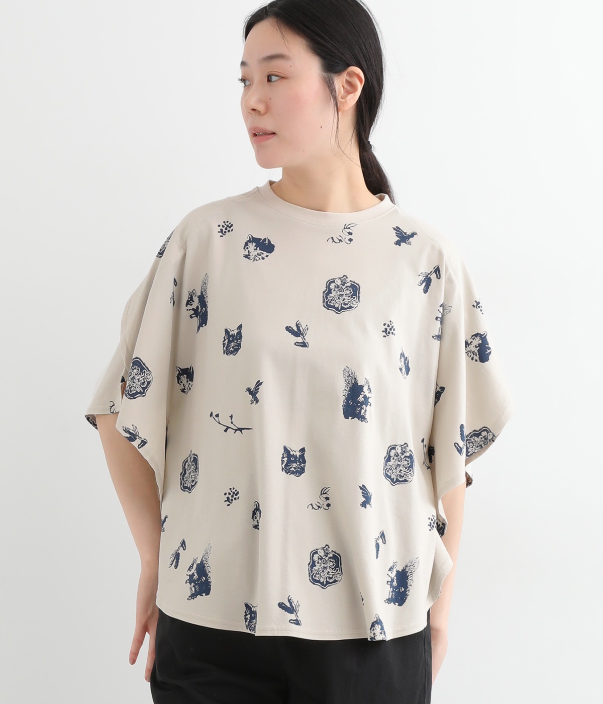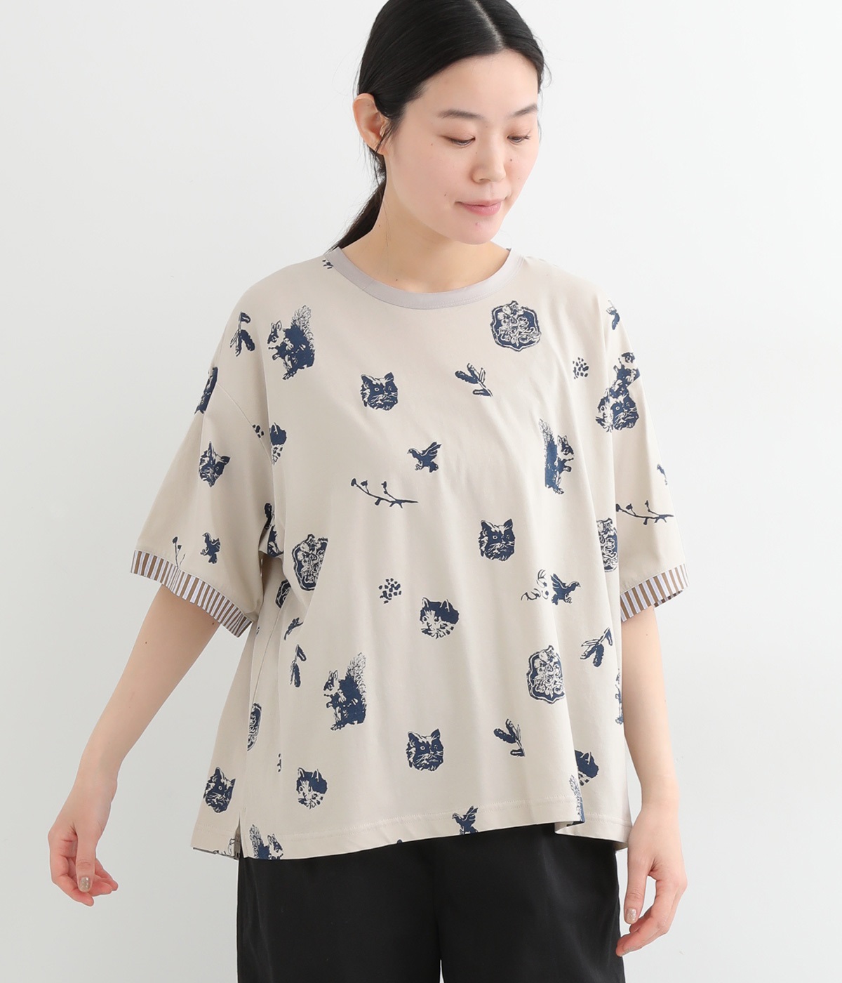 平織コットン微起毛 マオカラー釦プルオーバーベージュ×ネイビー
