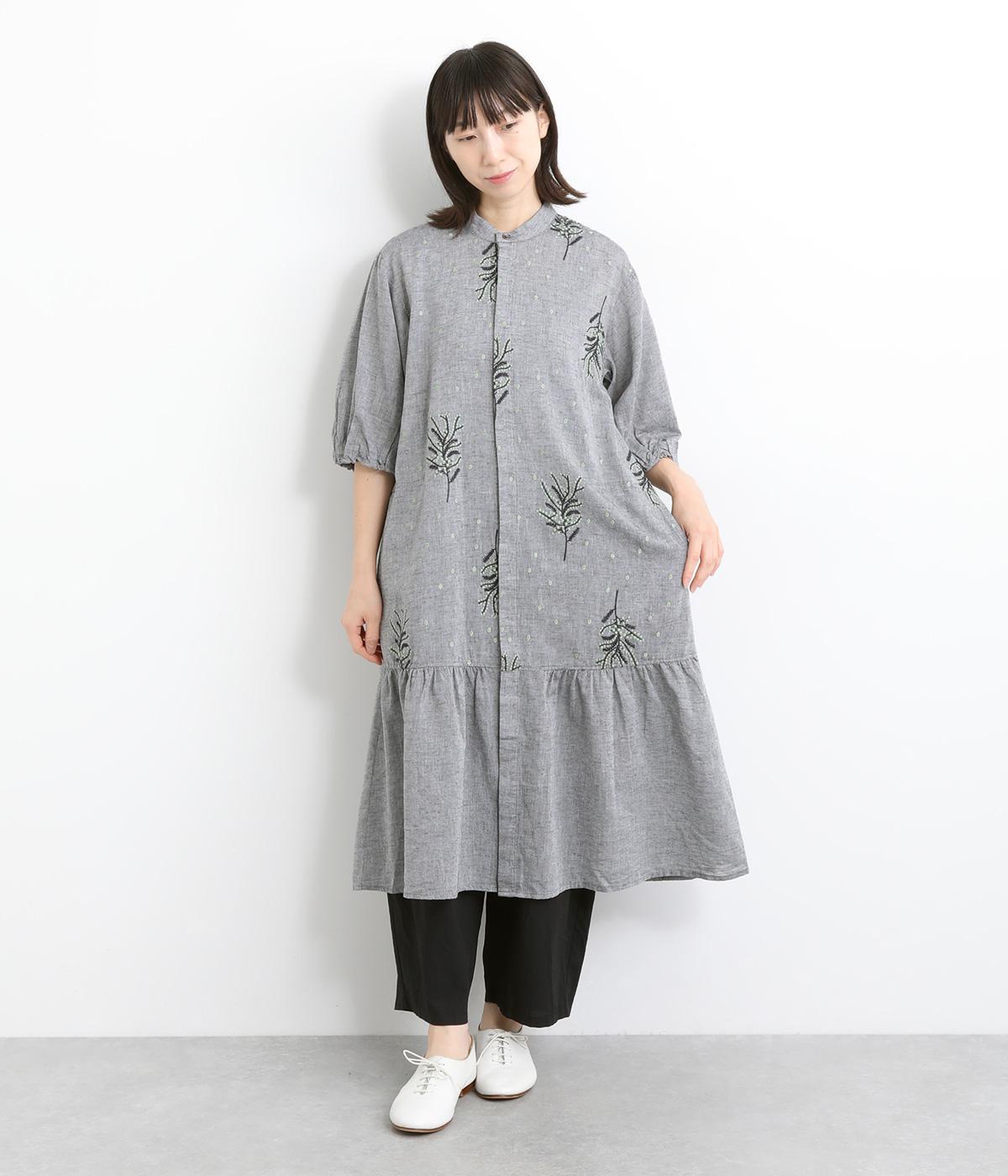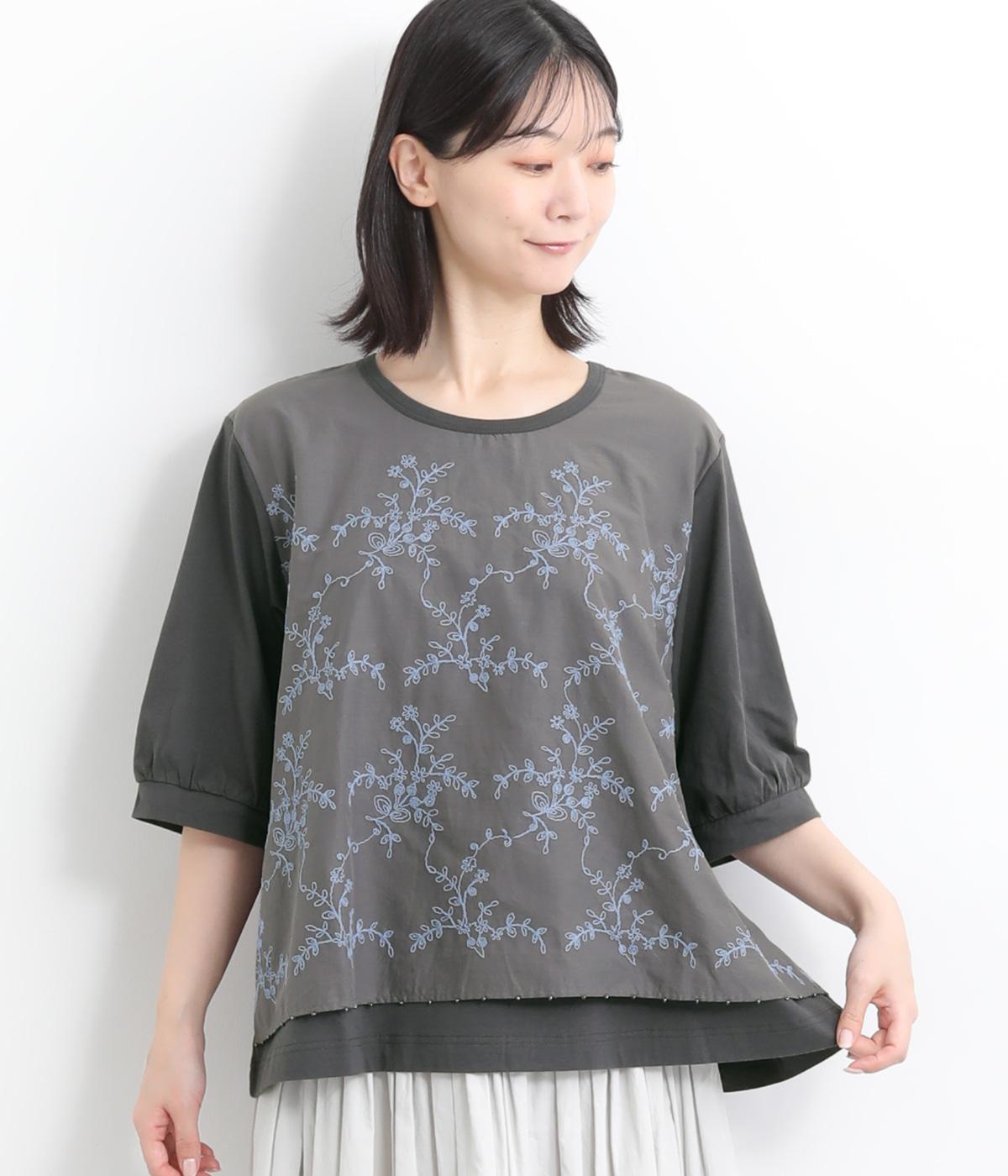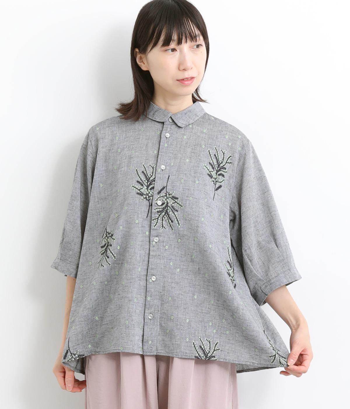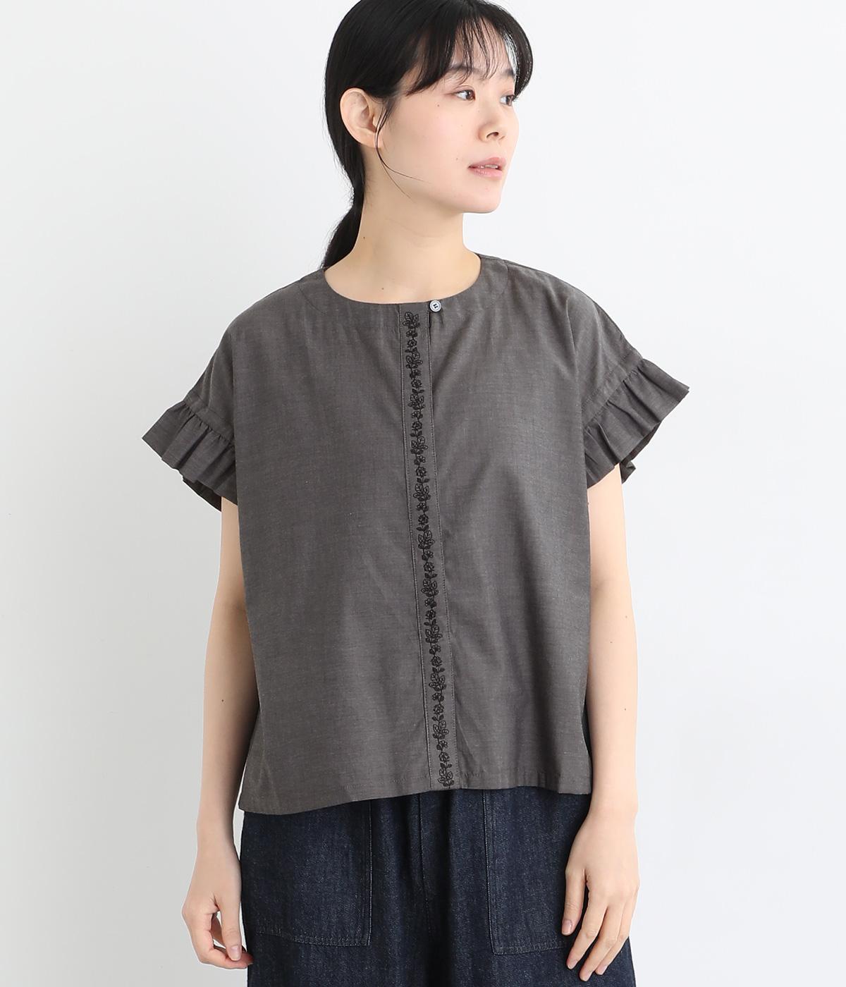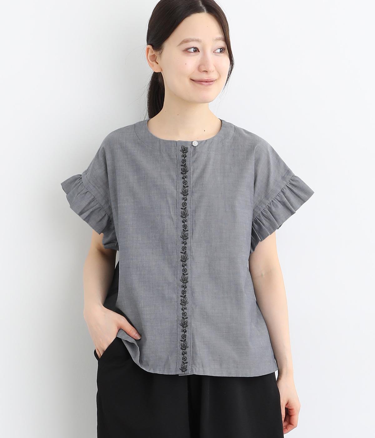 コットンビエラ先染めシャンブレービッグポピーブーケ刺繍チュニックブラウス杢グレー
