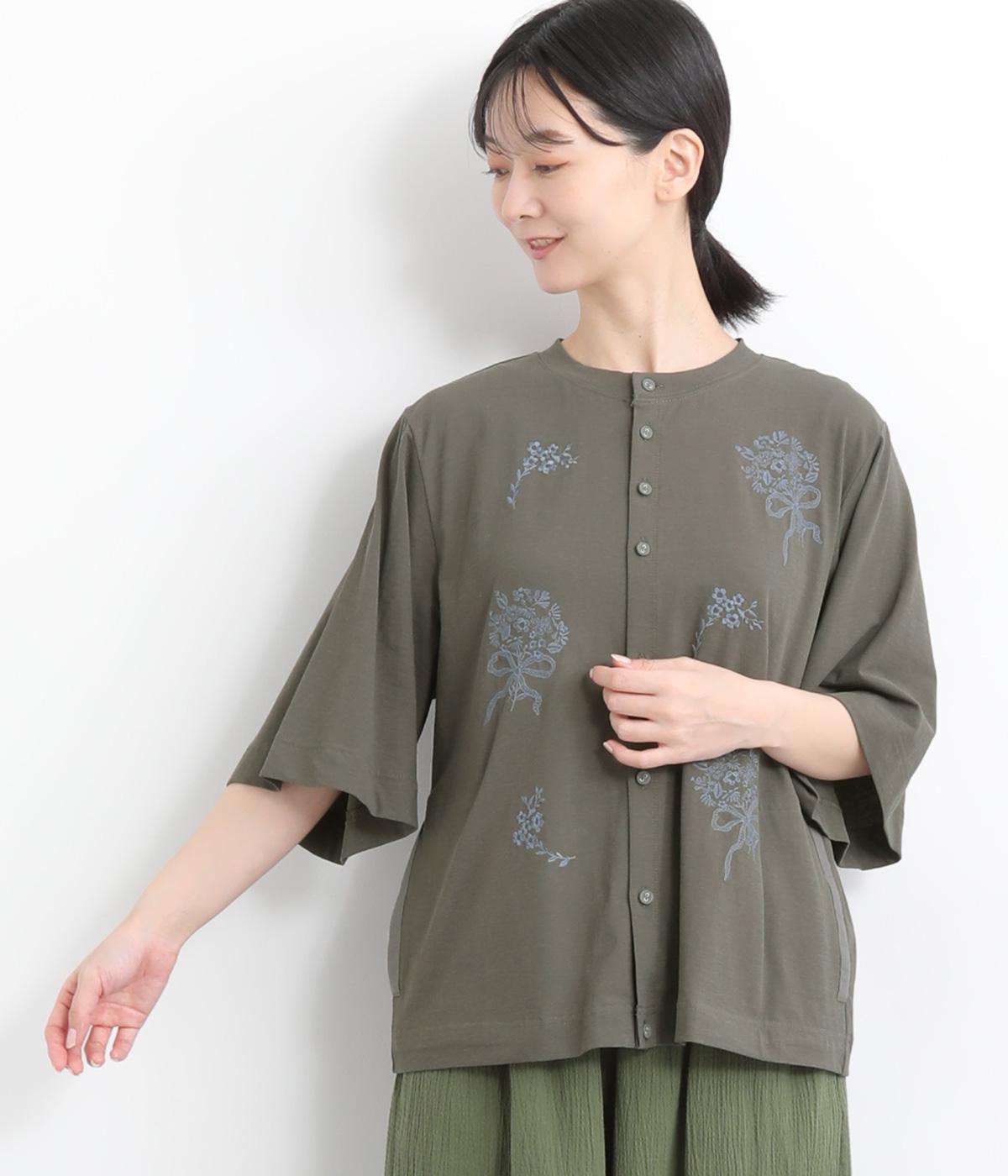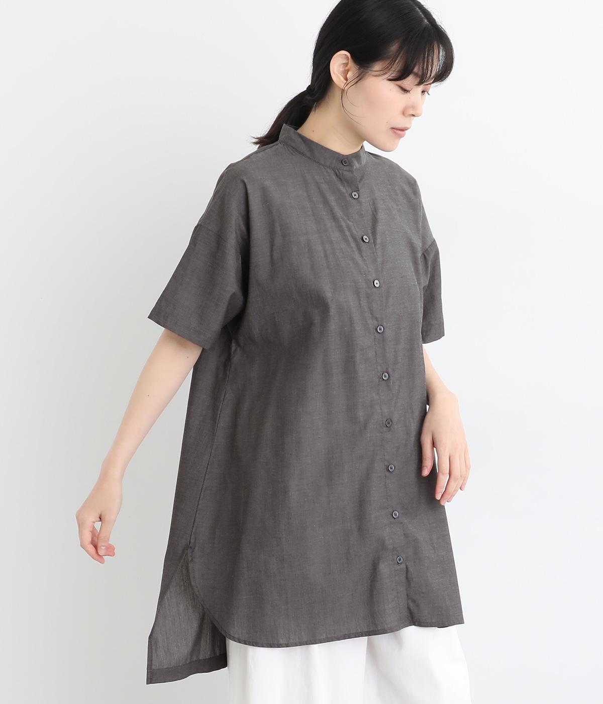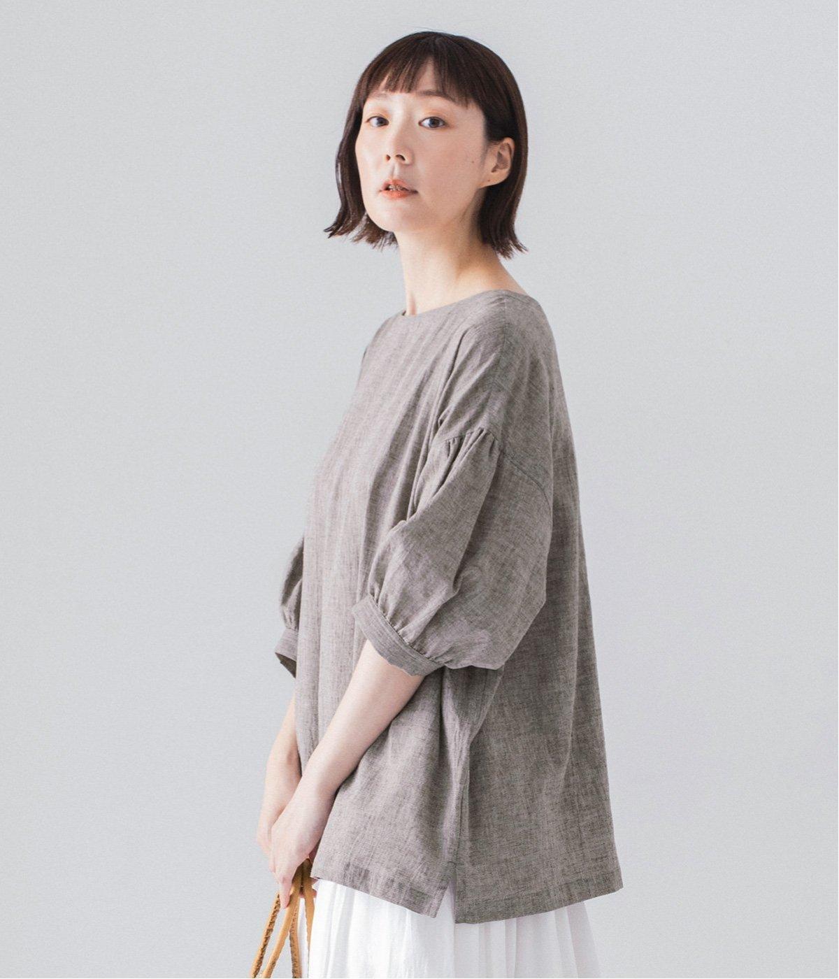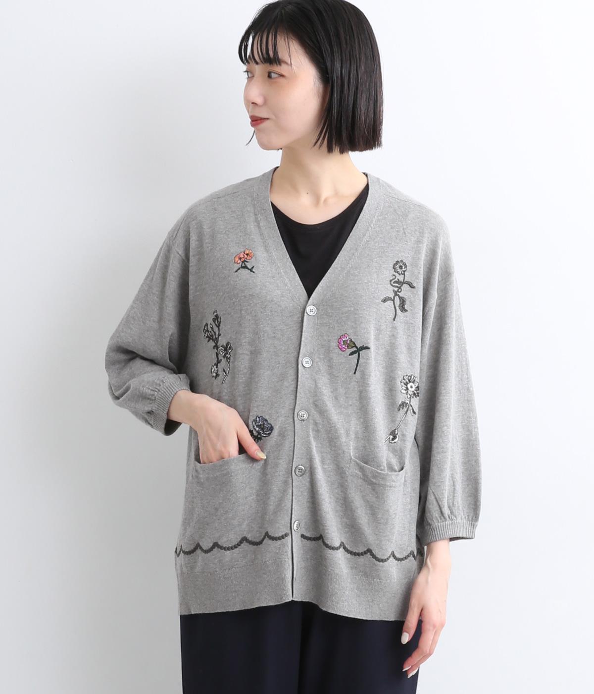 コットンビエラ先染めシャンブレービッグポピーブーケ刺繍チュニックブラウス杢グレー