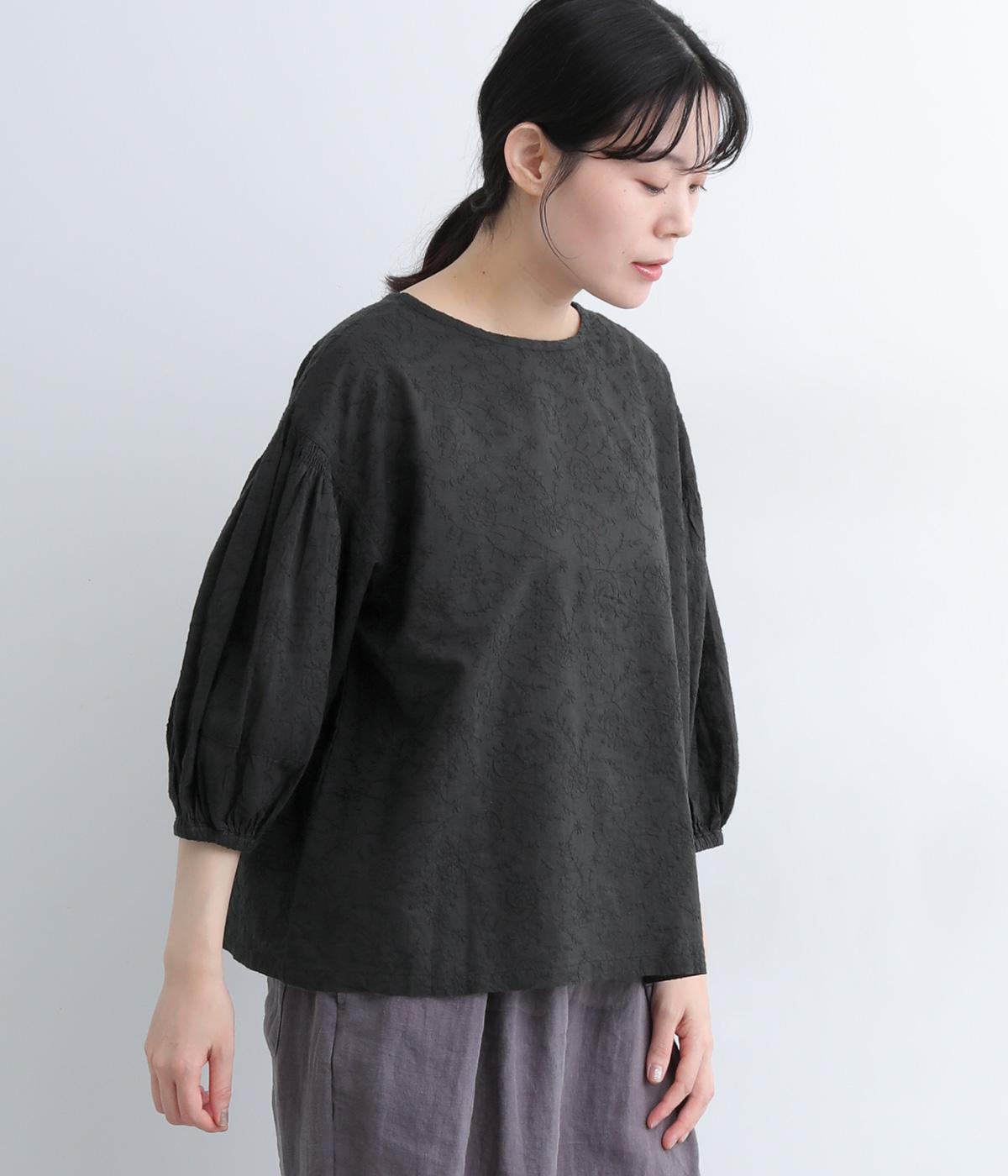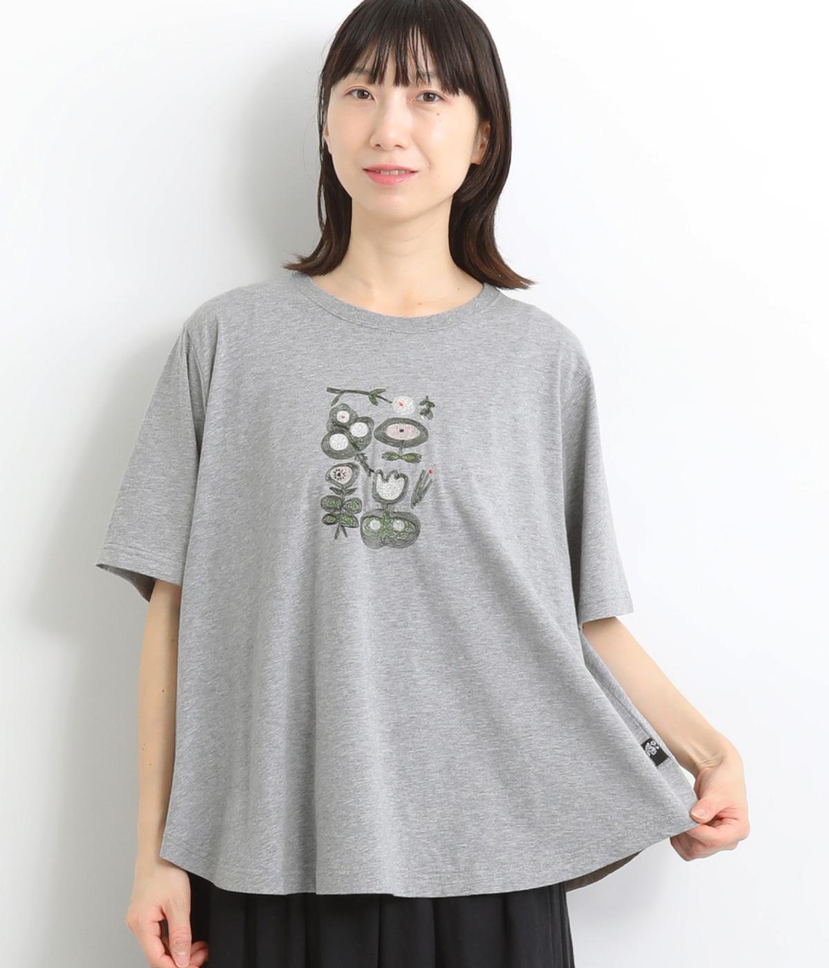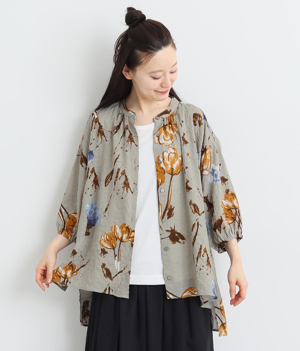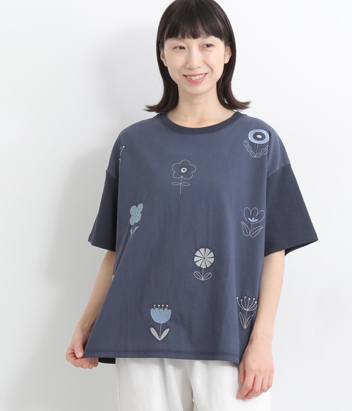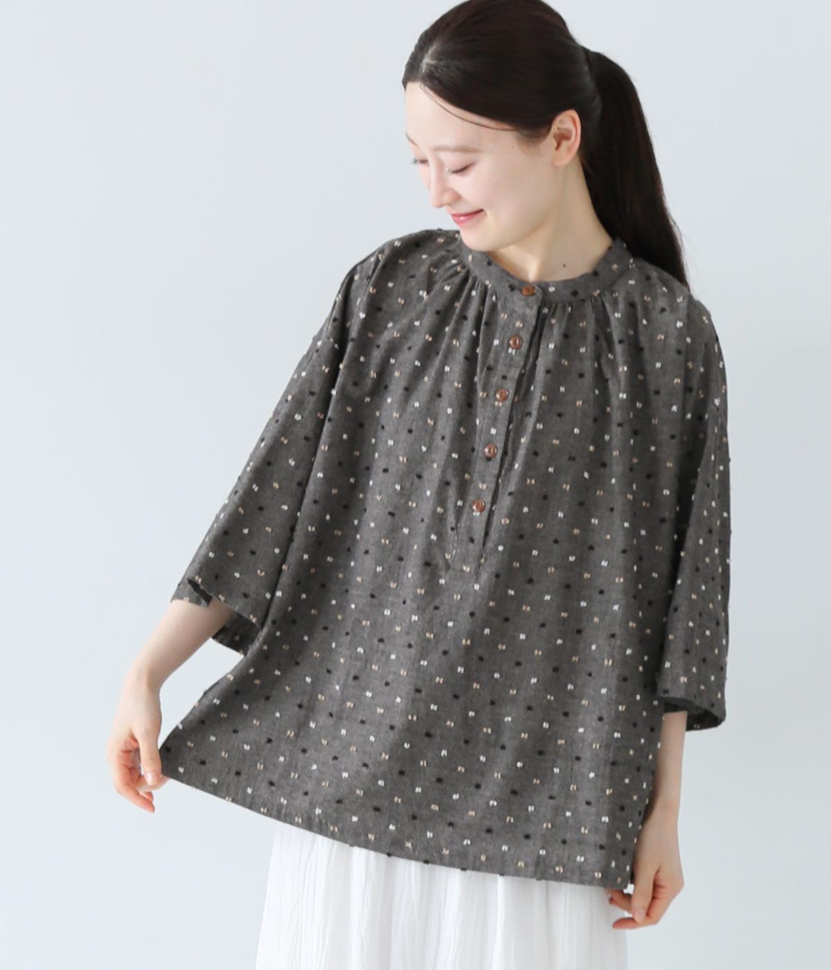 コットンビエラ先染めシャンブレービッグポピーブーケ刺繍チュニックブラウス杢グレー