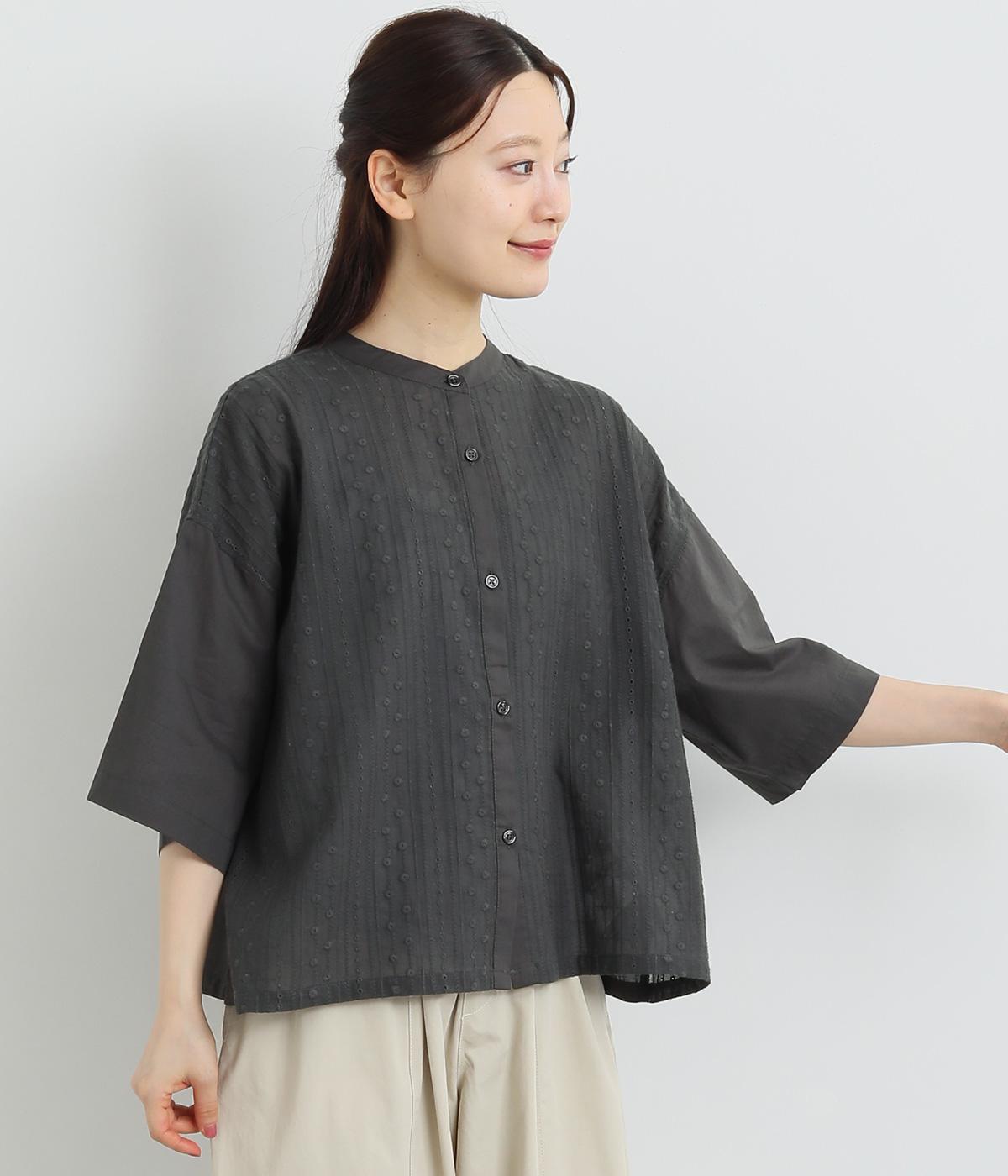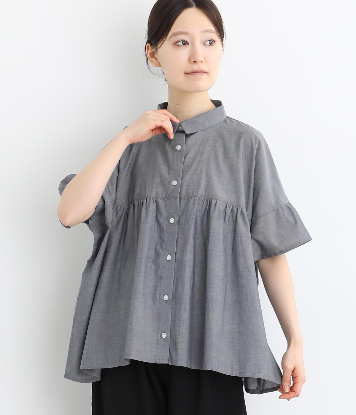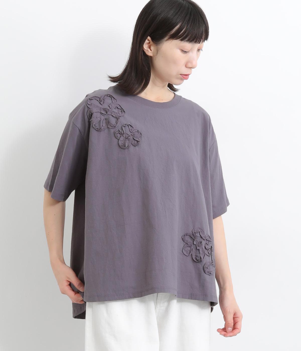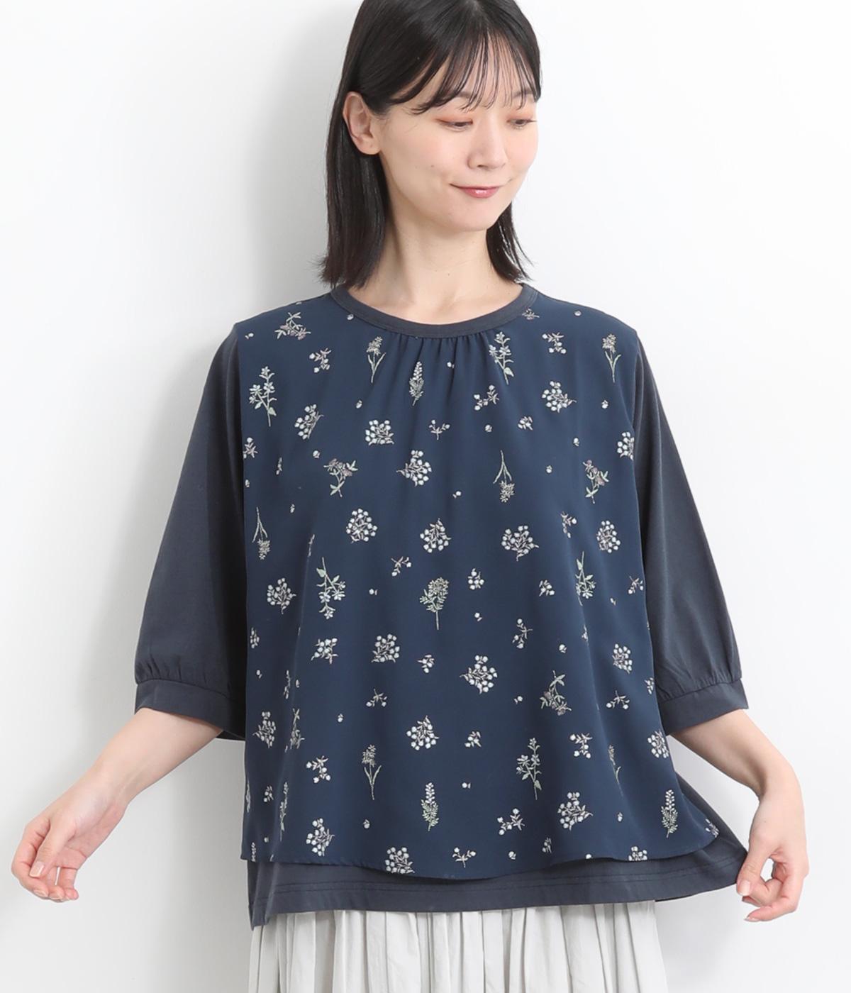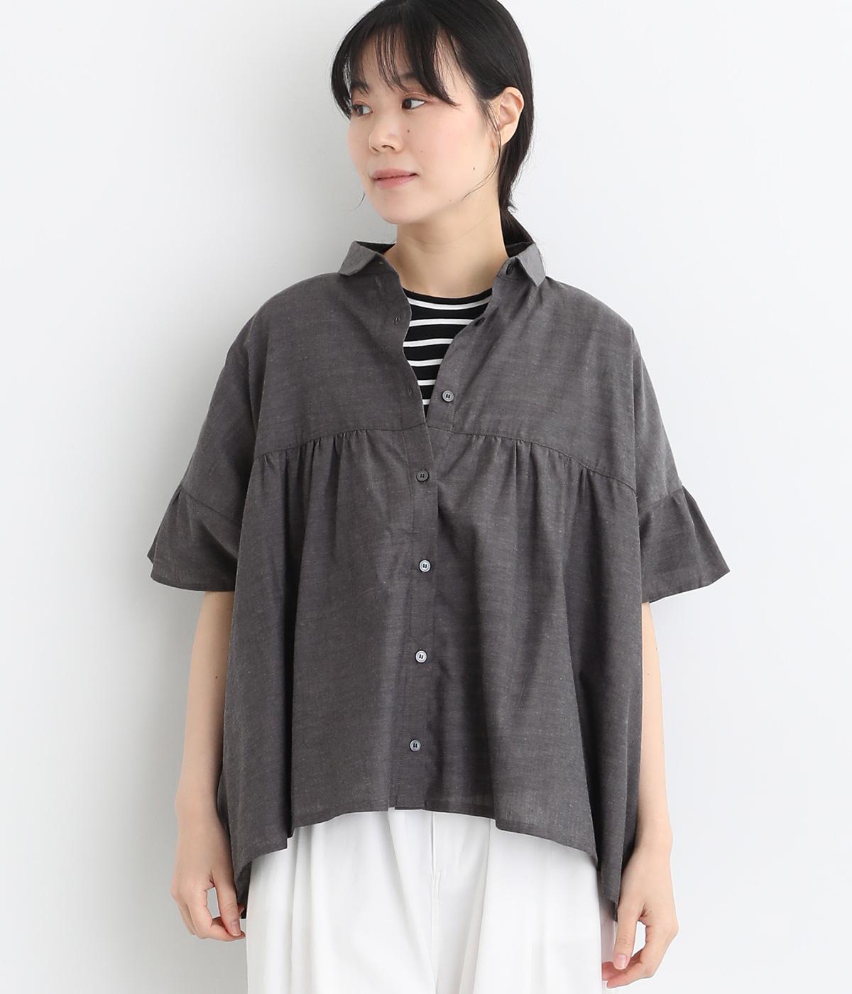 コットンビエラ先染めシャンブレービッグポピーブーケ刺繍チュニックブラウス杢グレー