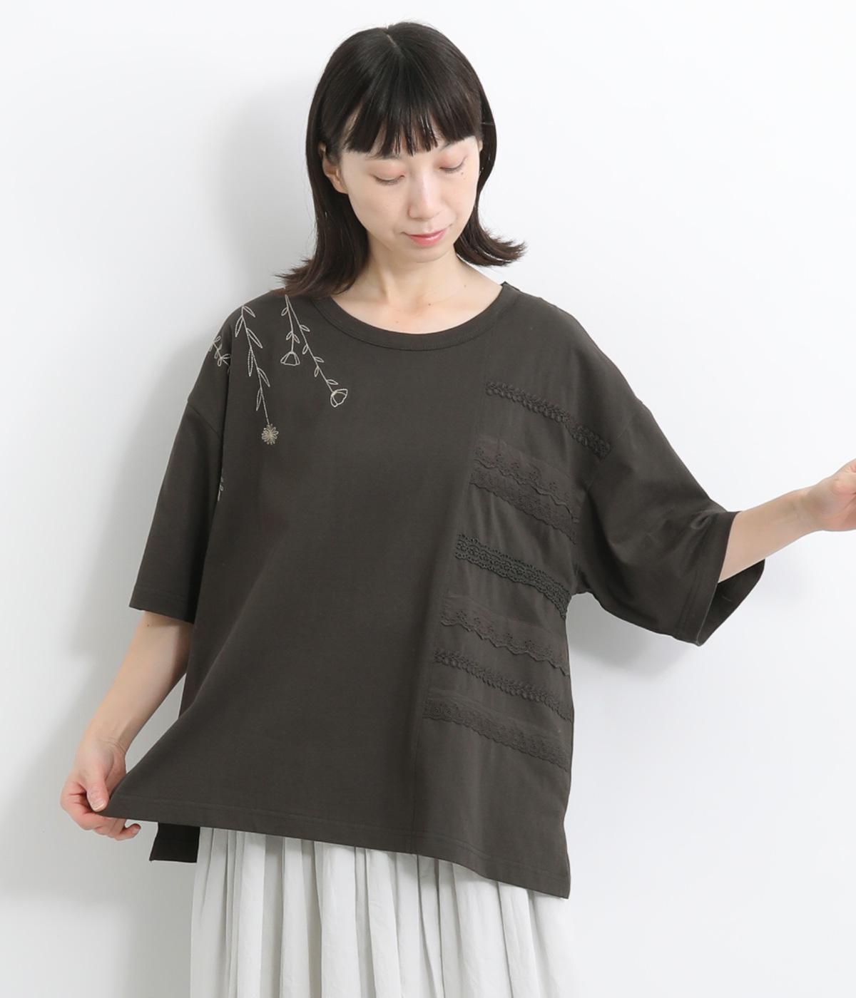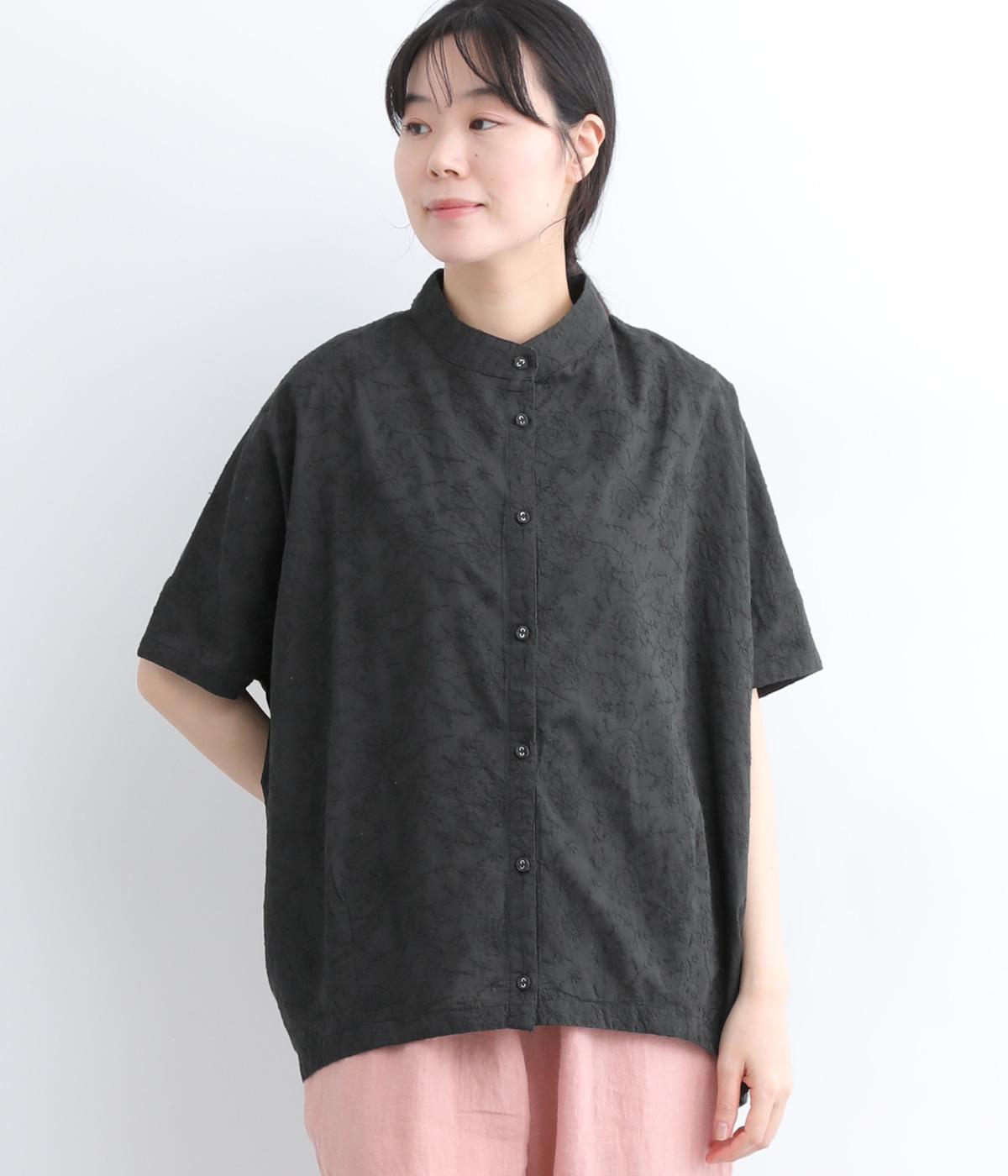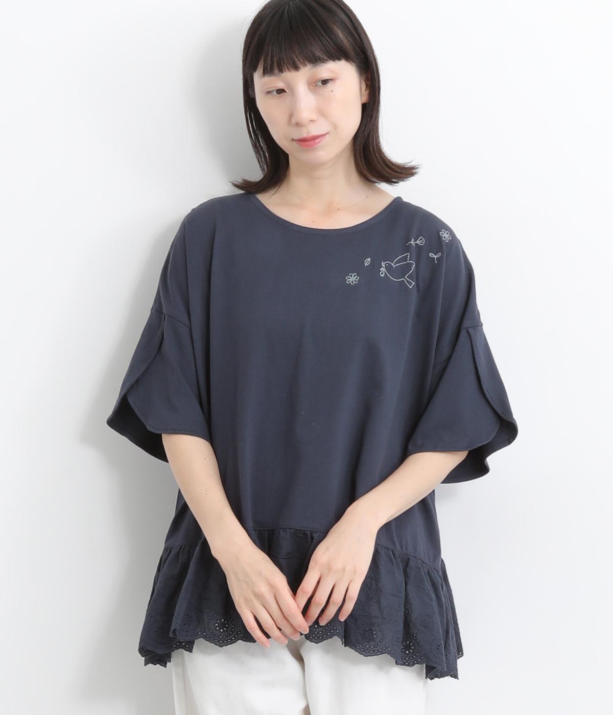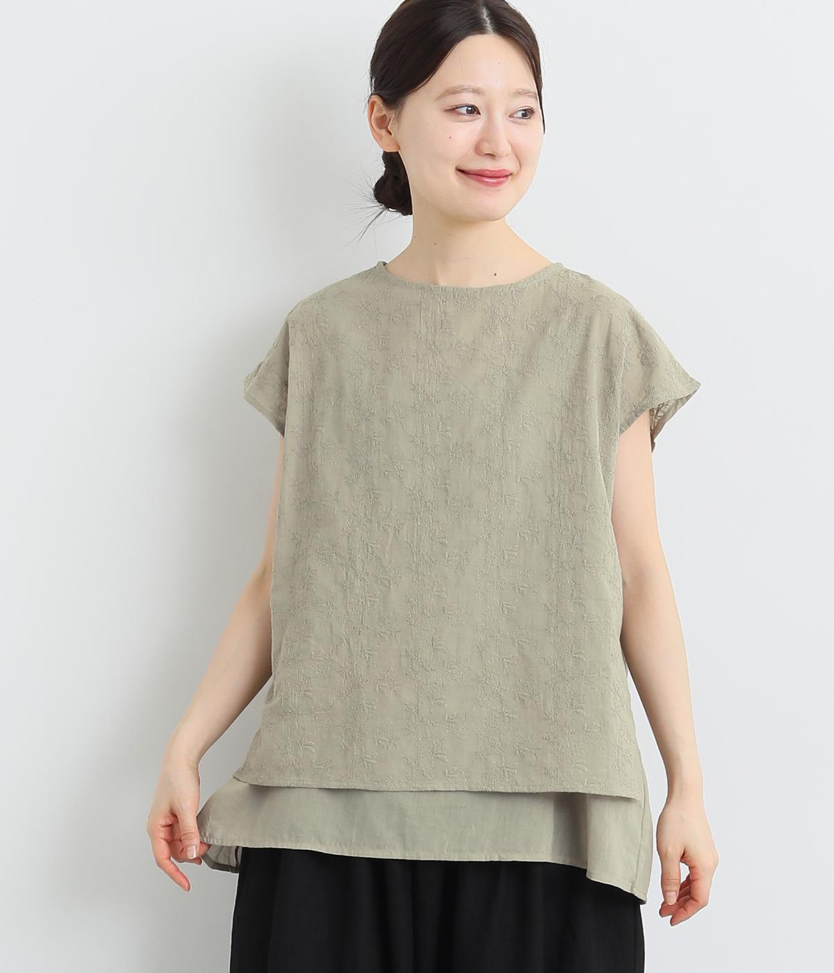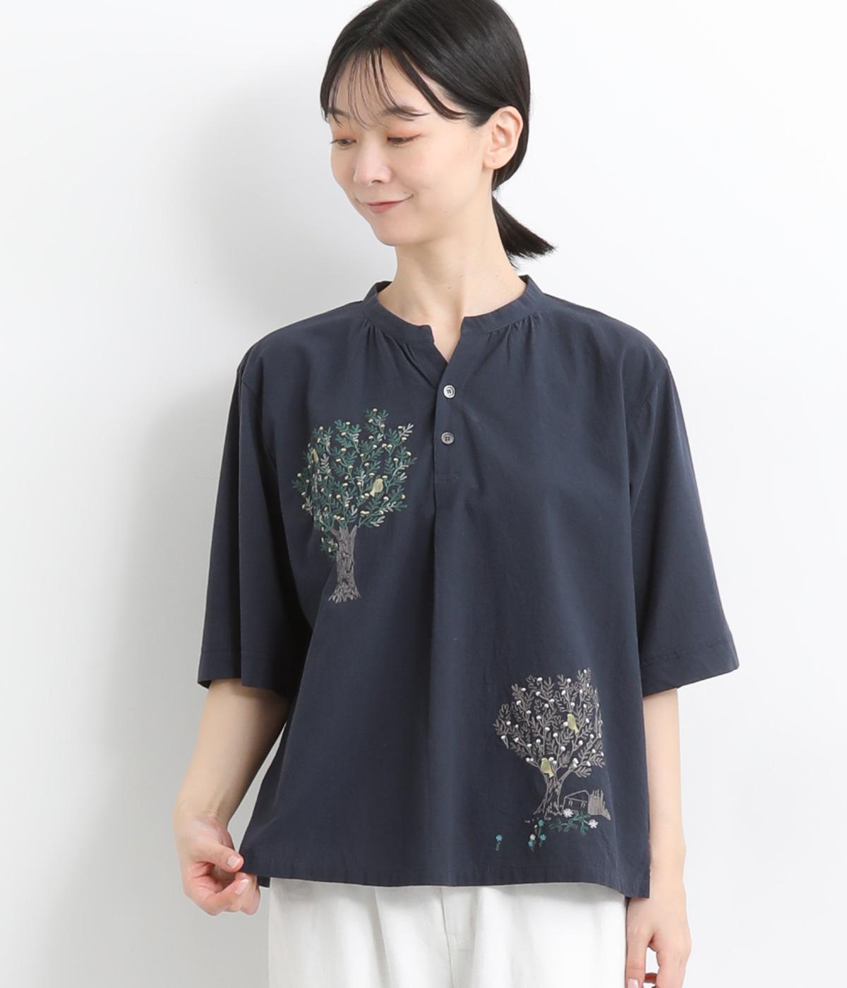コットンビエラ先染めシャンブレービッグポピーブーケ刺繍チュニックブラウス杢グレー