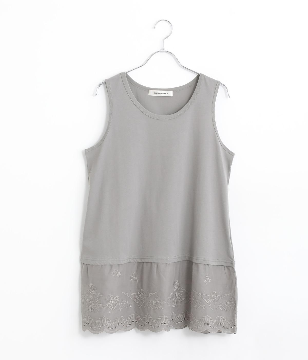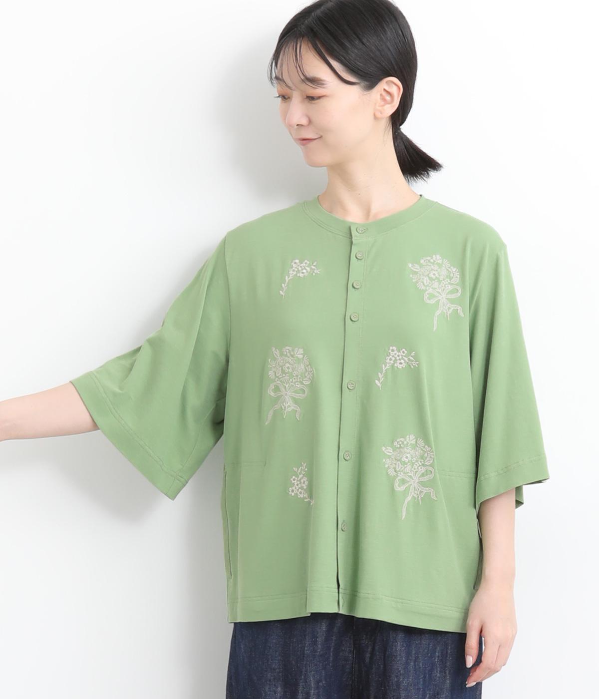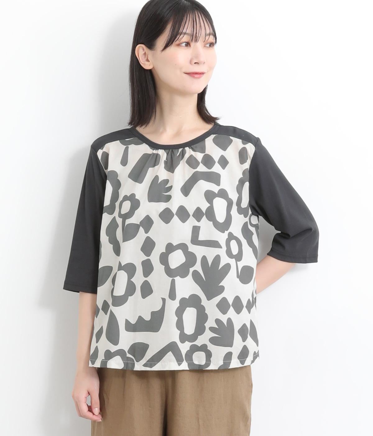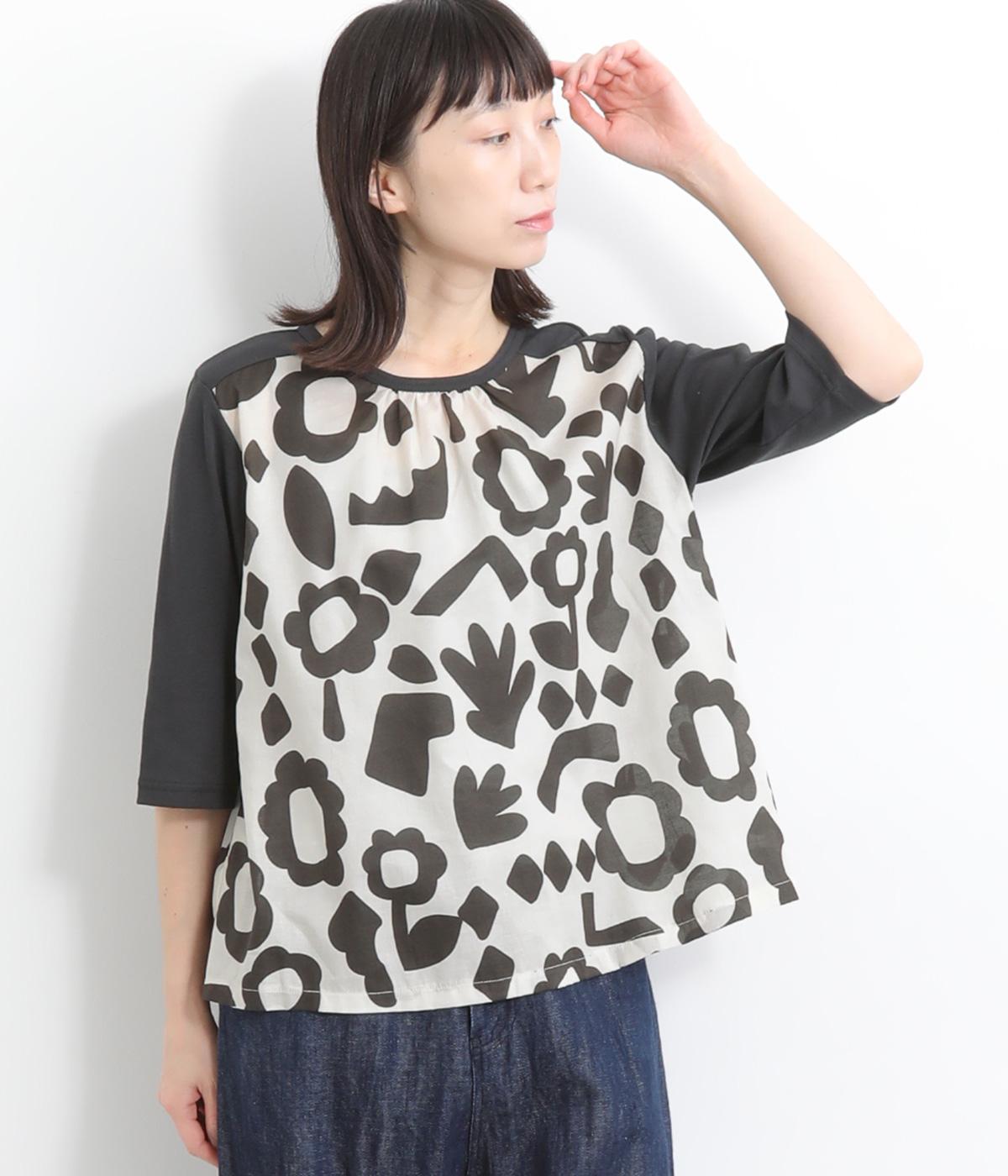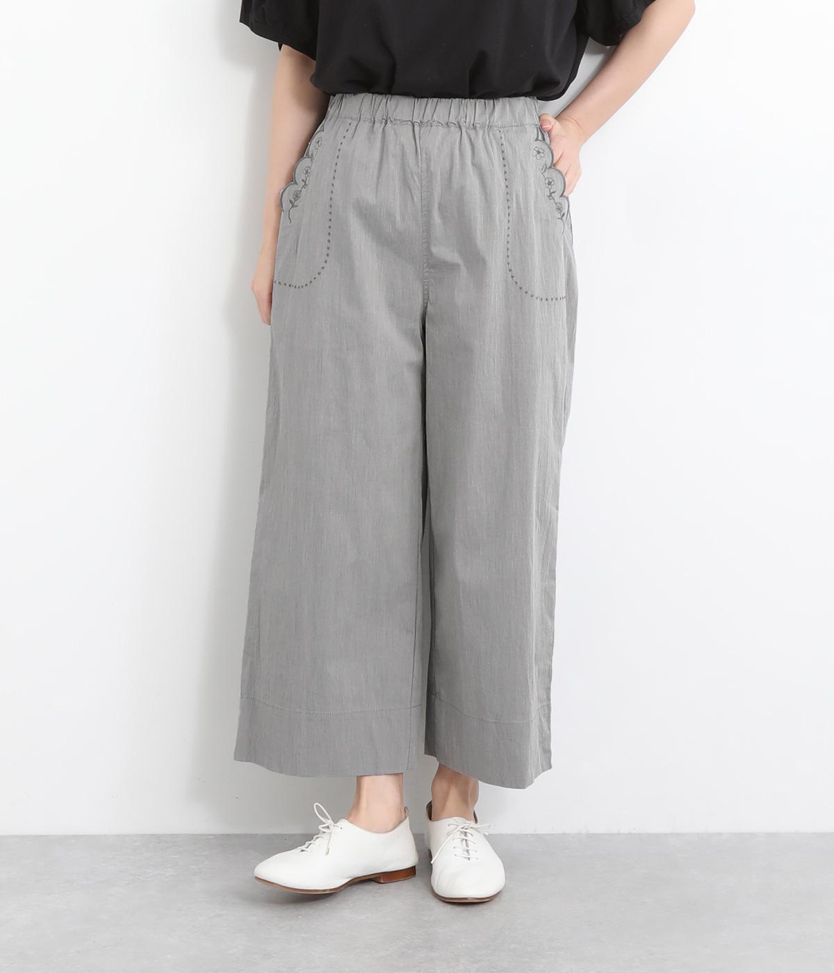 コットンビエラ先染めシャンブレービッグポピーブーケ刺繍チュニックブラウス杢グレー