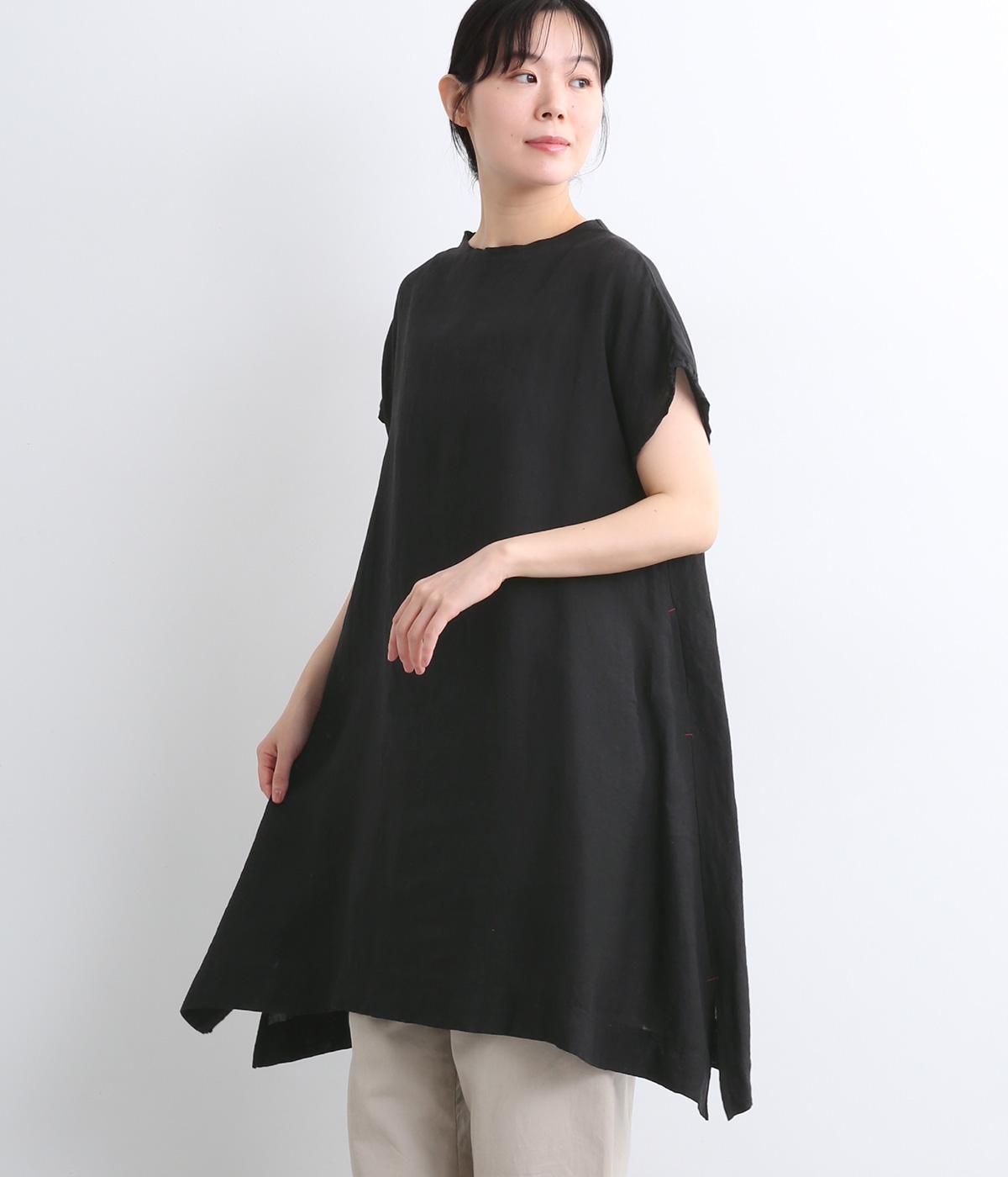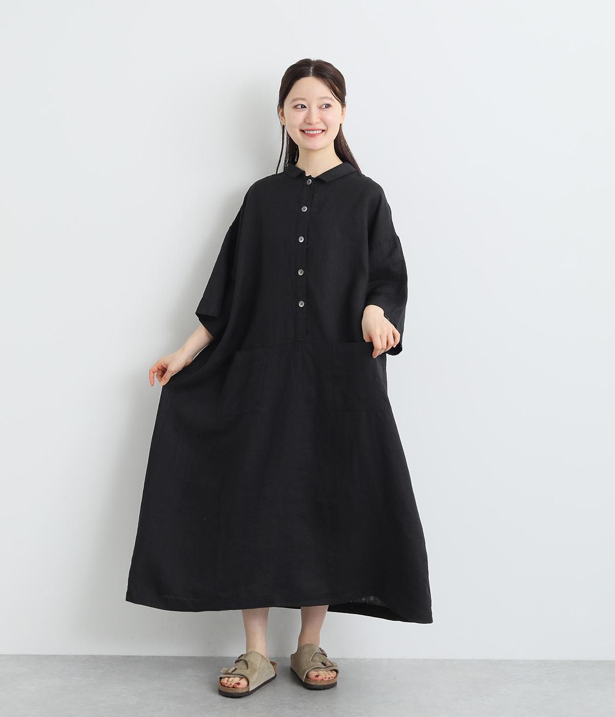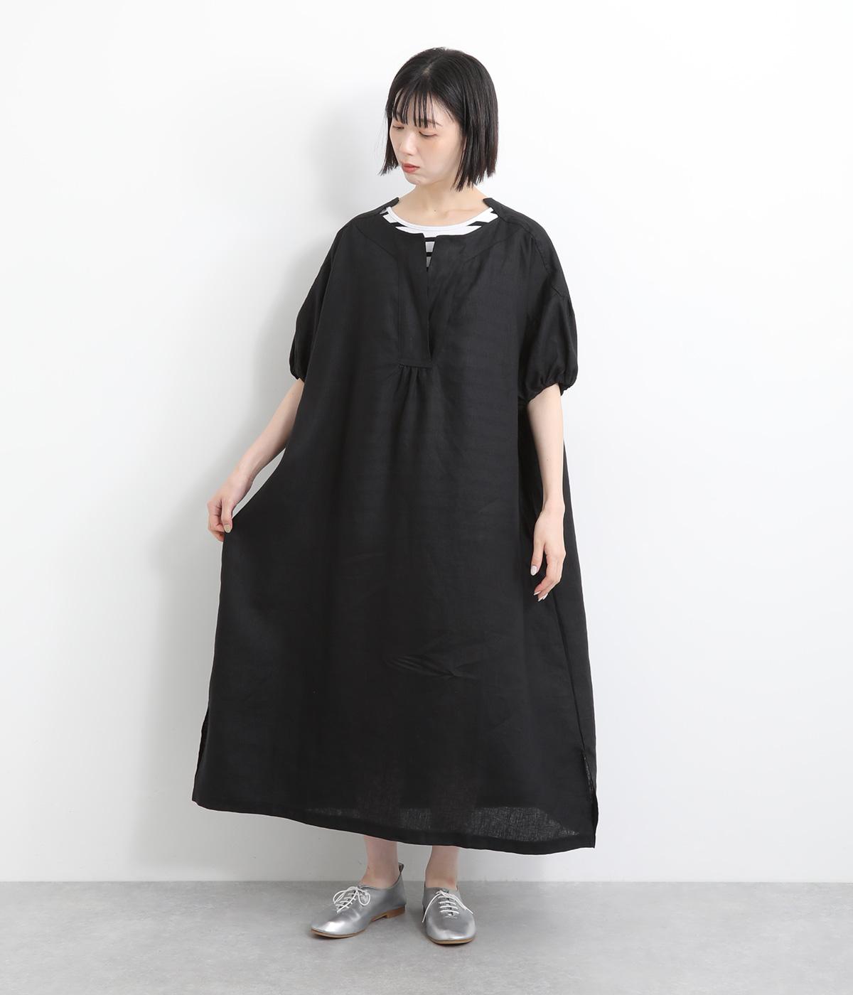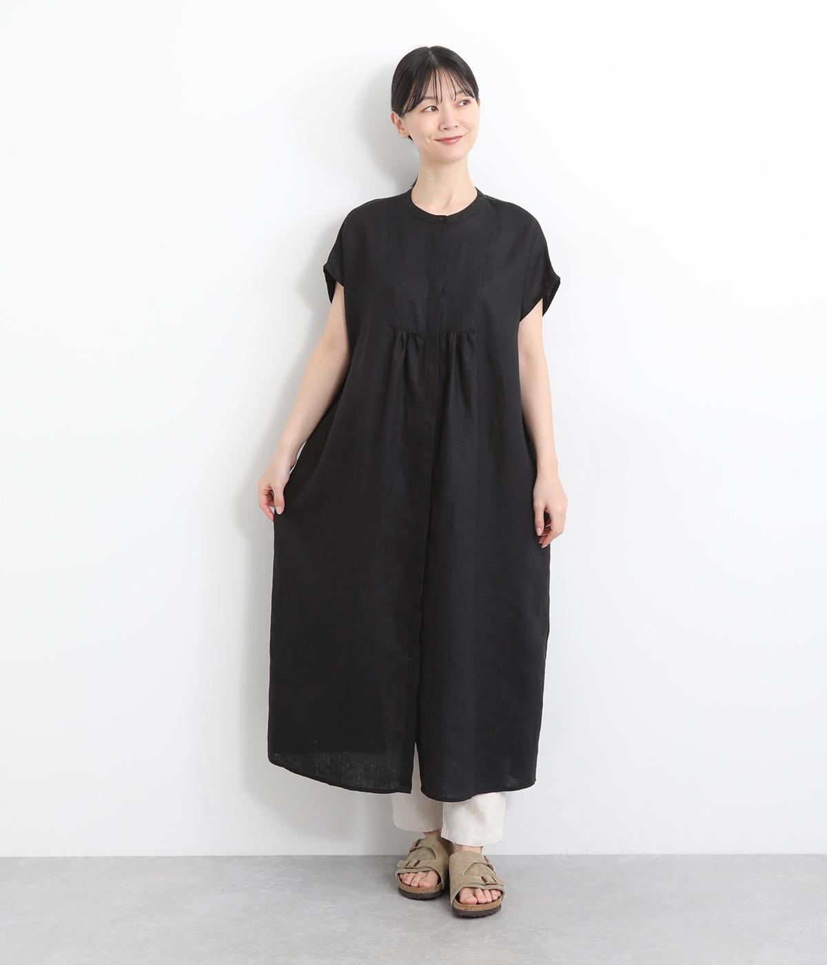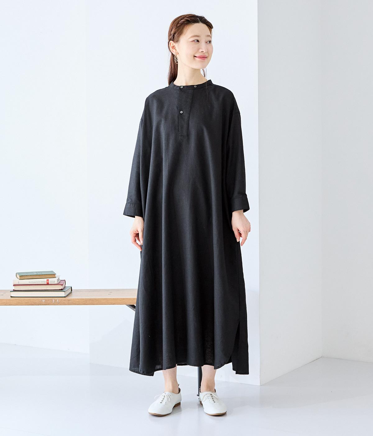 コットンリネンバンドカラープルオーバーワンピースブラック