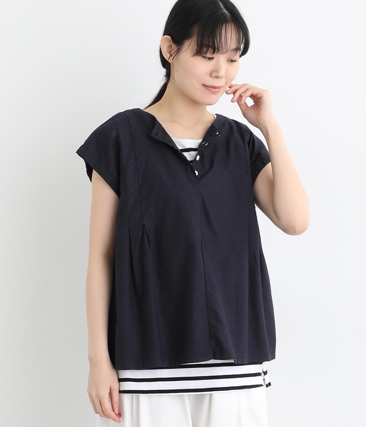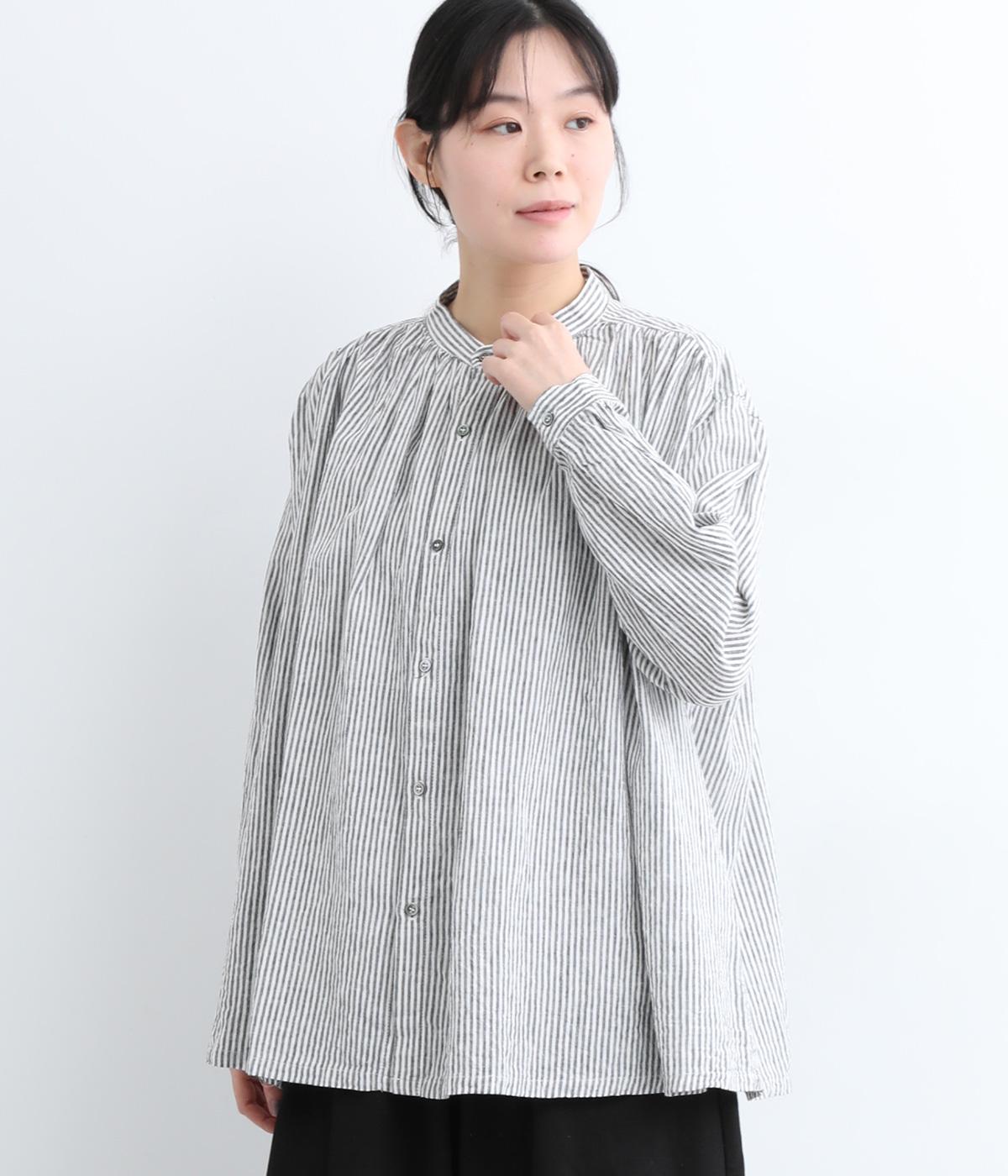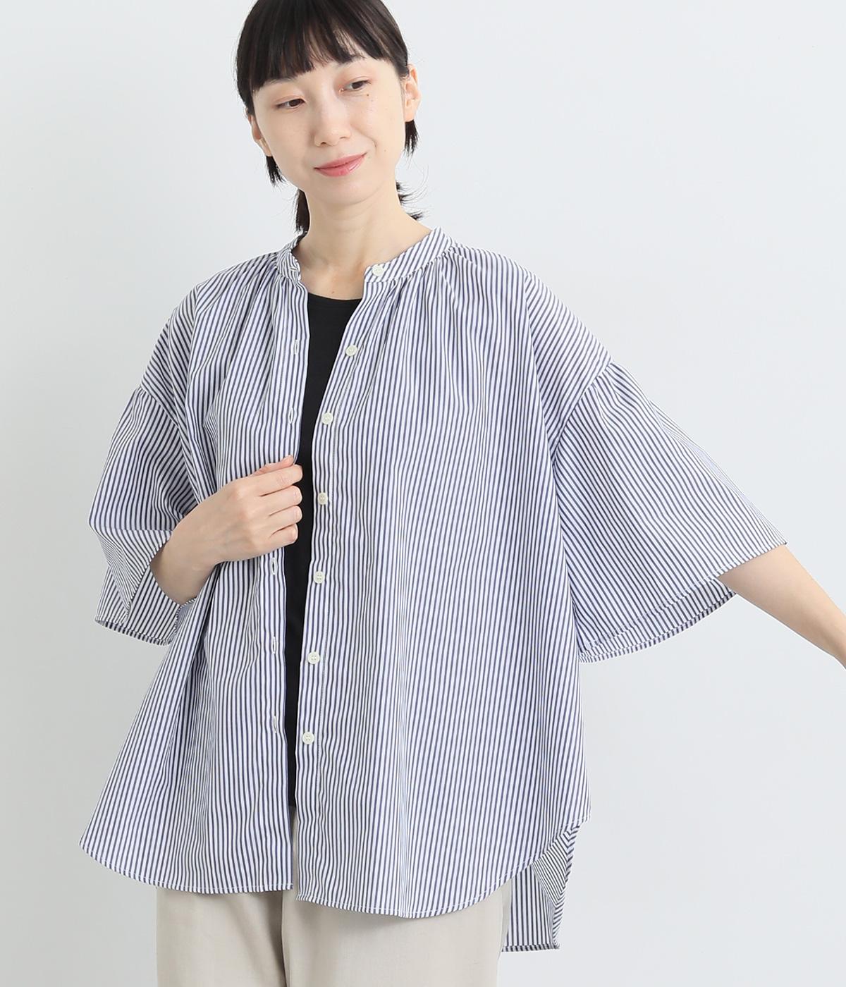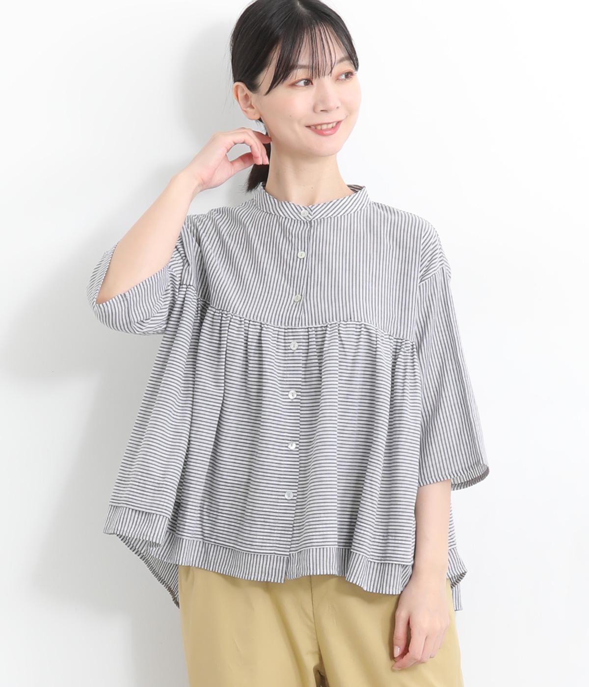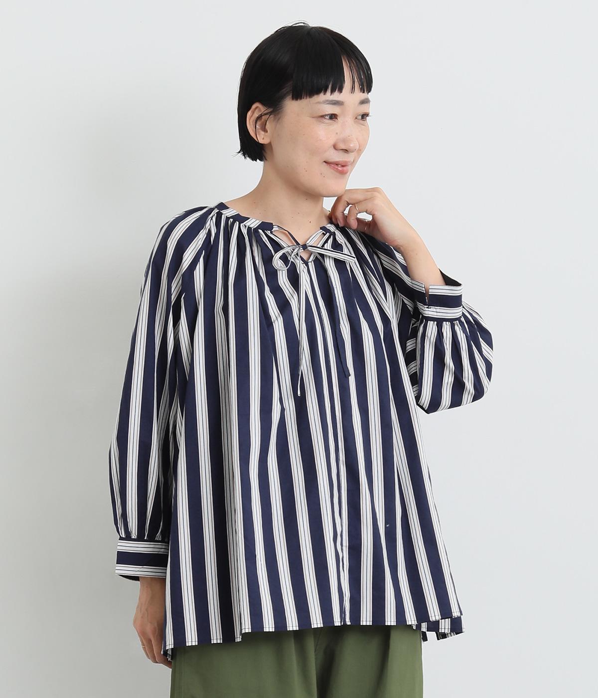 コットンワッシャーストライプクレリックブラウスネイビー