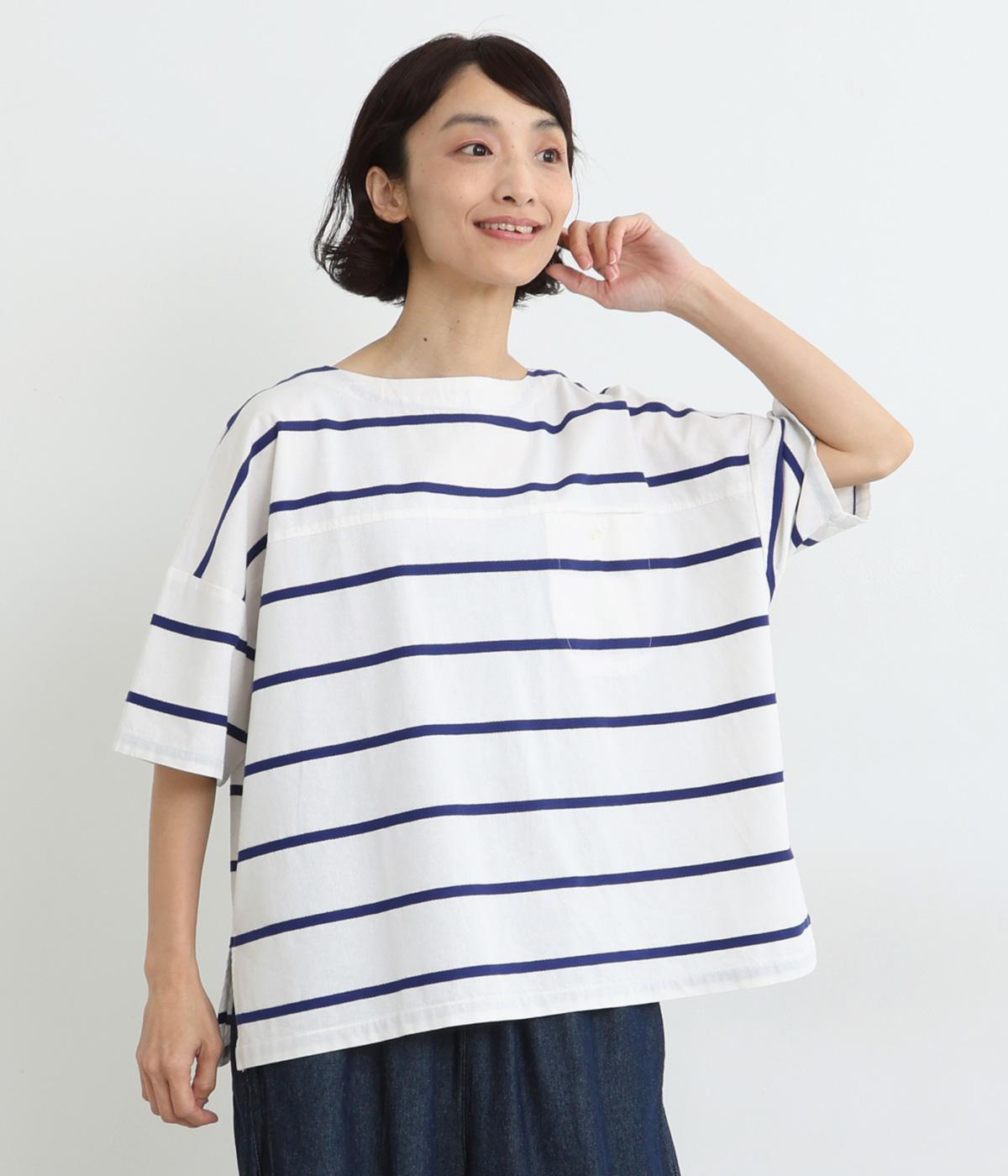 平織コットン微起毛 マオカラー釦プルオーバーアイボリー×ネイビー
