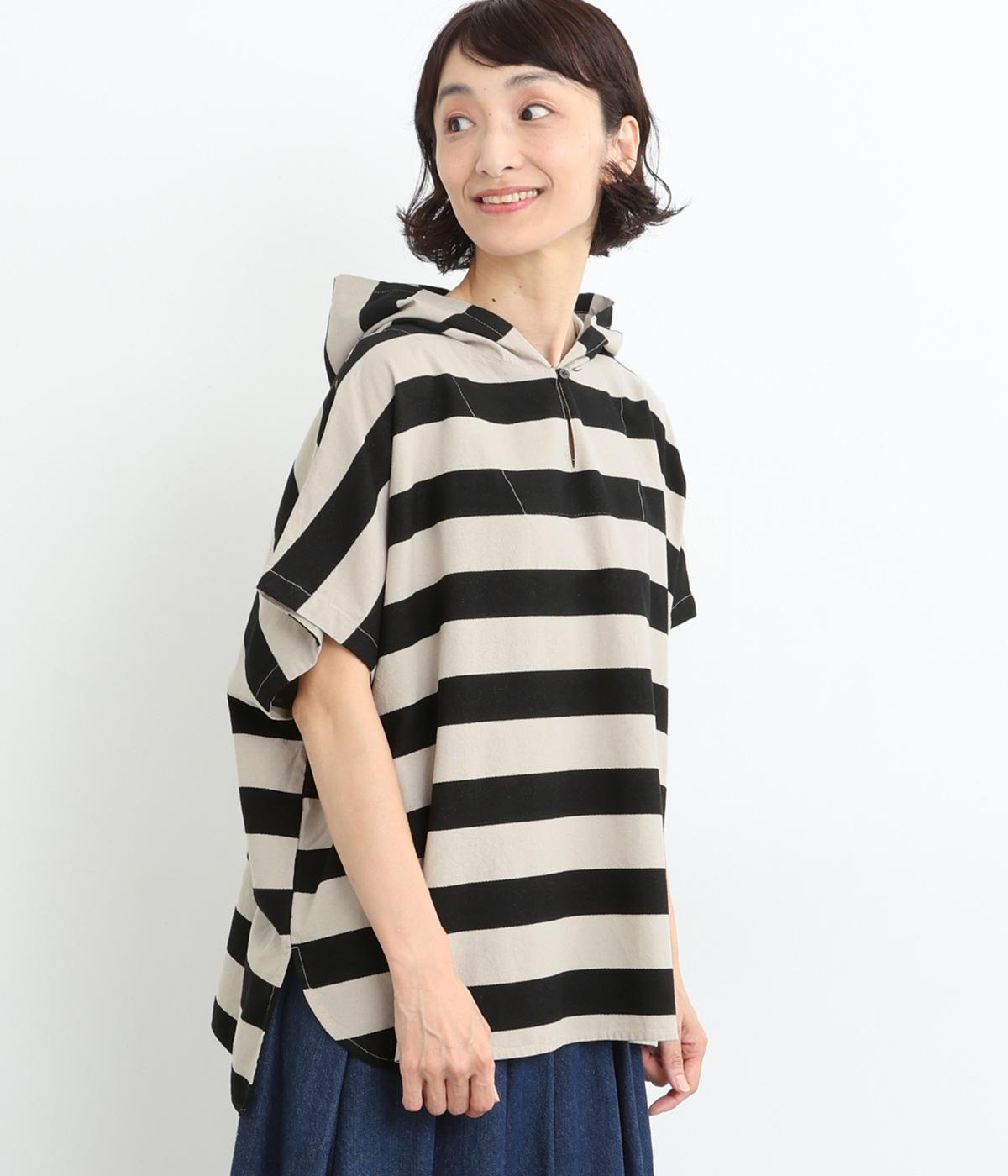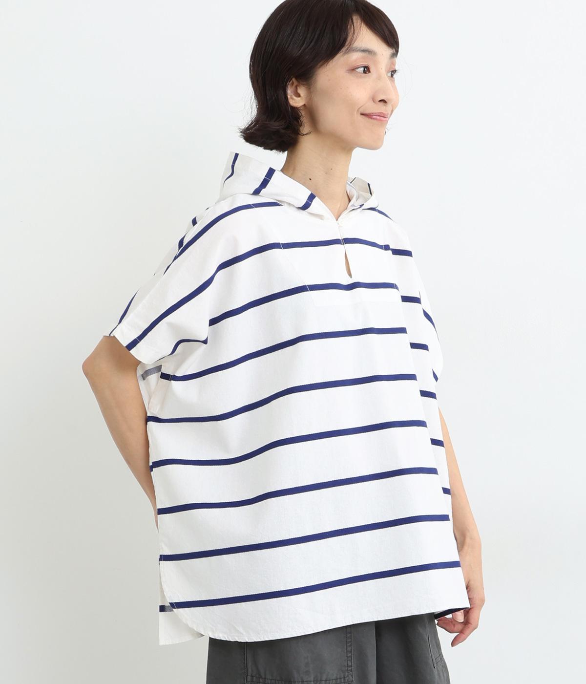 リネンコットンデニムフード付き前あきブラウスインディゴ