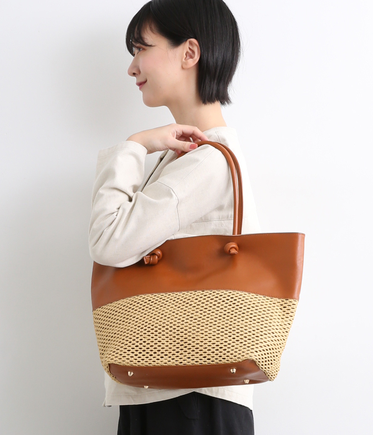 牛革メッシュ編みトートLブラウン