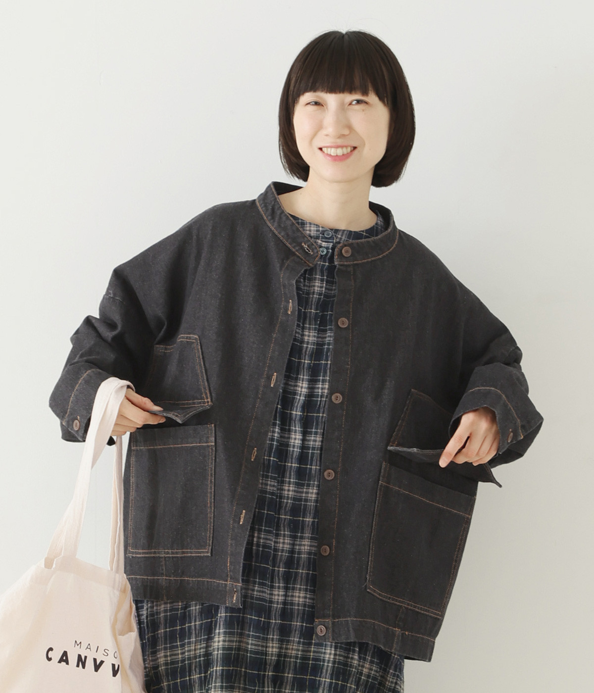 やわらかデニム変形ポケットチュニックジャケットワンウォッシュ