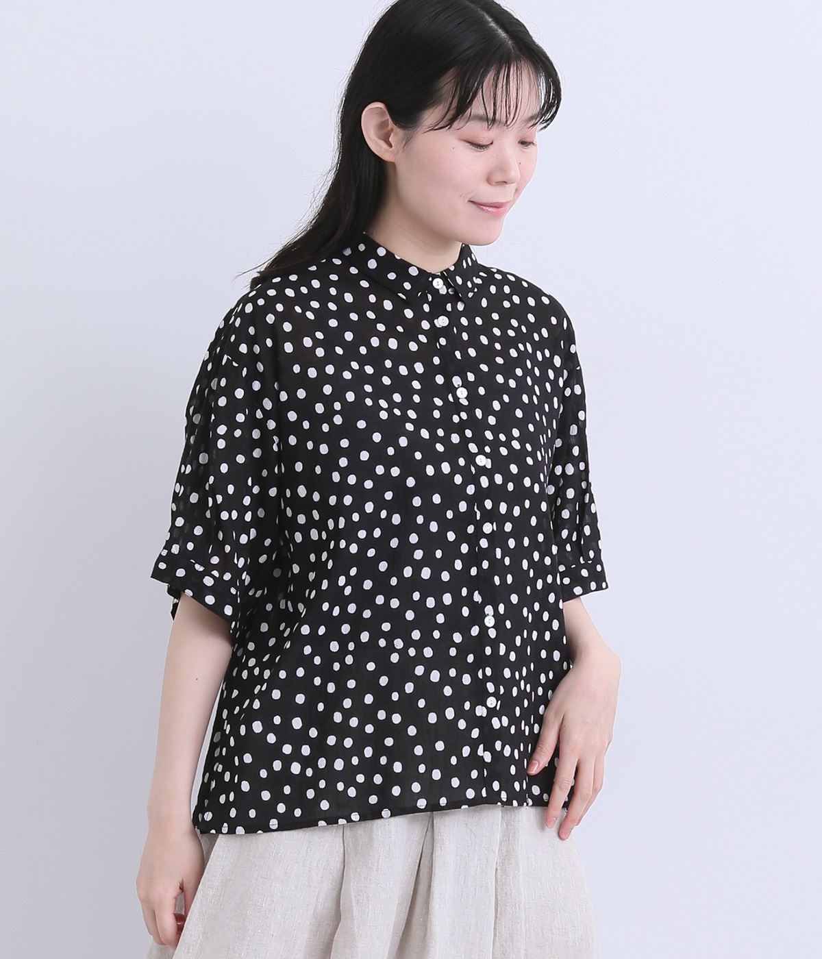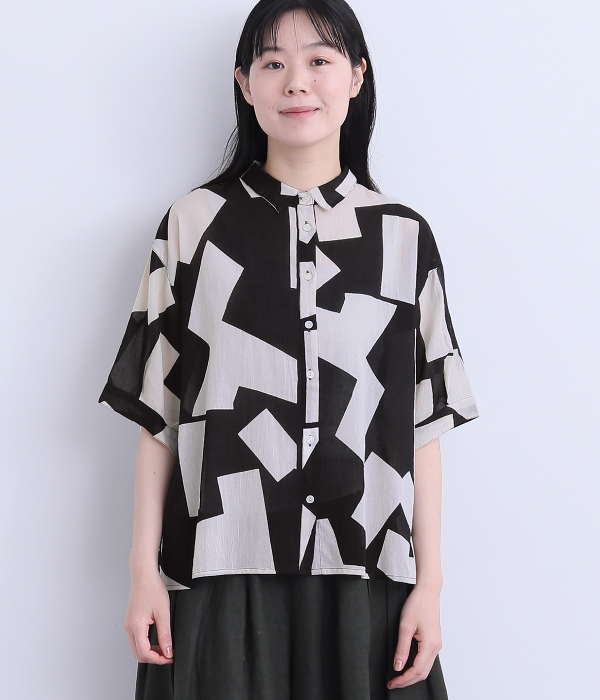 ヴィンテージ加工鳥プリントレギュラーシャツブラック×ホワイト
