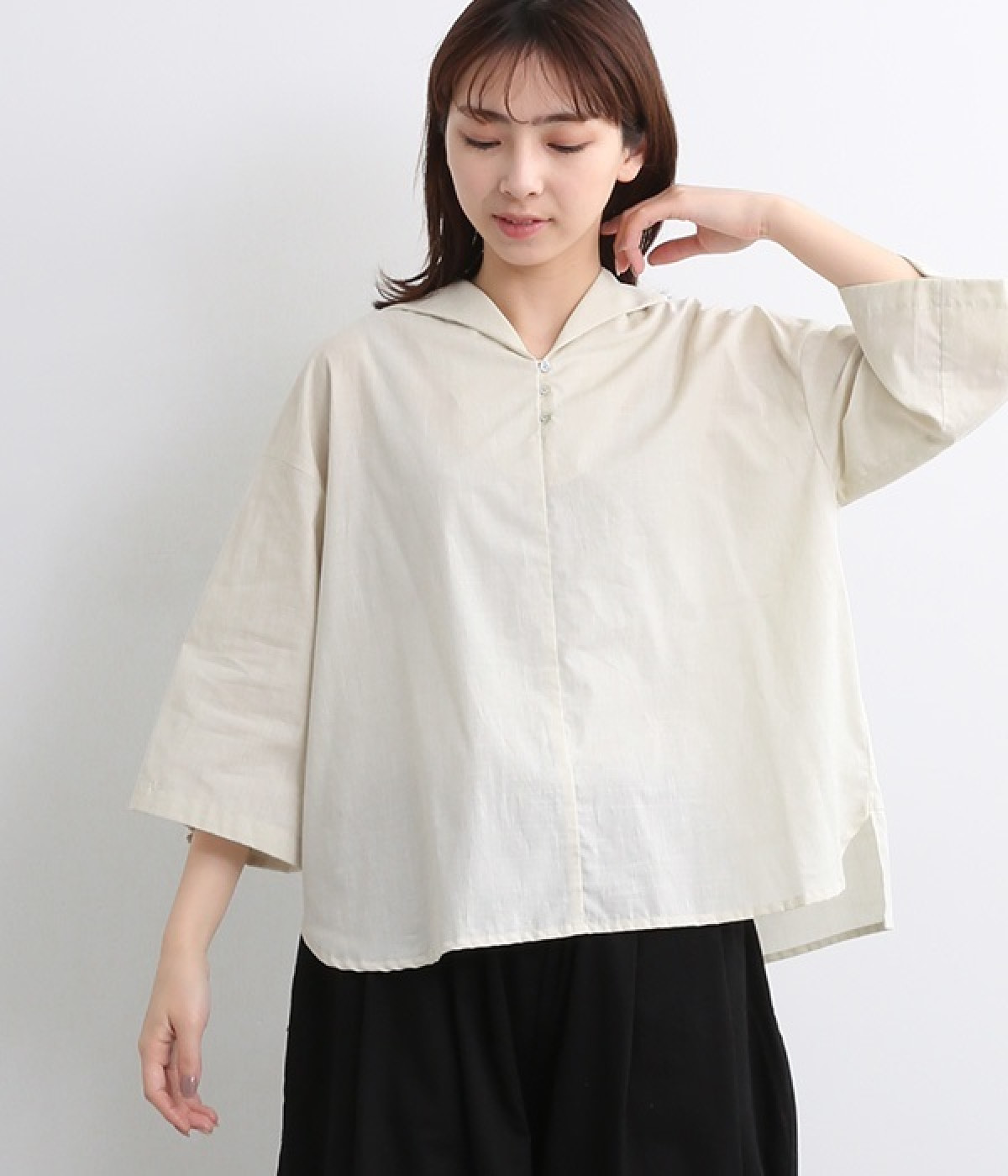 キュプラレーヨン後ろギャザードルマンスリーブ前開きブラウスライトグレー