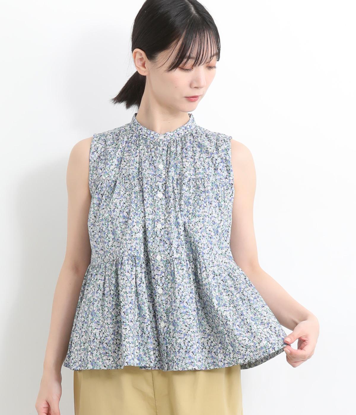コットンウールディンプルリファインギンガム襟フリルブラウスブルー×グレー