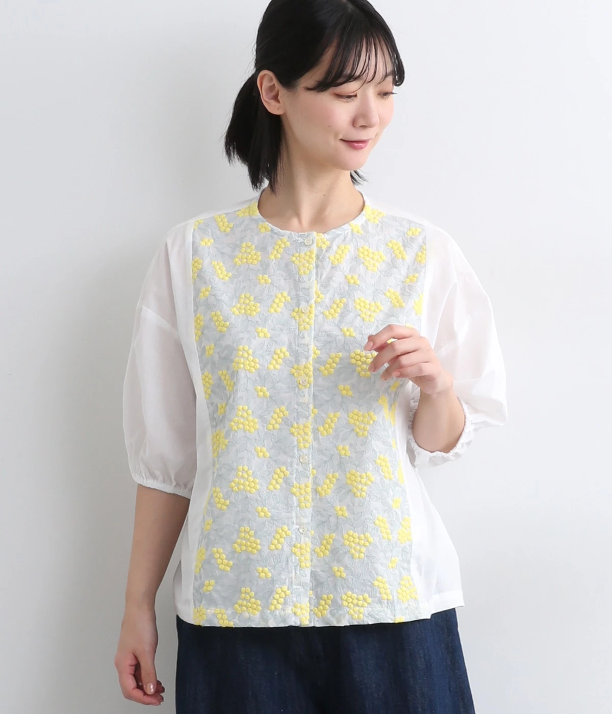 コットンタイプライターエンブロイダリ―ブラウスブルー