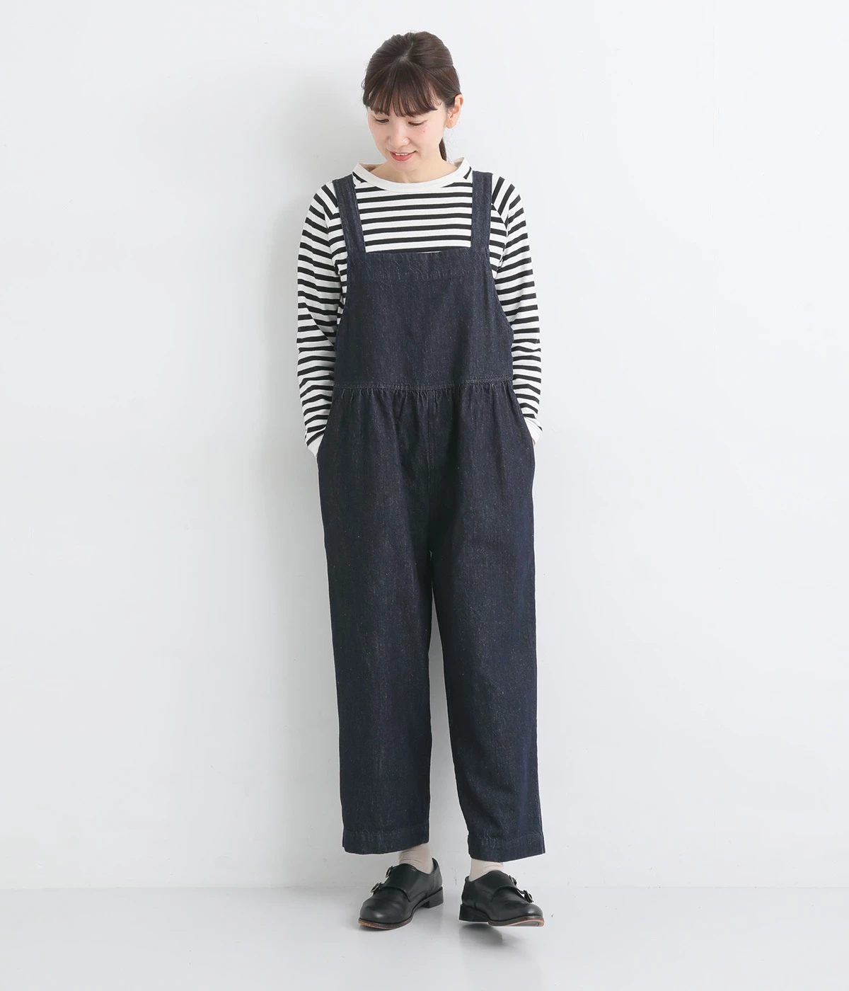 リネンコットンデニム後ボタンジャンパースカートインディゴ