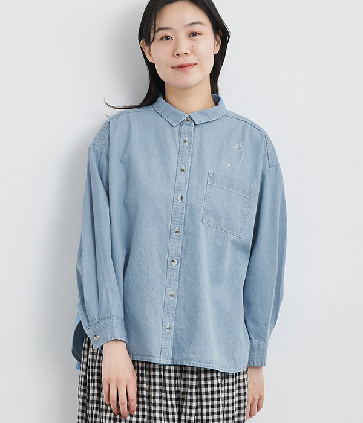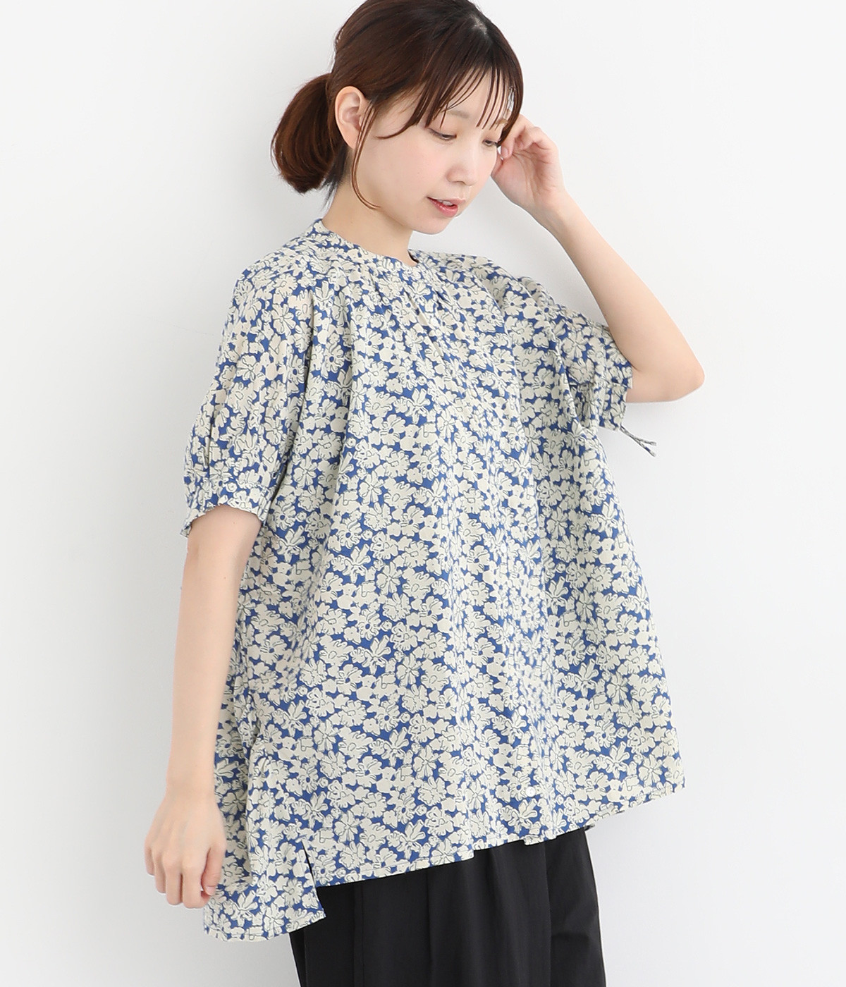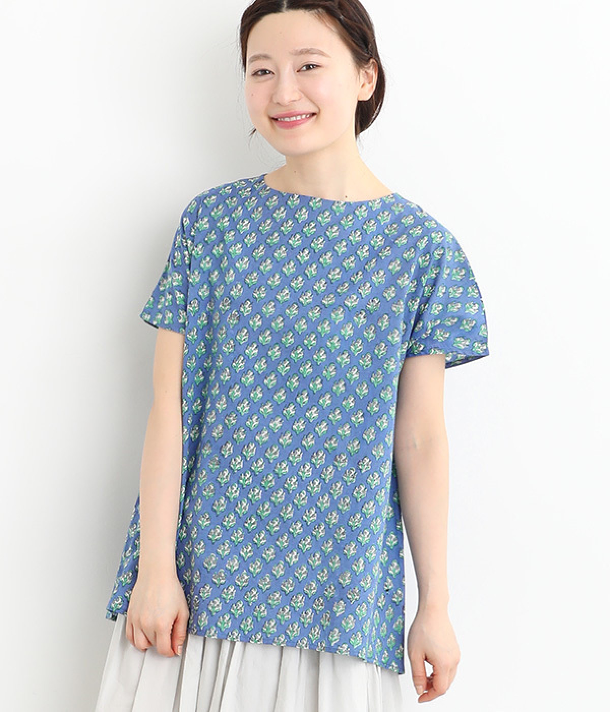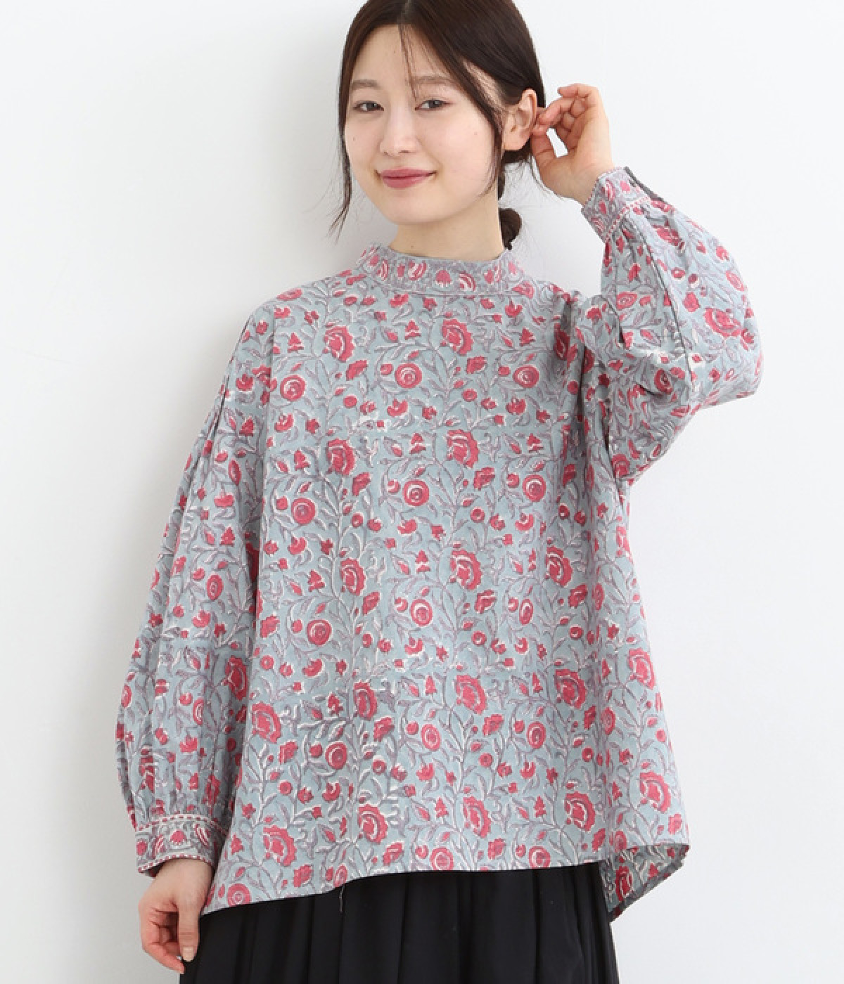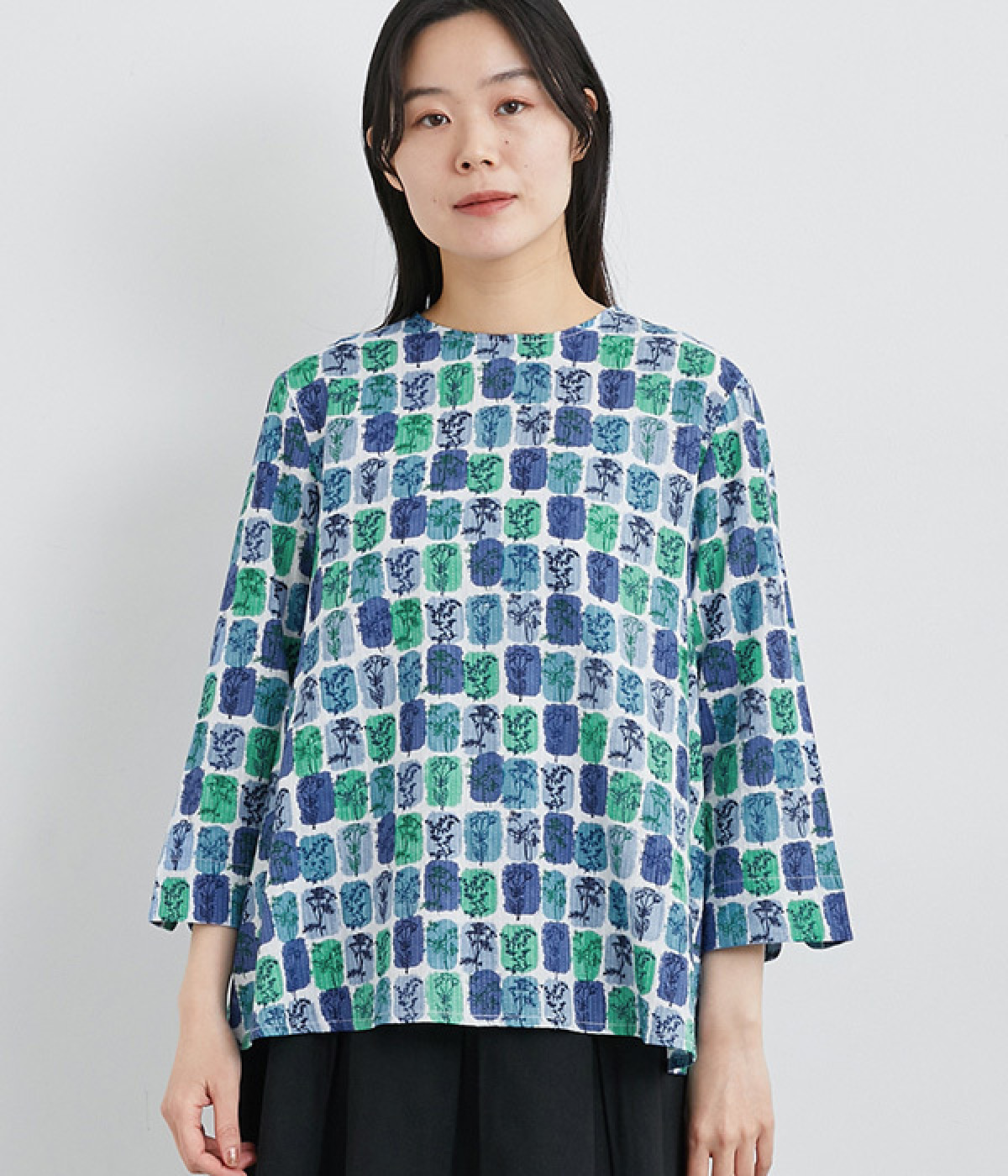 IROIROブロックプリント起毛コットン2wayブラウスブルー
