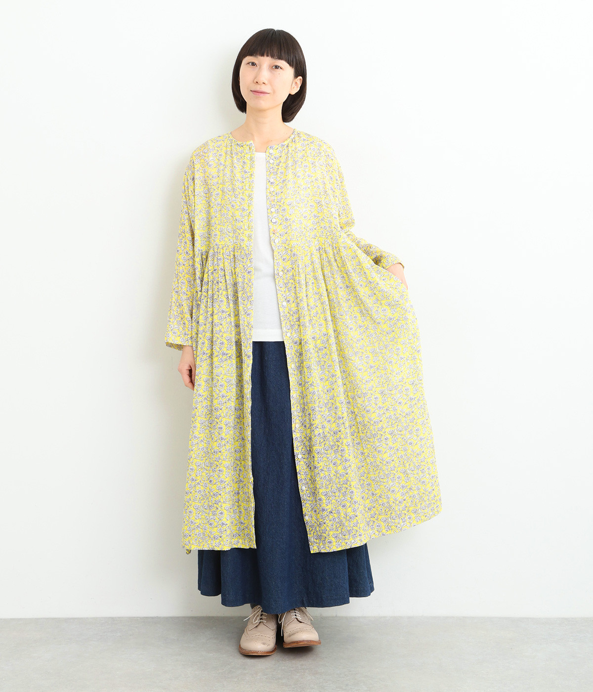 フローラルブロックプリントコットン前開ワンピースイエロー