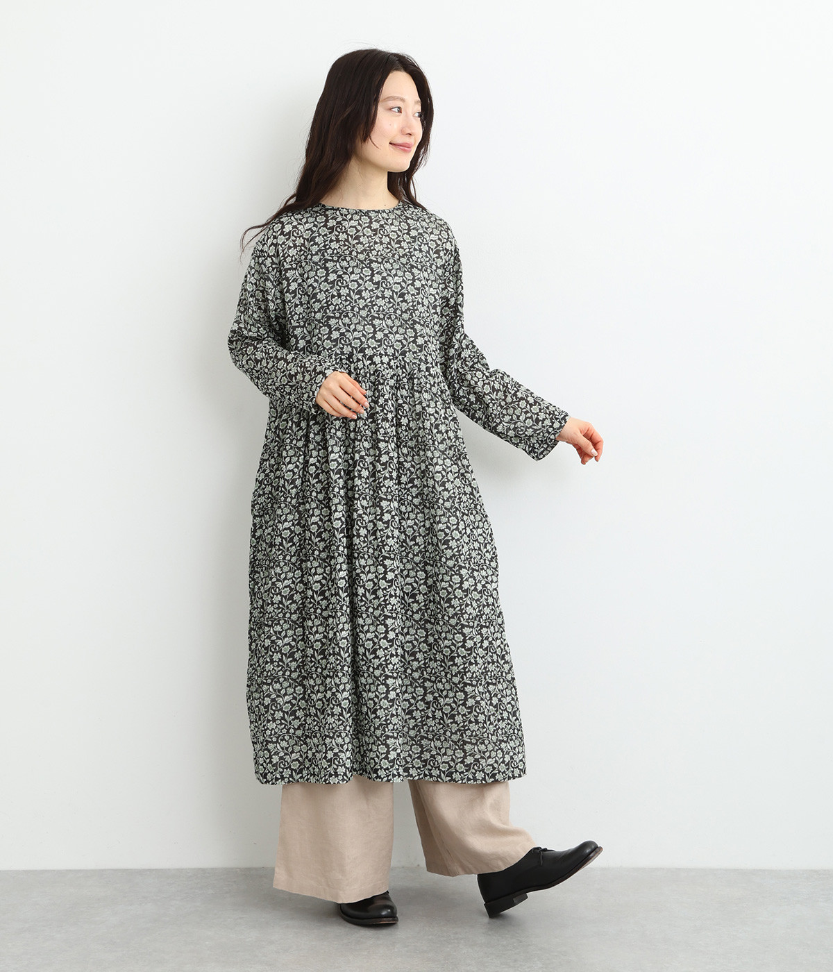 ボタニカルプリントコットンダブルガーゼ前開ワンピースブラック