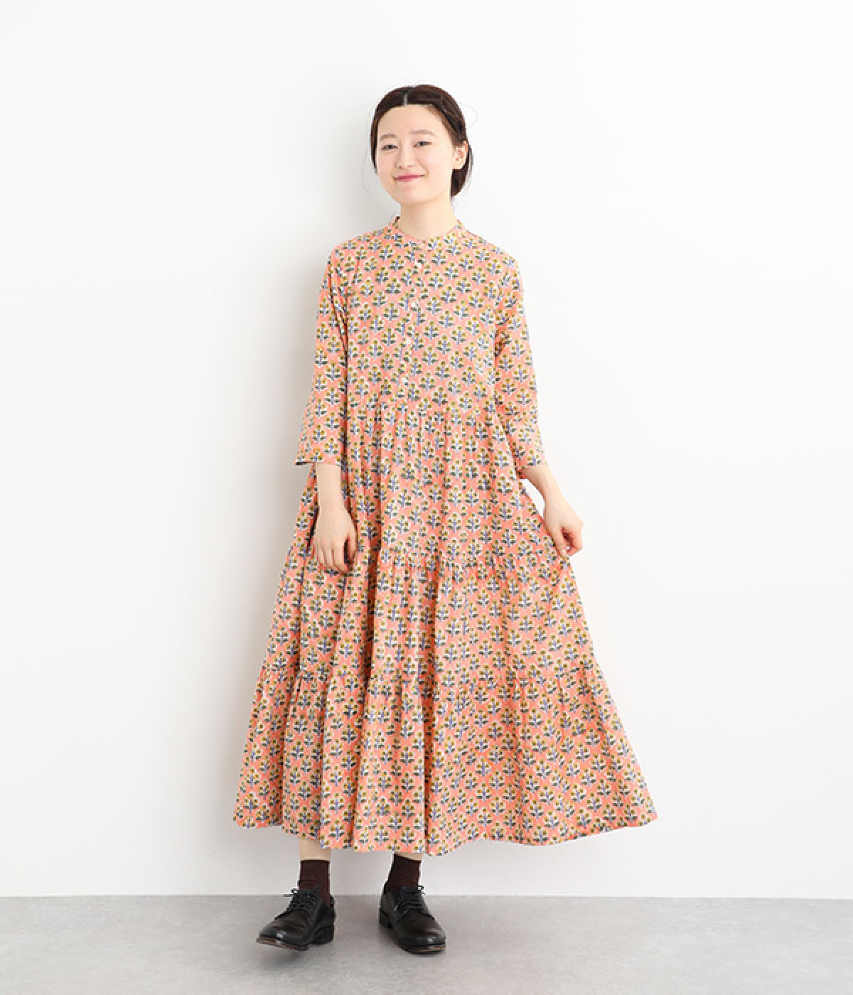 IROIROブロックプリント起毛コットン前開ワンピースオレンジ