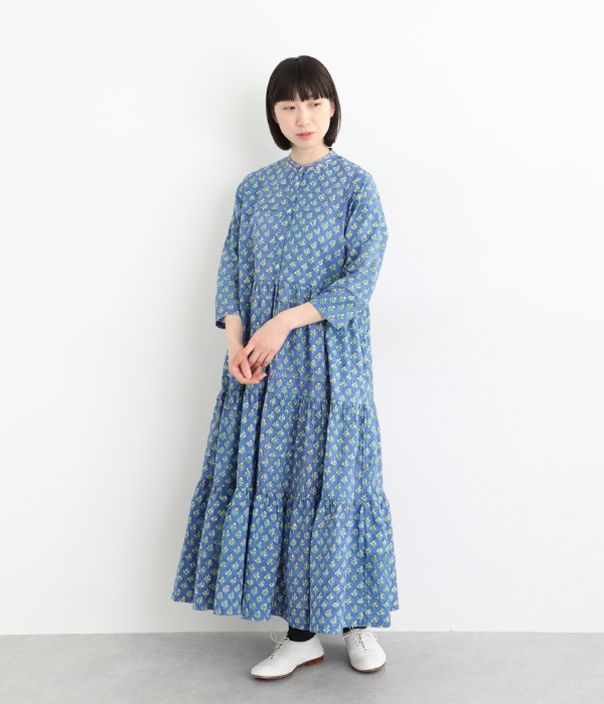 IROIROブロックプリント起毛コットン前開ワンピースブルー