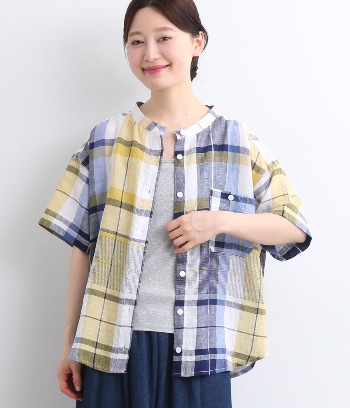 先染リネンチェック柄バンドカラーワンポケ猫目釦半袖シャツイエロー×ブルー