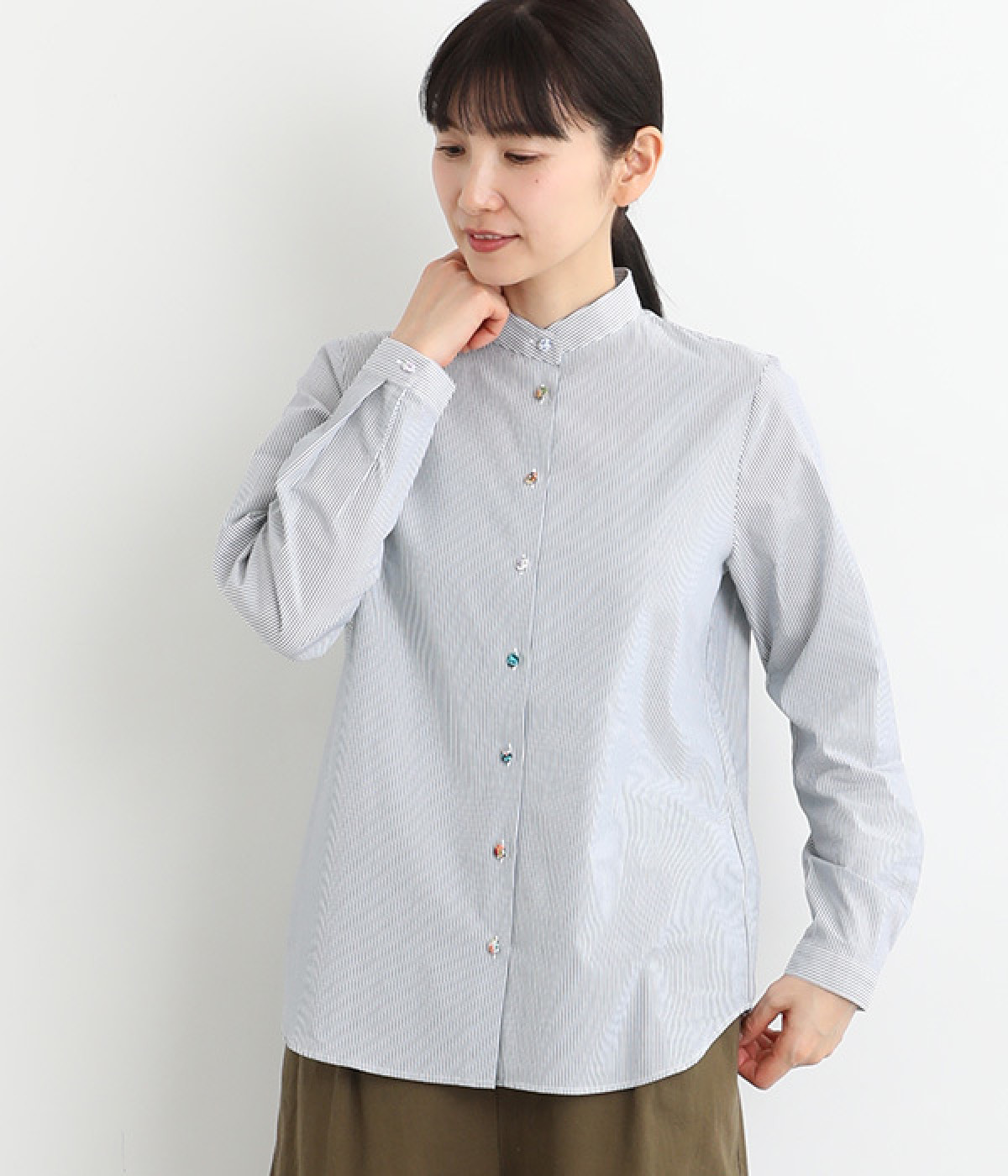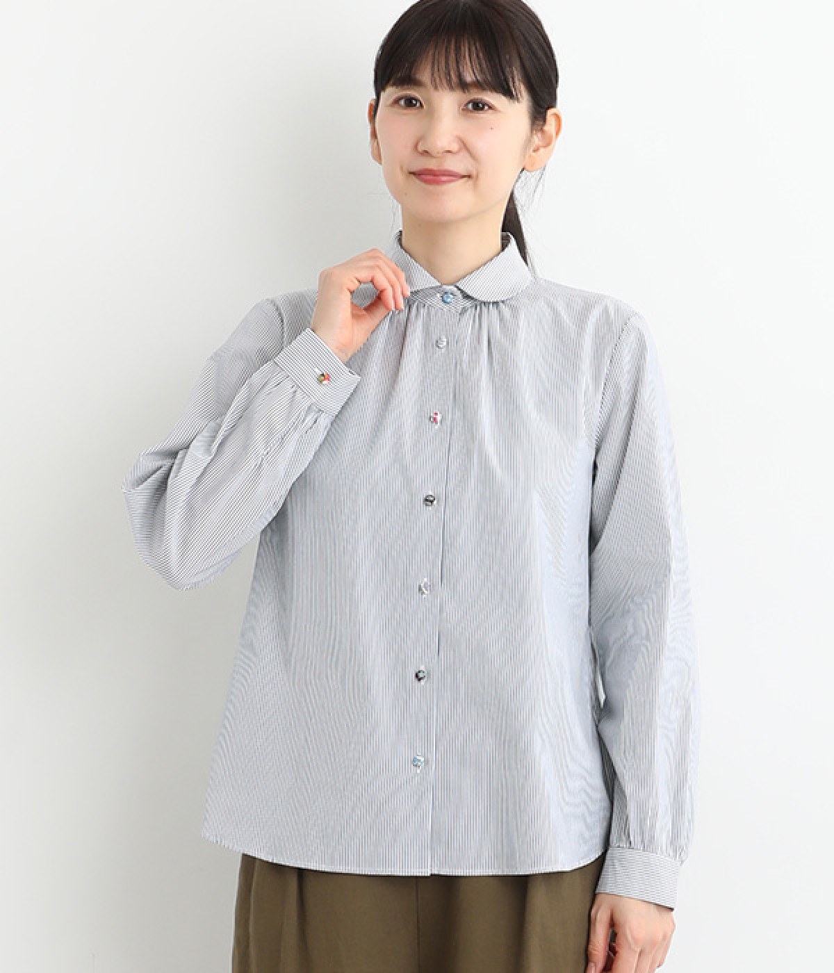 コットンリバティアソートくるみ釦重ね襟裾ラウンドカットシャツストライプ