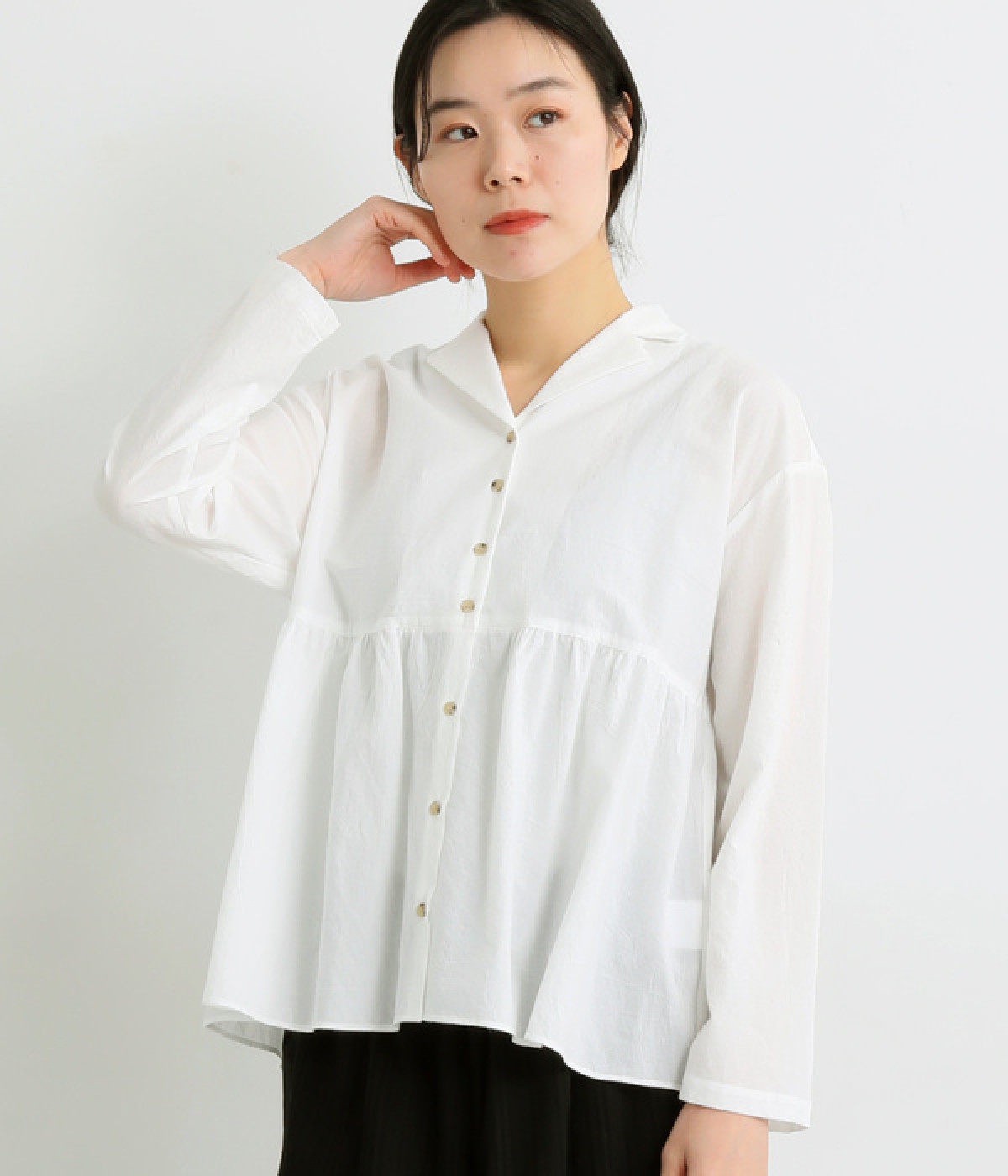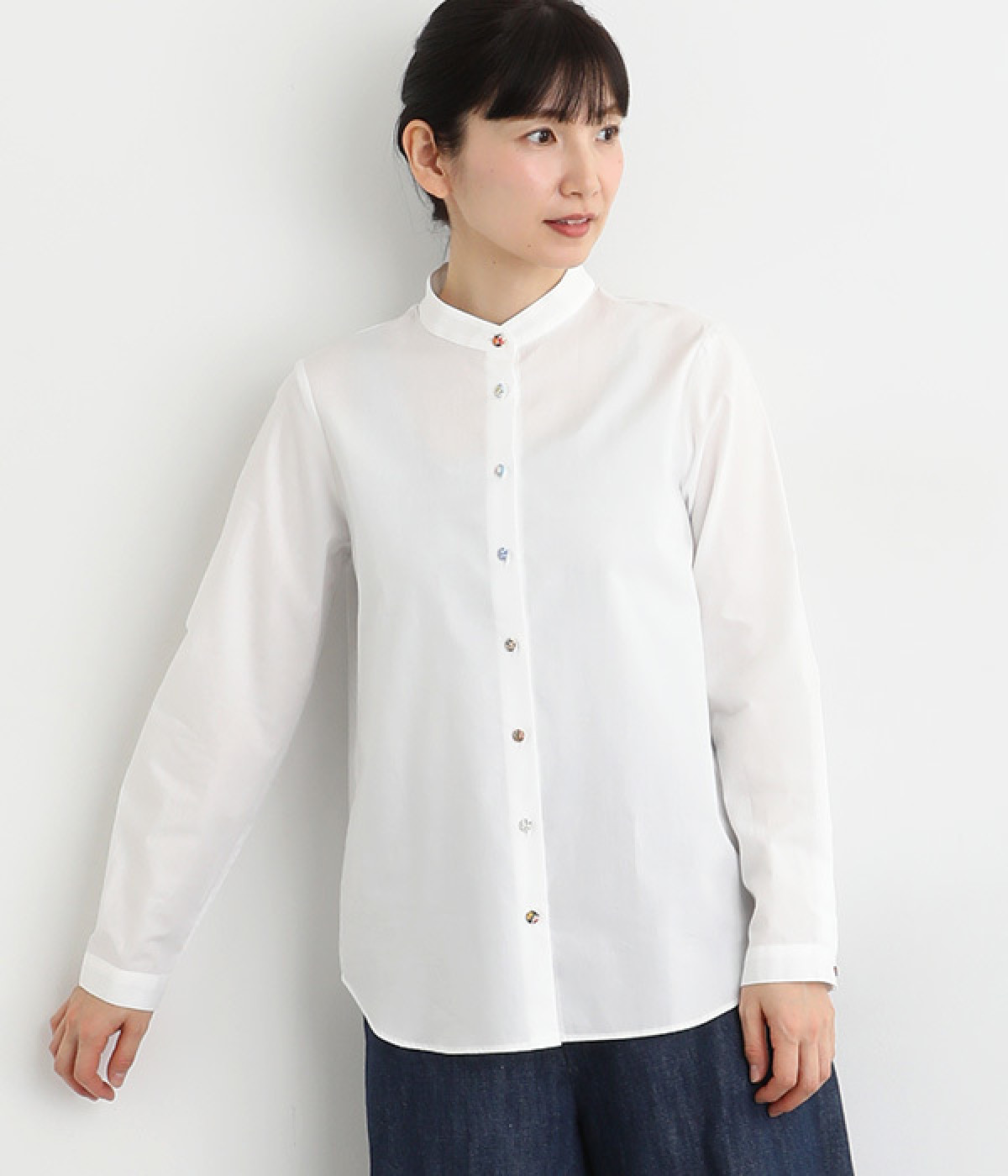 コットンリバティアソートくるみ釦重ね襟裾ラウンドカットシャツオフホワイト