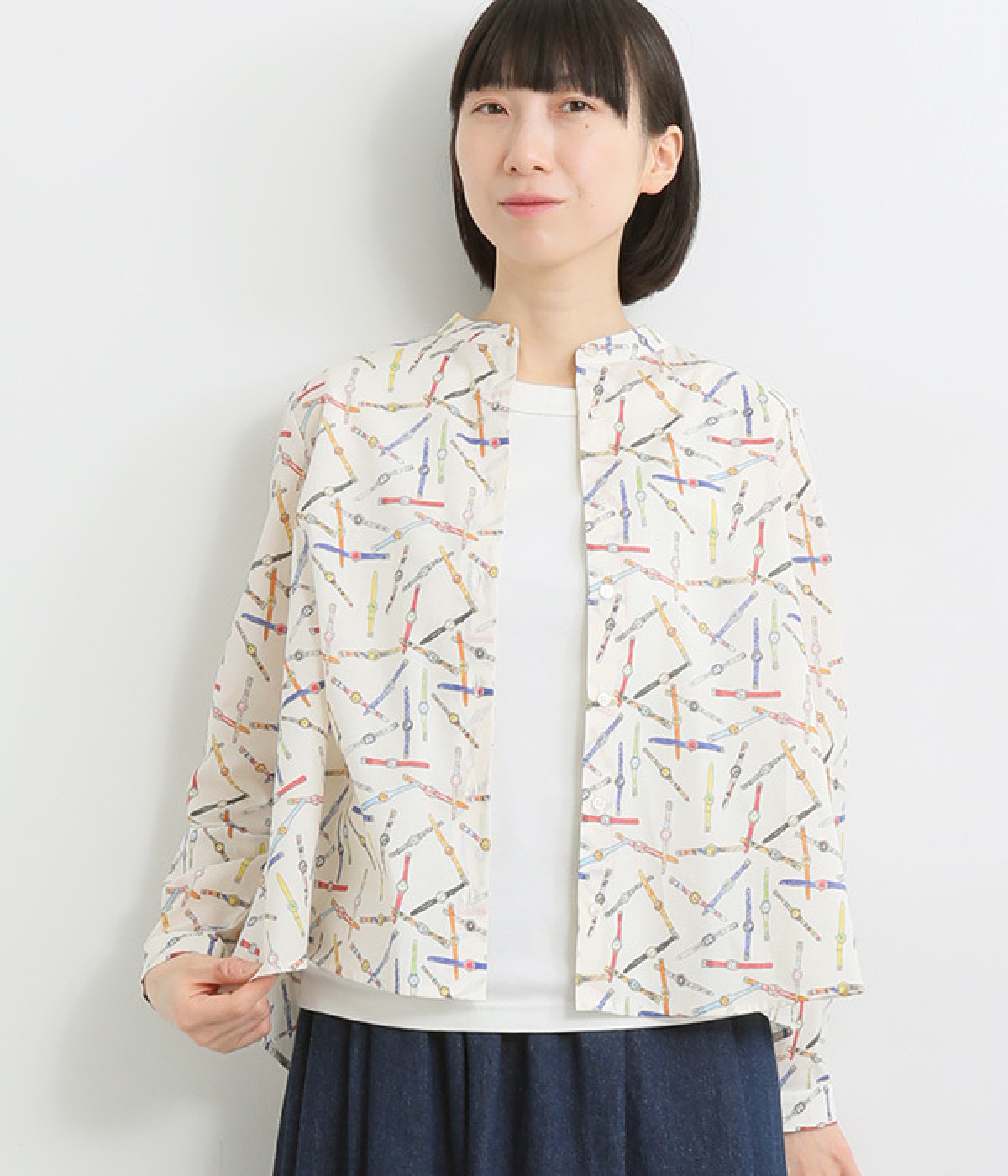 リバティアソートくるみ釦スタンドフリルドロップショルダーシャツオフ