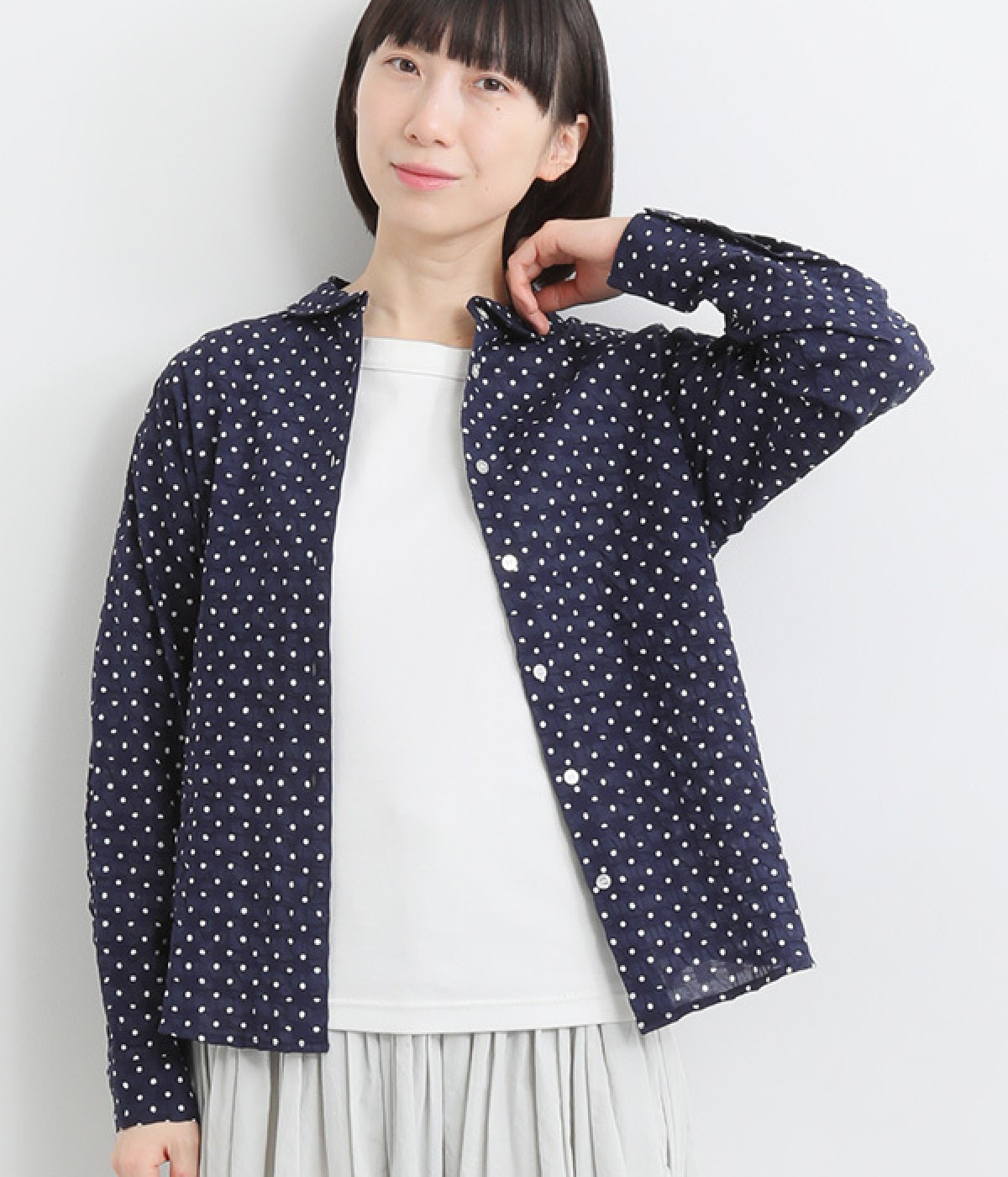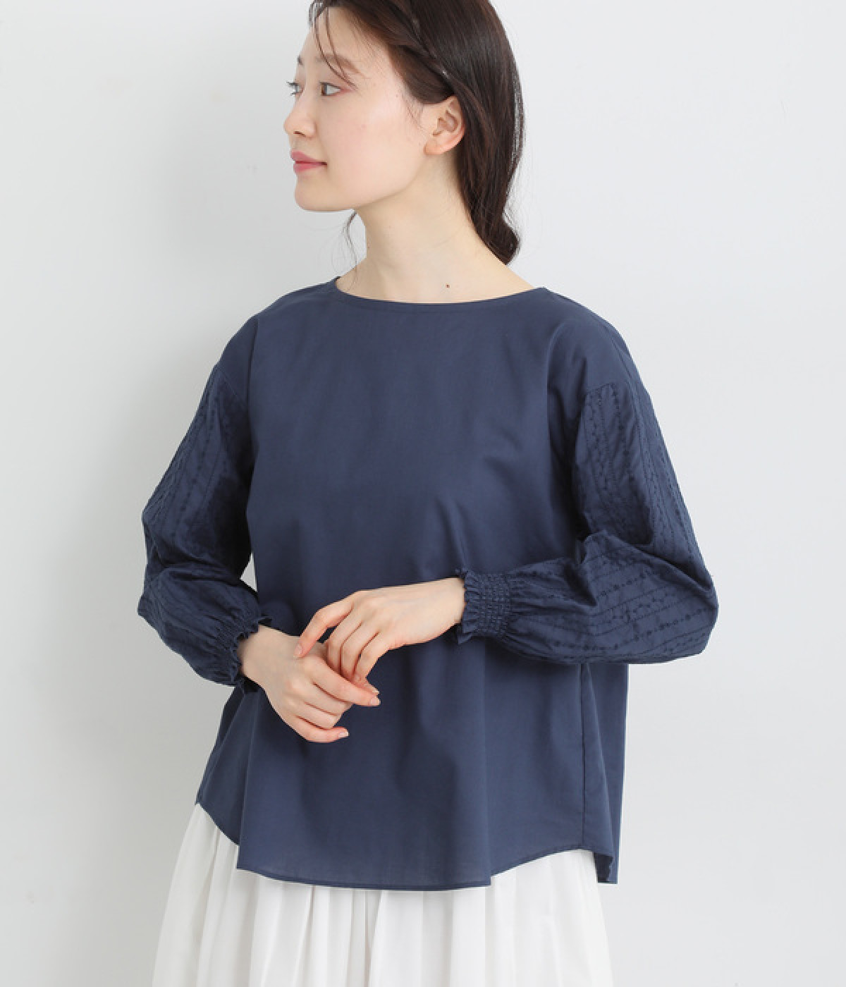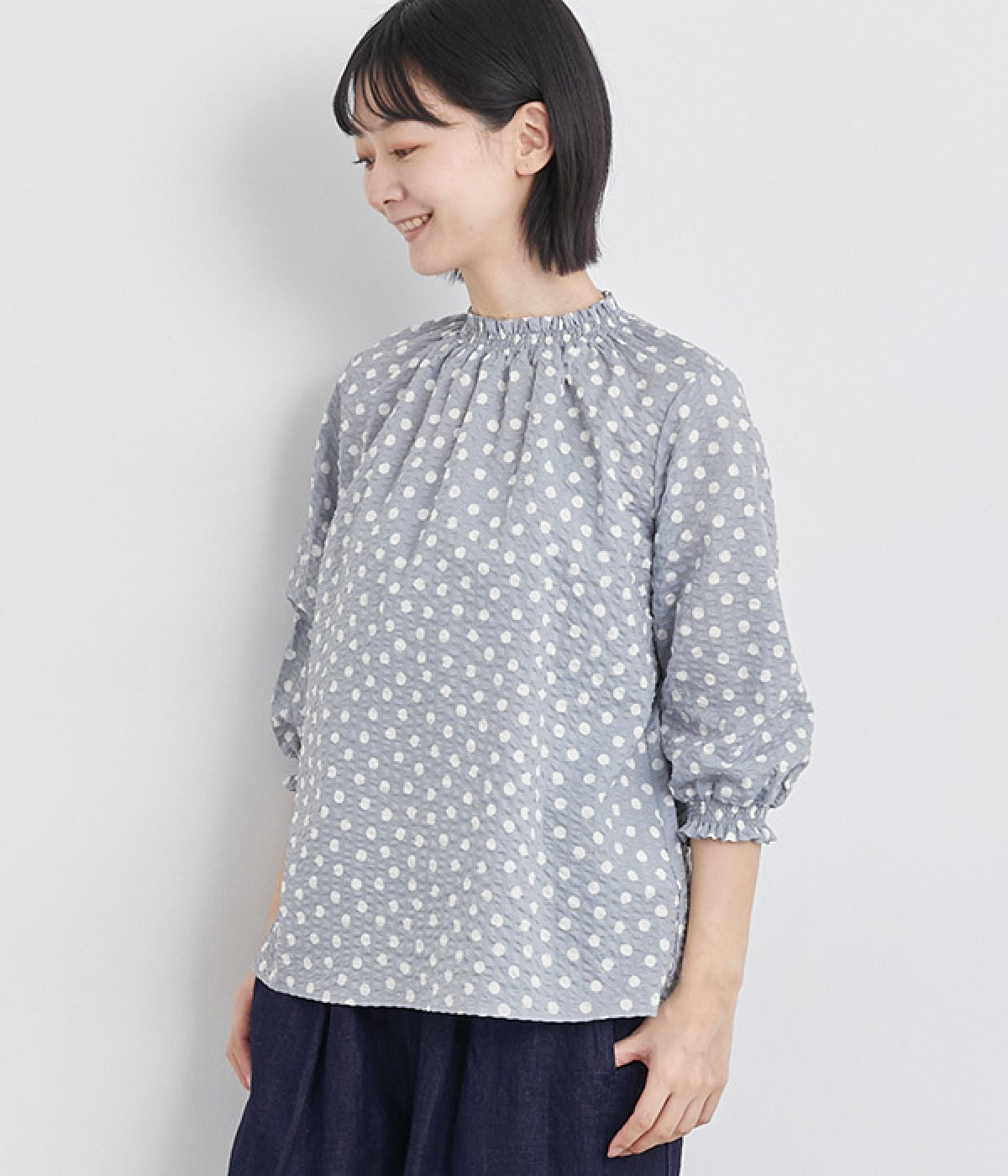コットンウールガーゼドット刺繍スタンドからープルオーバーブラウスネイビー