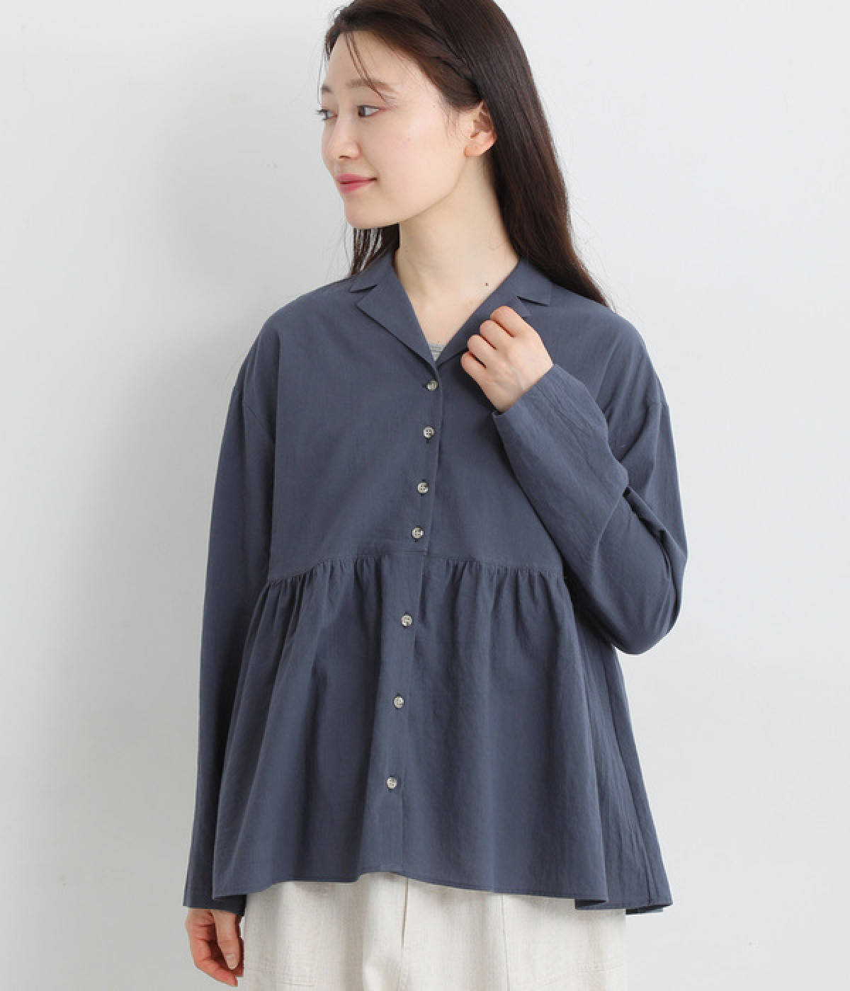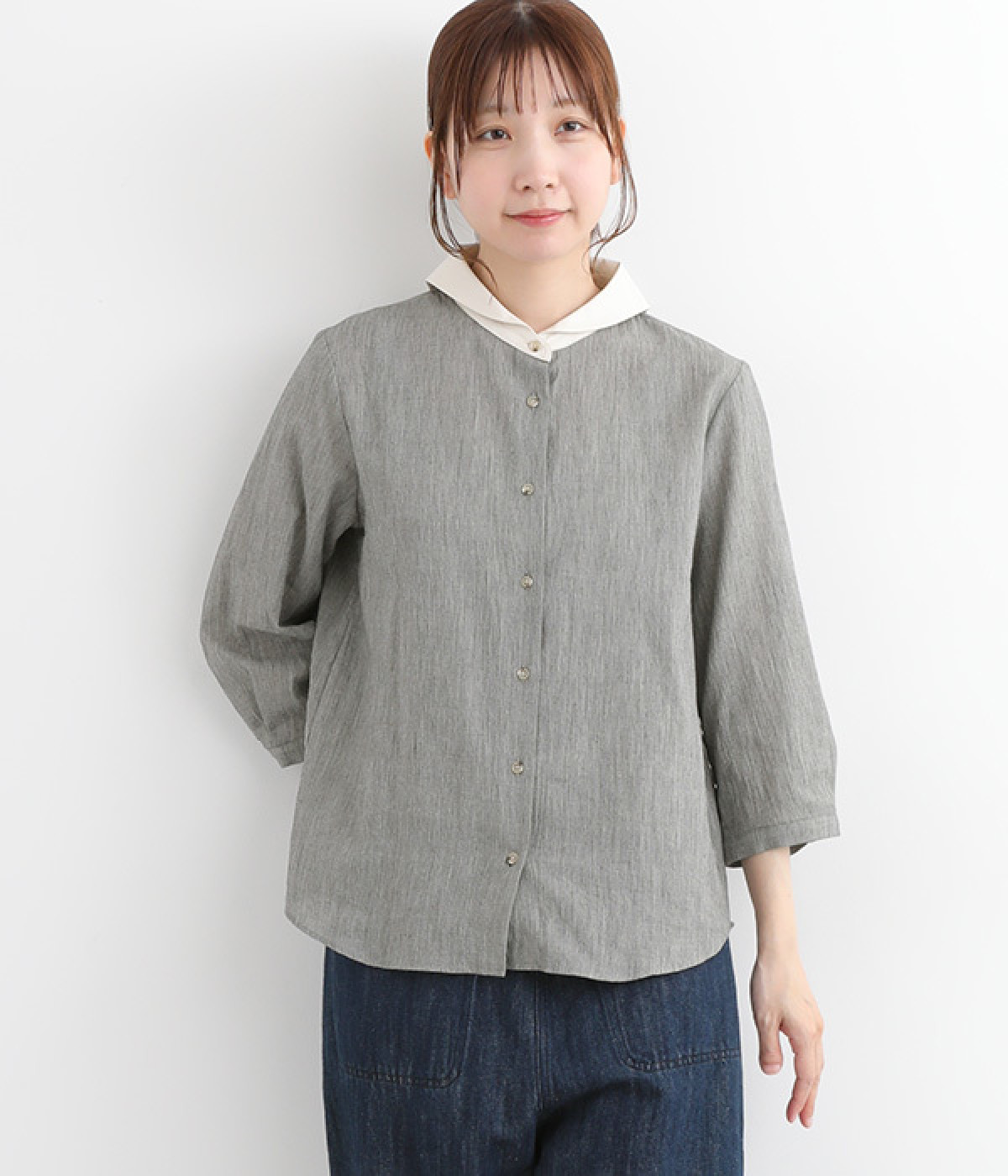 コットンレーヨンスタンドカラーシャーリング袖ブラウスグレー系