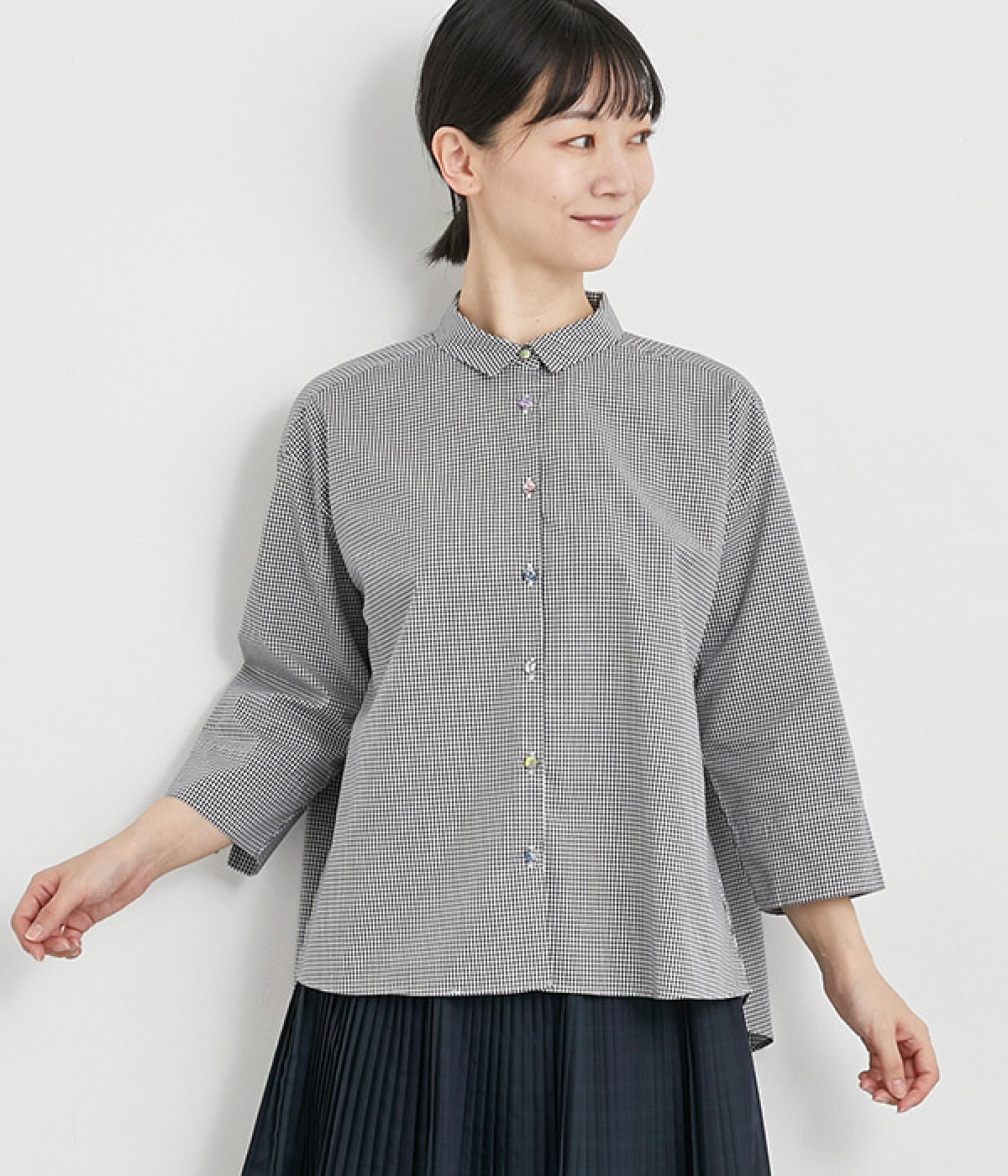 コットンリバティアソートくるみ釦重ね襟裾ラウンドカットシャツギンガムチェック