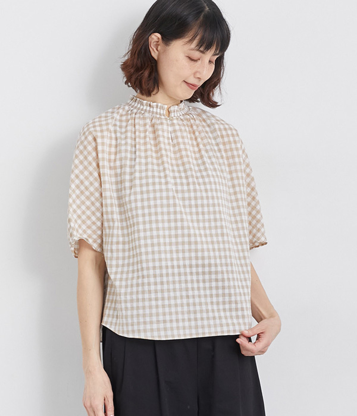 コットンローン文房具スタンドカラーAラインブラウスベージュ系