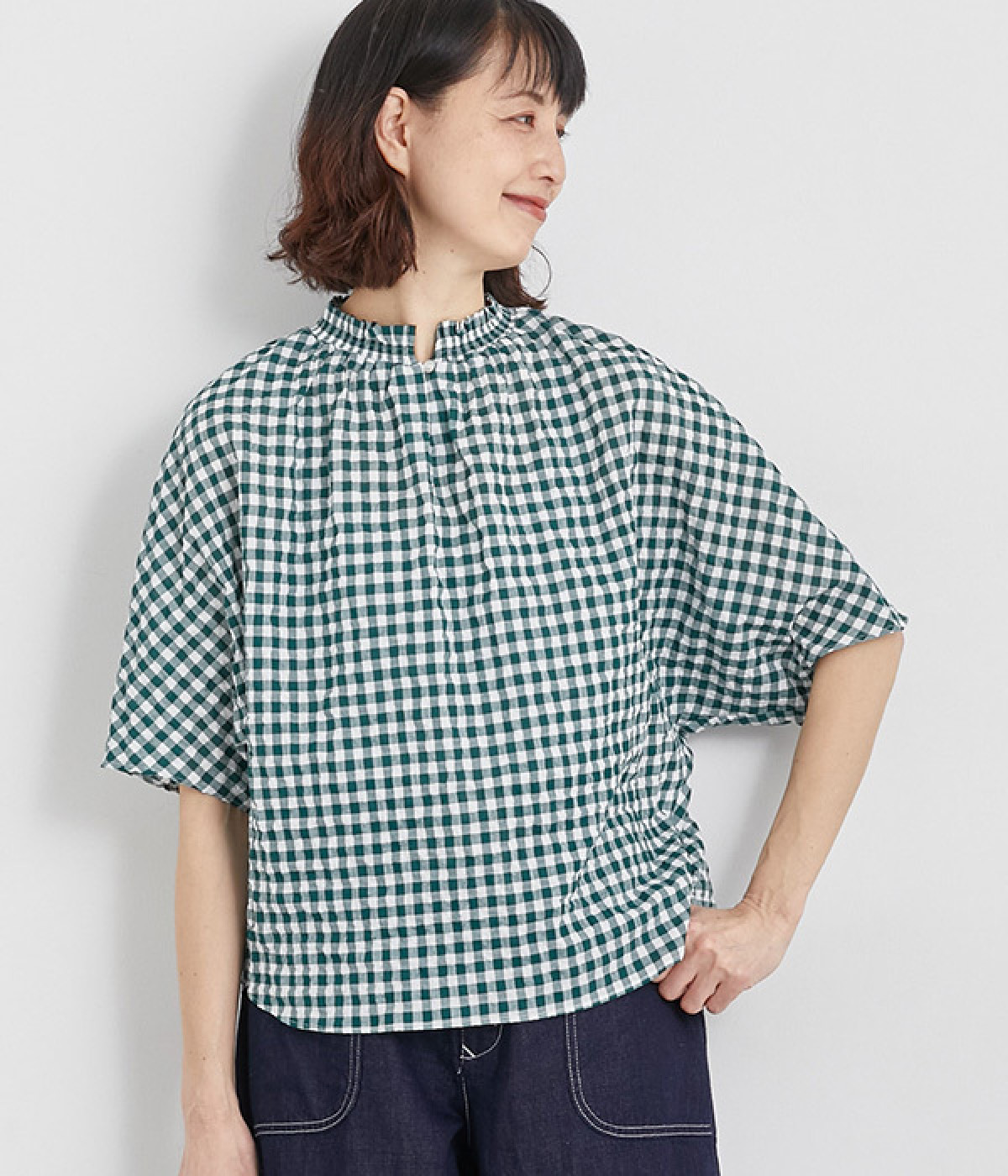 コットンレーヨンスタンドカラーシャーリング袖ブラウスグリーン系