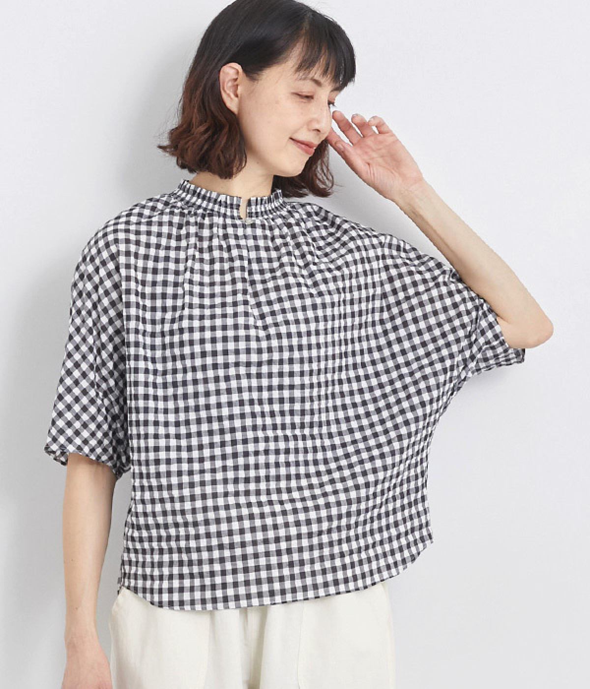 へリンボンシャーリングギャザーチュニックシャツモノトーンギンガム