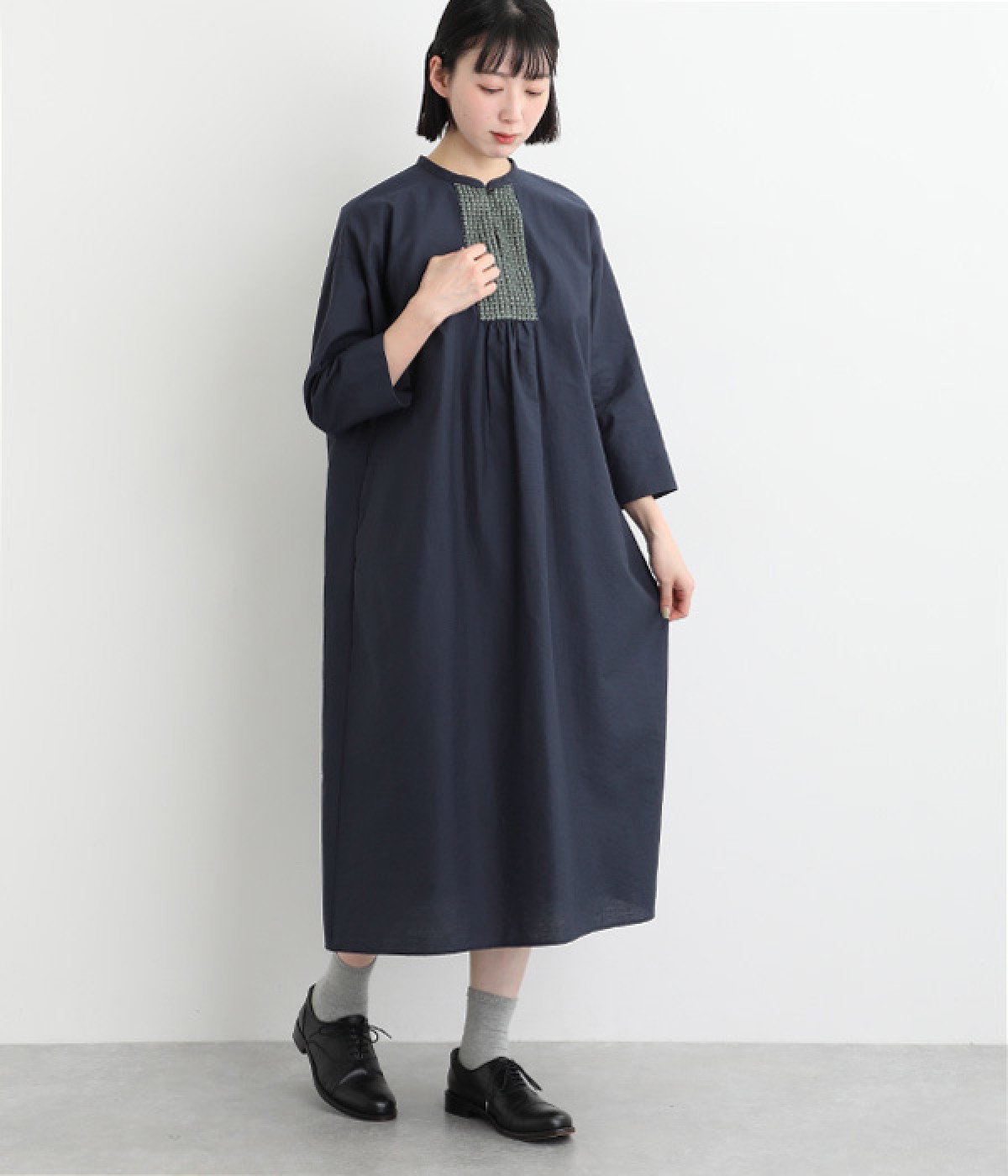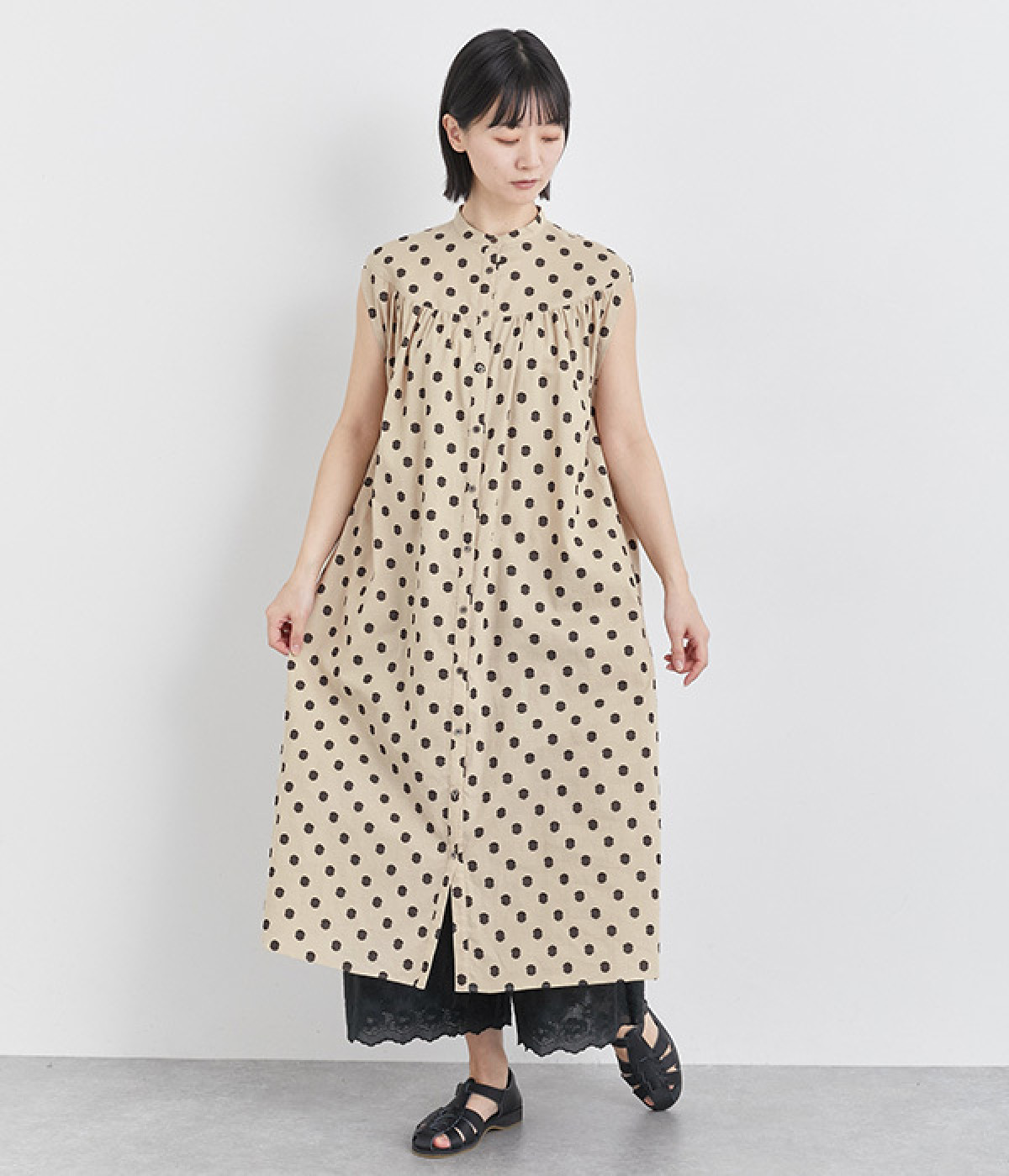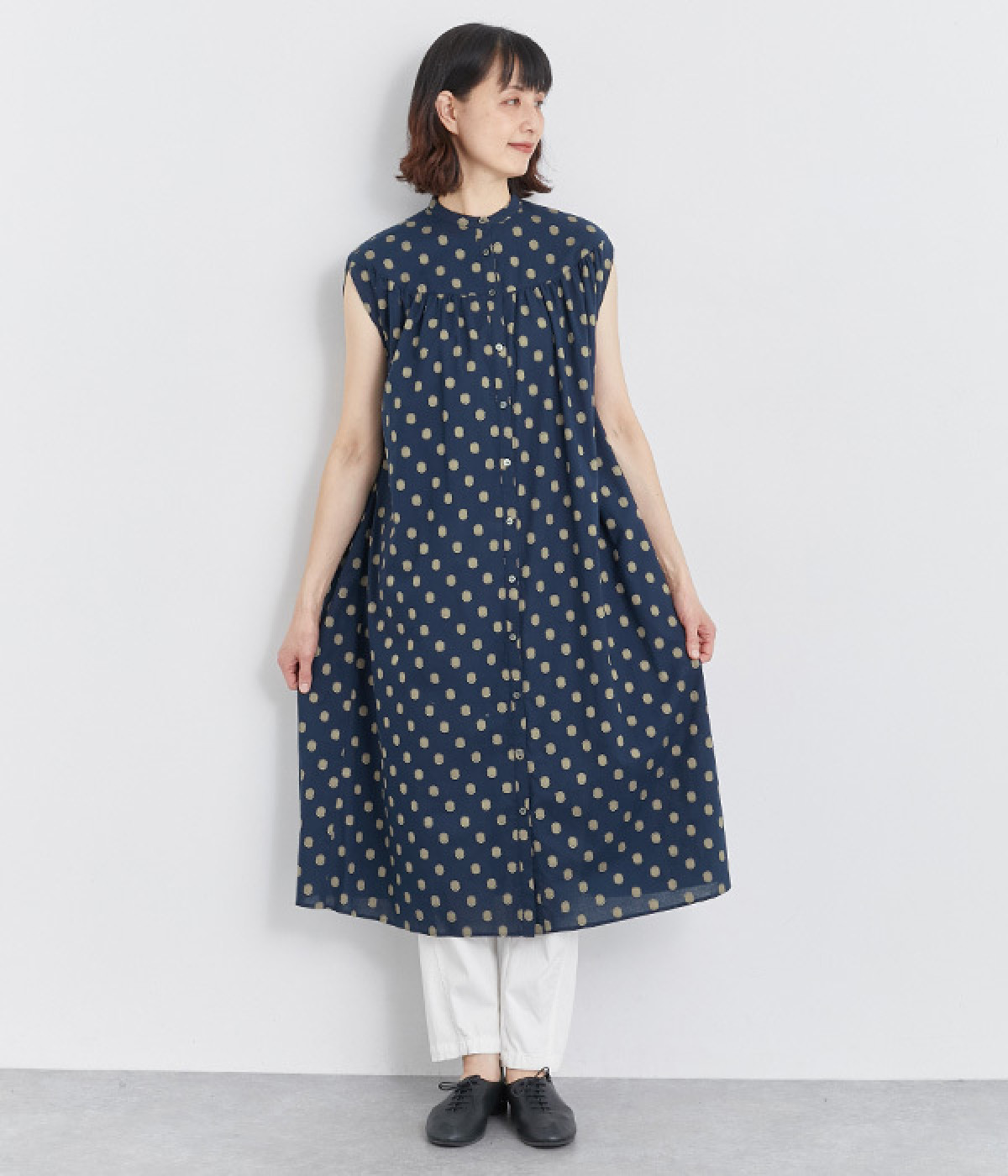 コットンローンフロッキードット前開きバッグタックフレアブラウスネイビーブルー