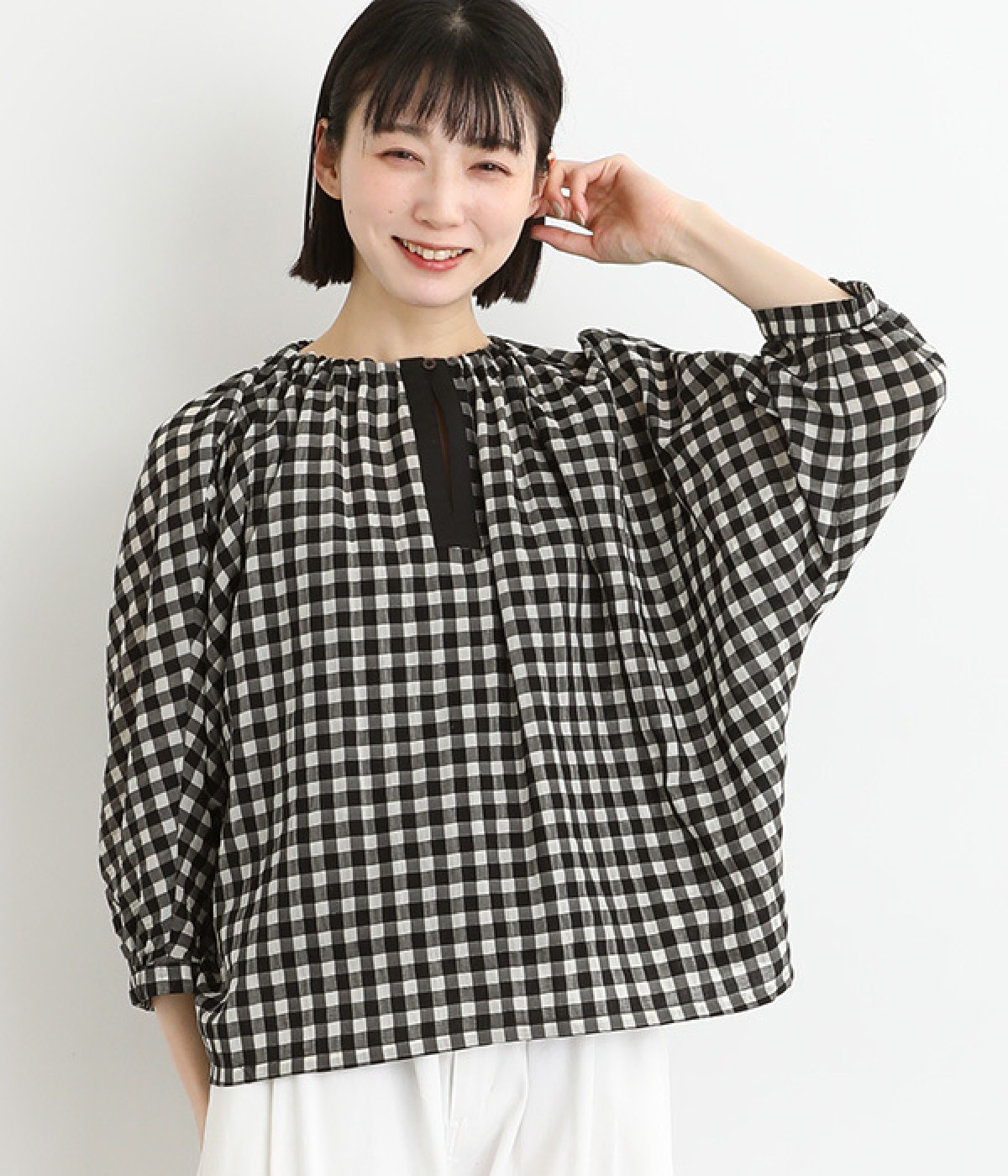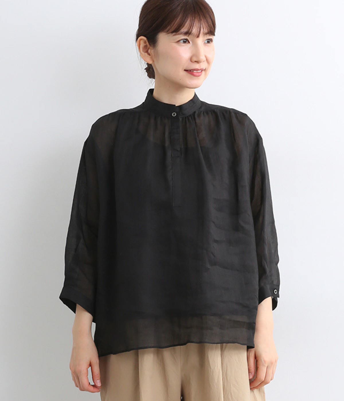 コットンローン袖ゴムコクーンプルオーバーブラウスブラック