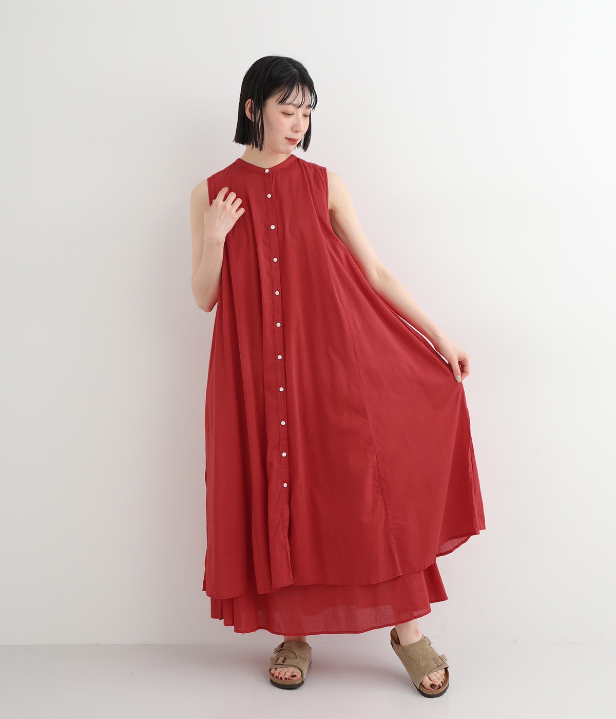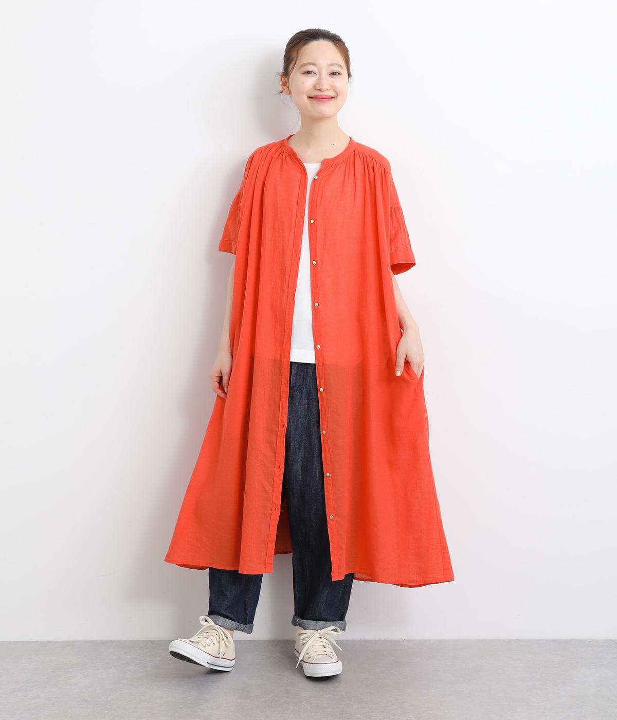 コットンリネン 5分袖多ボタンワンピーステラコッタ