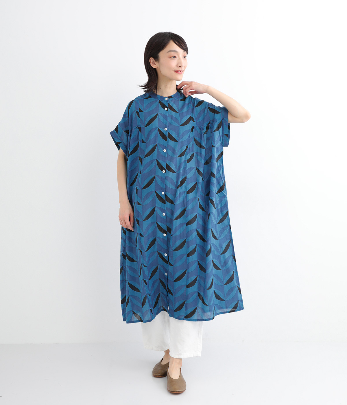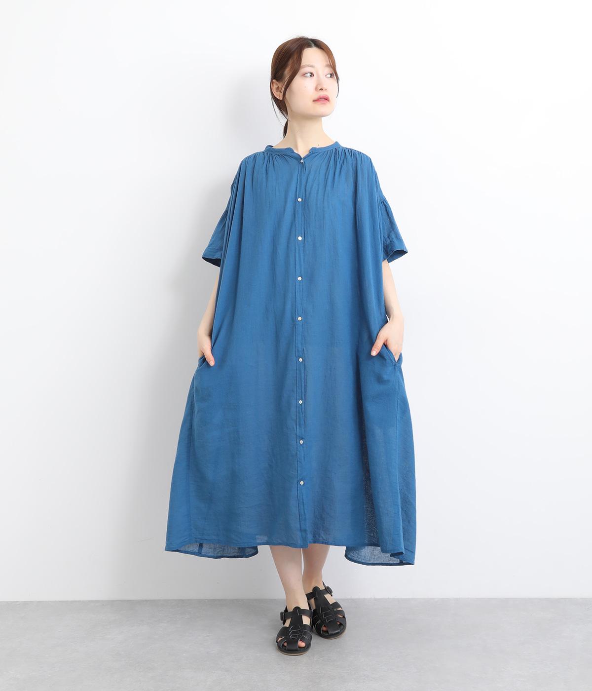 コットンリネン 5分袖多ボタンワンピースロイヤルブルー