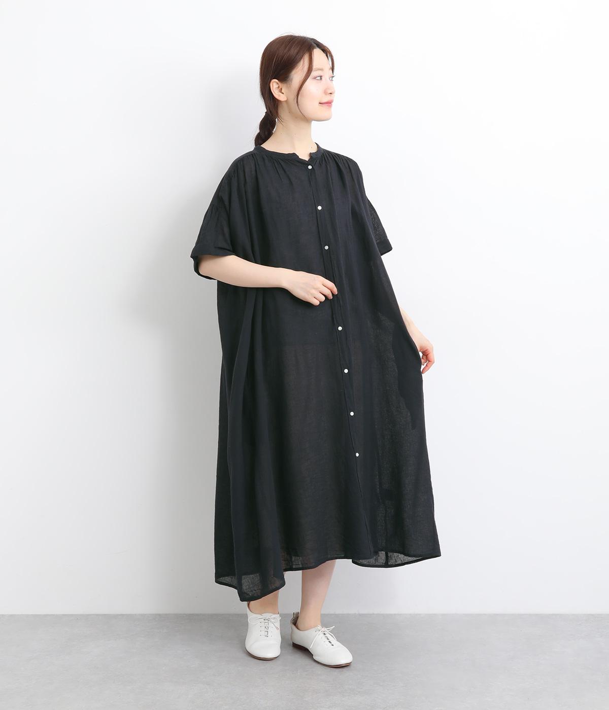 ブラッシュドコットンバンドカラープルオーバーワンピースブラック