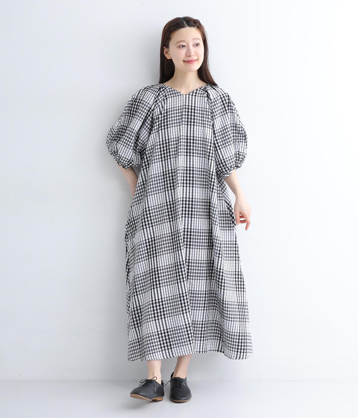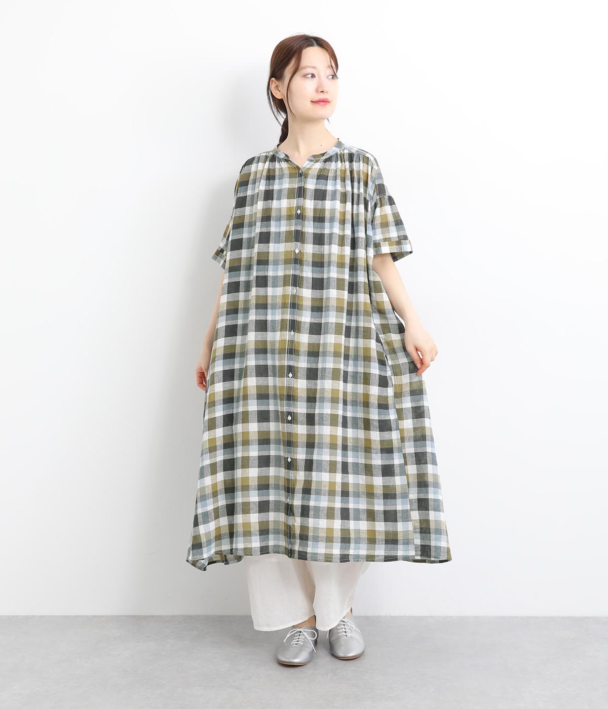 コットンリネンチェック ポケットギャザーワンピースギンガムチェック