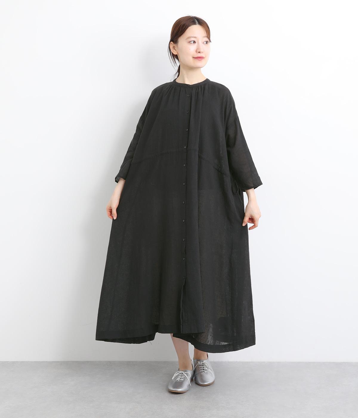 コットンリネンフリルネックプルオーバーワンピースブラック