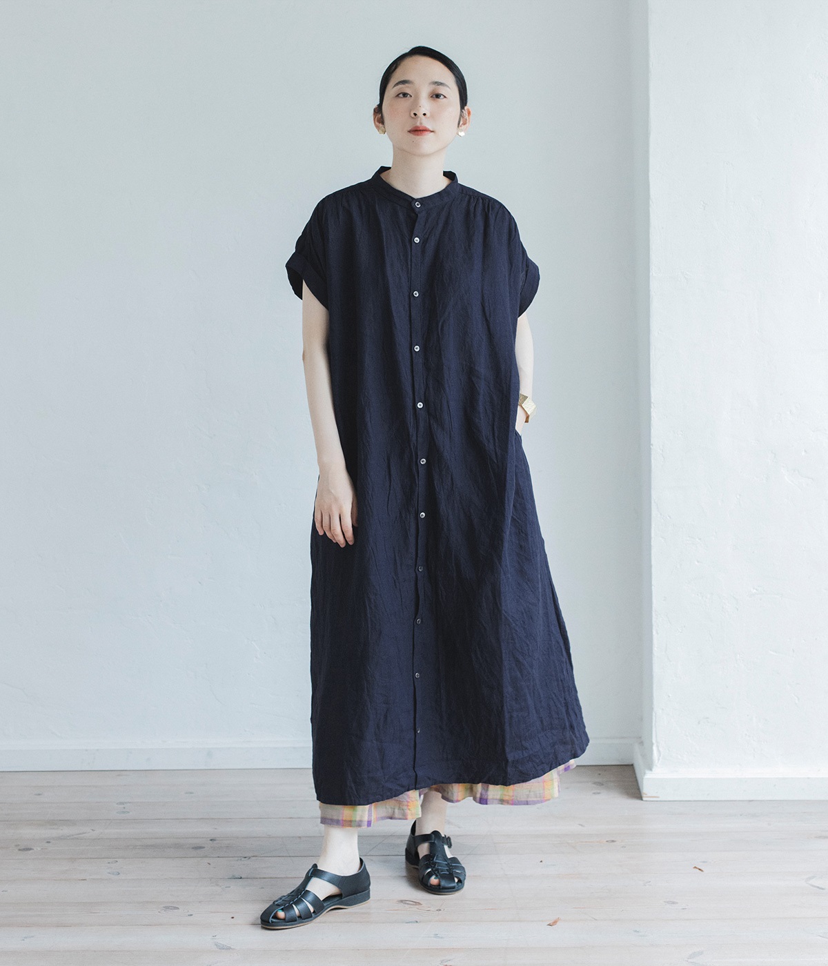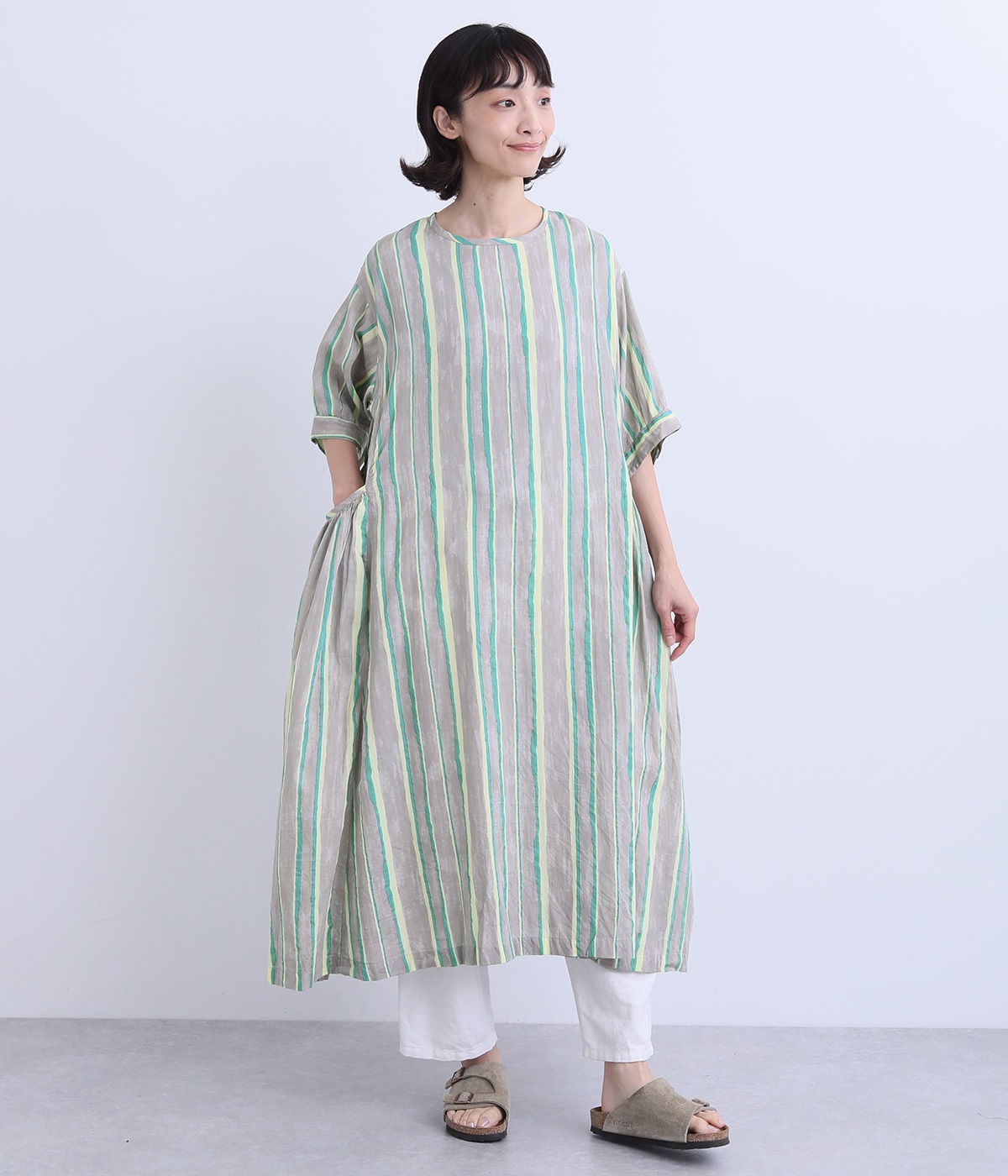 14番手リネンアシンメトリーピンタックギャザーワンピースキナリ×キナリ